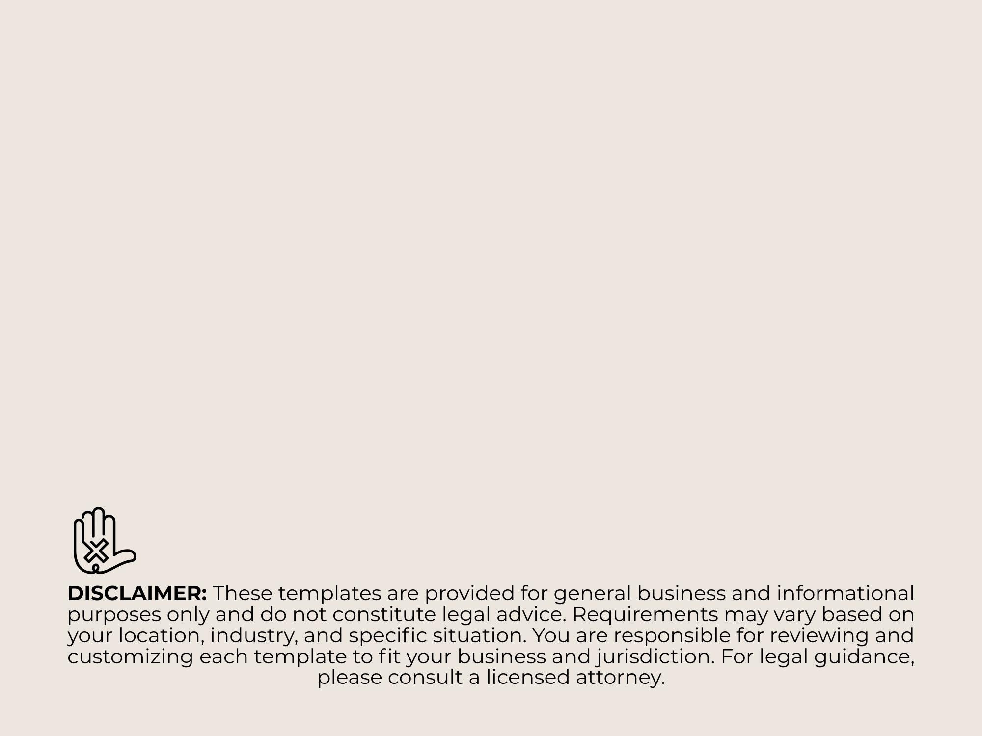 These templates are provided for general business use and informational purposes only and do not constitute legal advice. Requirements vary by location and situation. You are responsible for reviewing and customizing for your business and jurisdiction. For legal guidance, consult a licensed attorney.