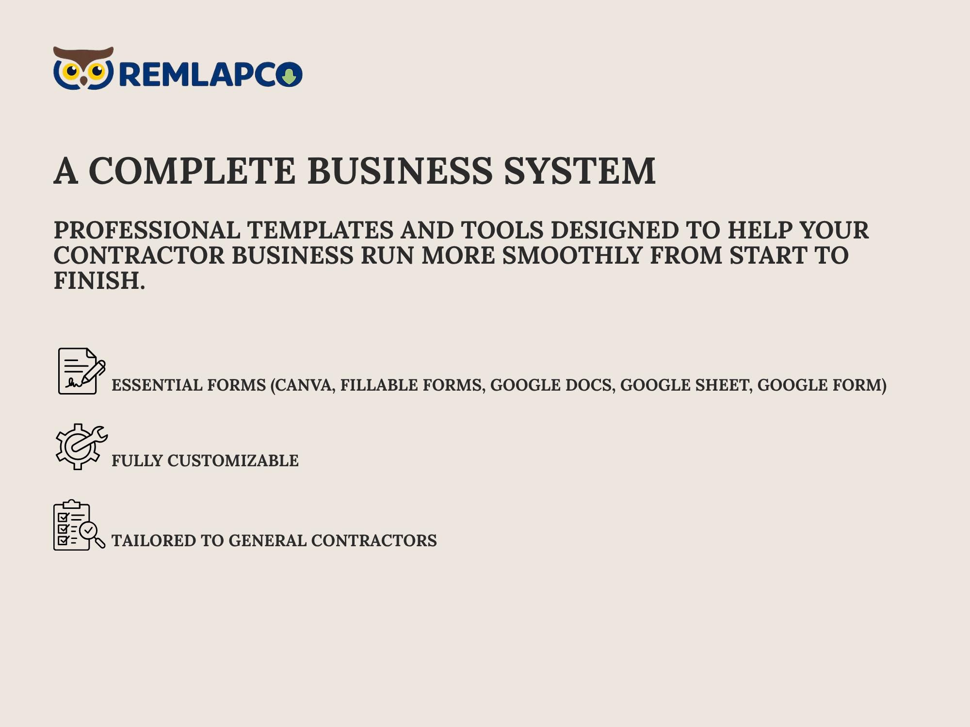 The full RemlapCo contractor system: everything in Pro plus a CRM dashboard, review forms, and a message library to keep communication consistent and professional.