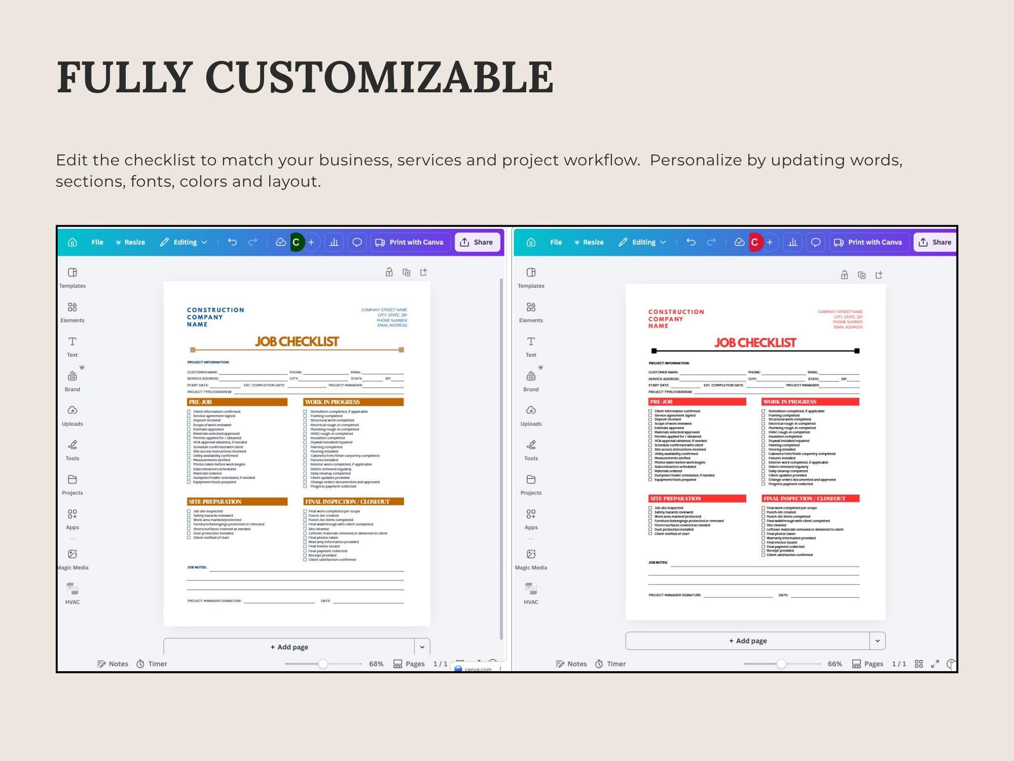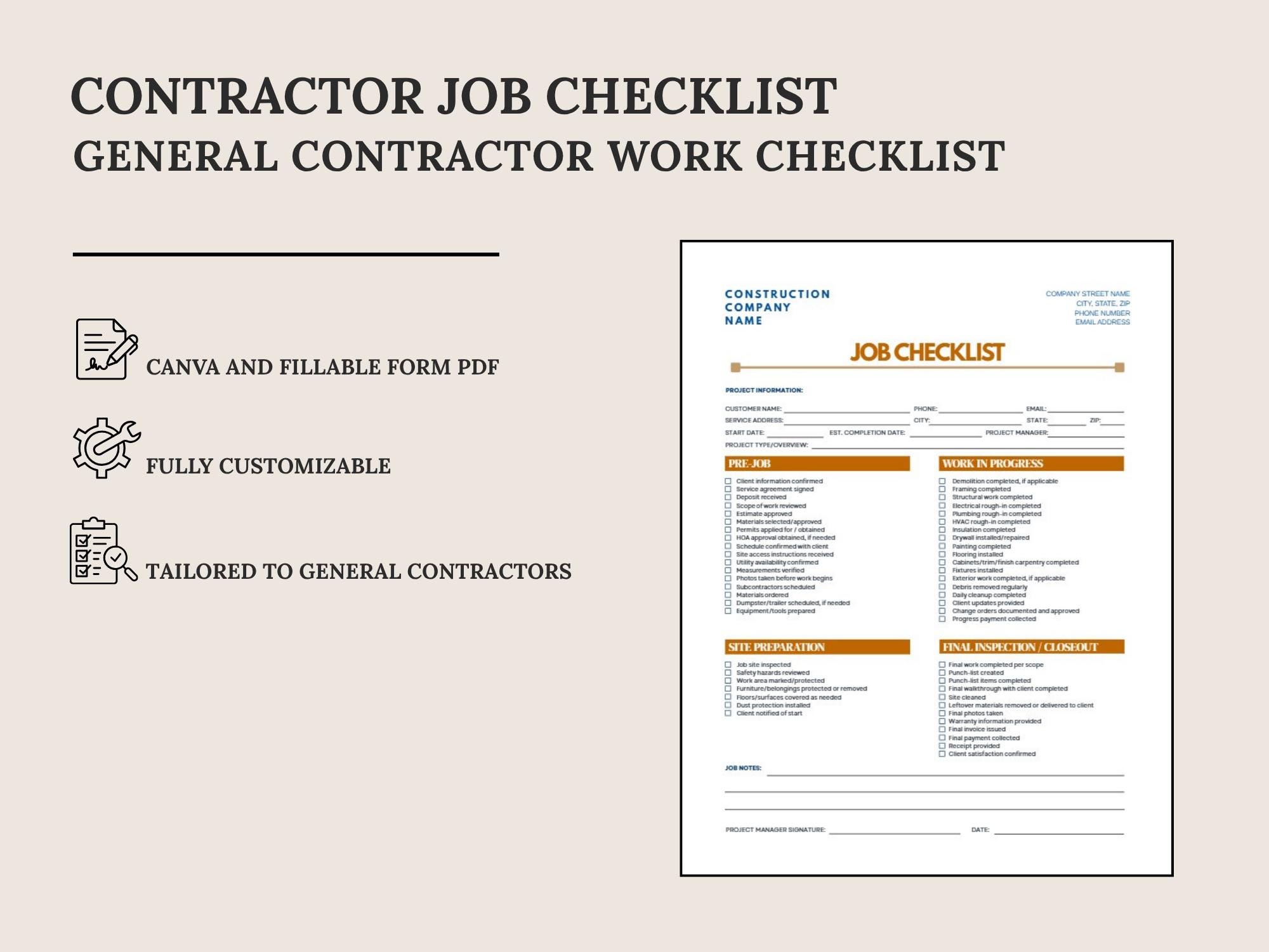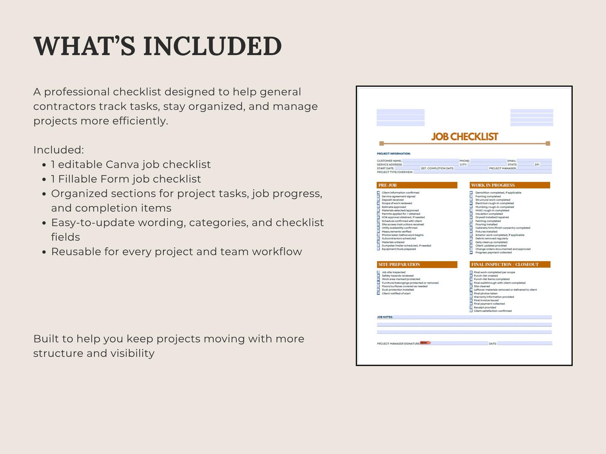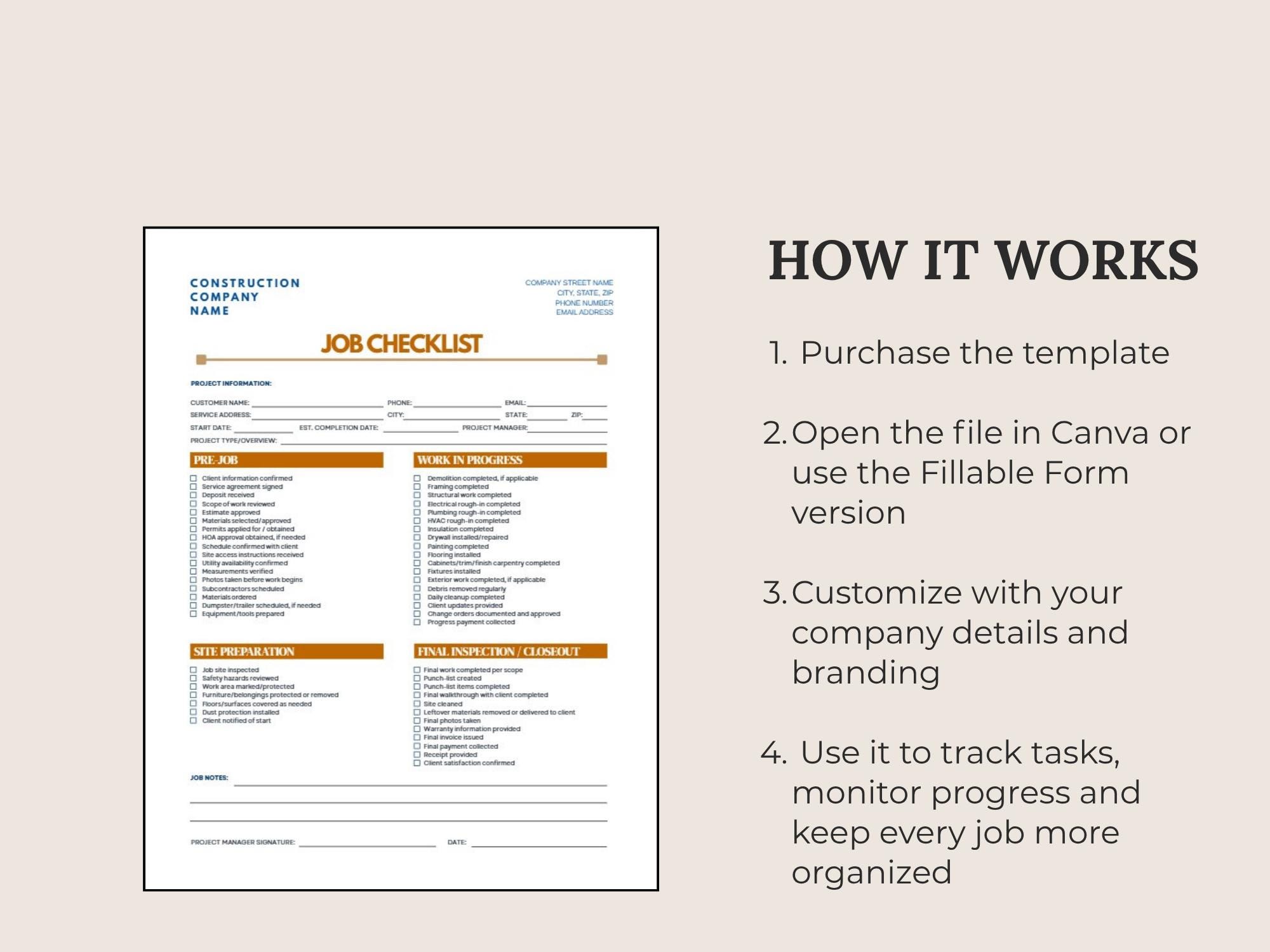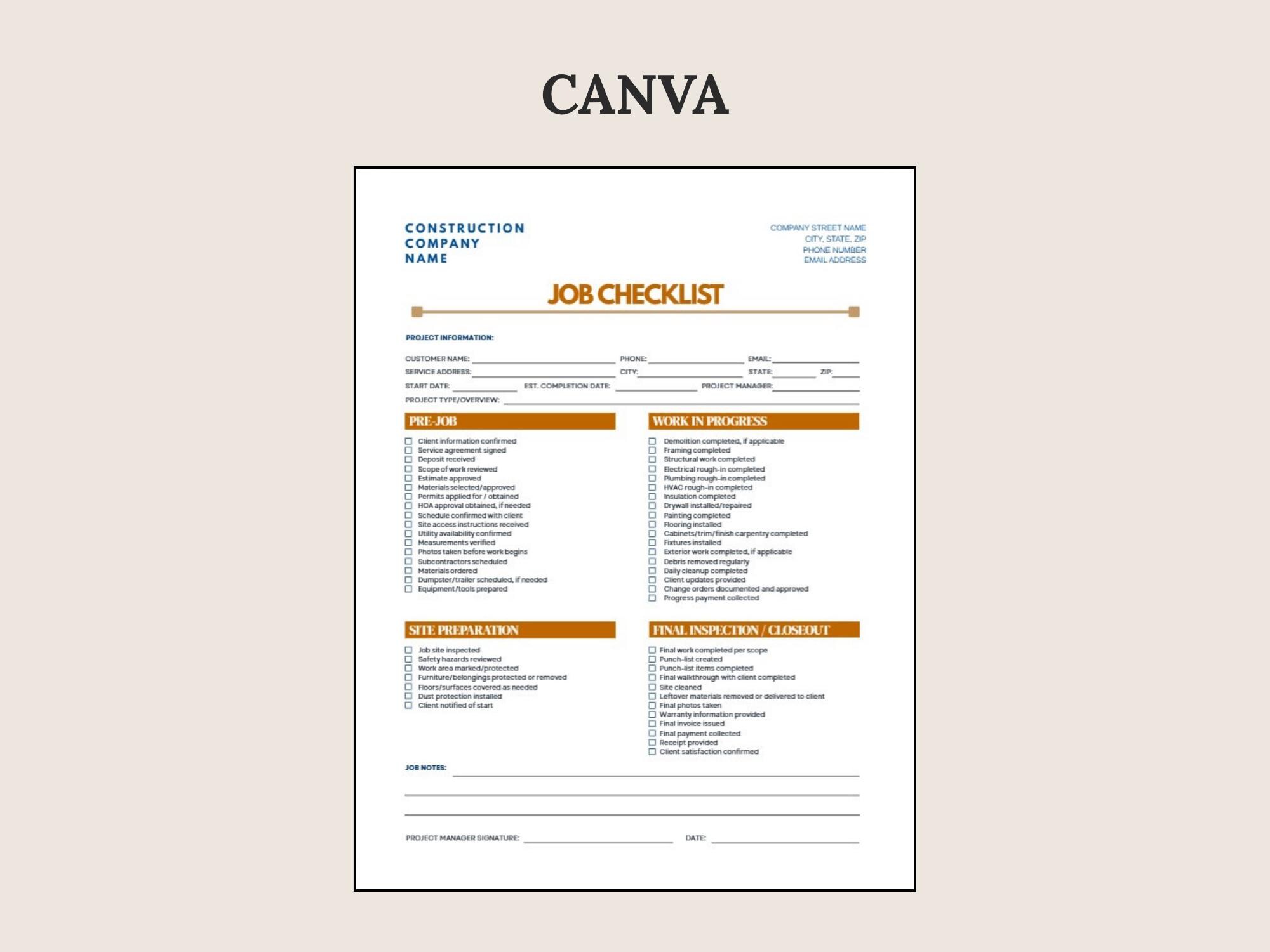 Stay consistent on every project with a simple Job Checklist for prep, work steps, and closeout. Designed to help you standardize quality checks and reduce missed details.Formats included: Canva + Fillable PDF