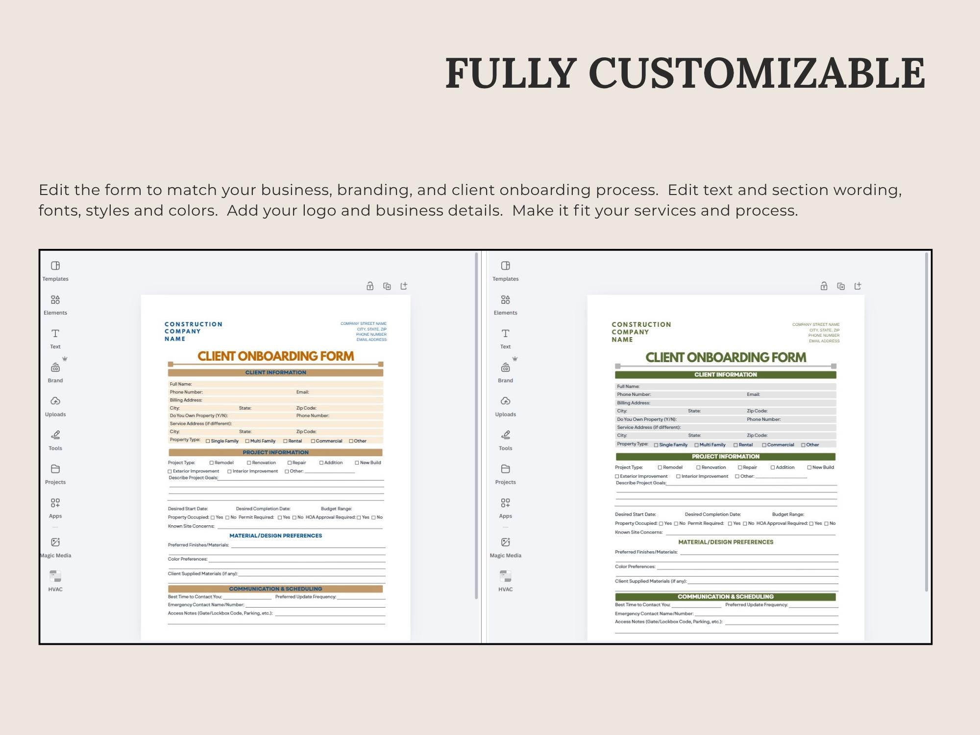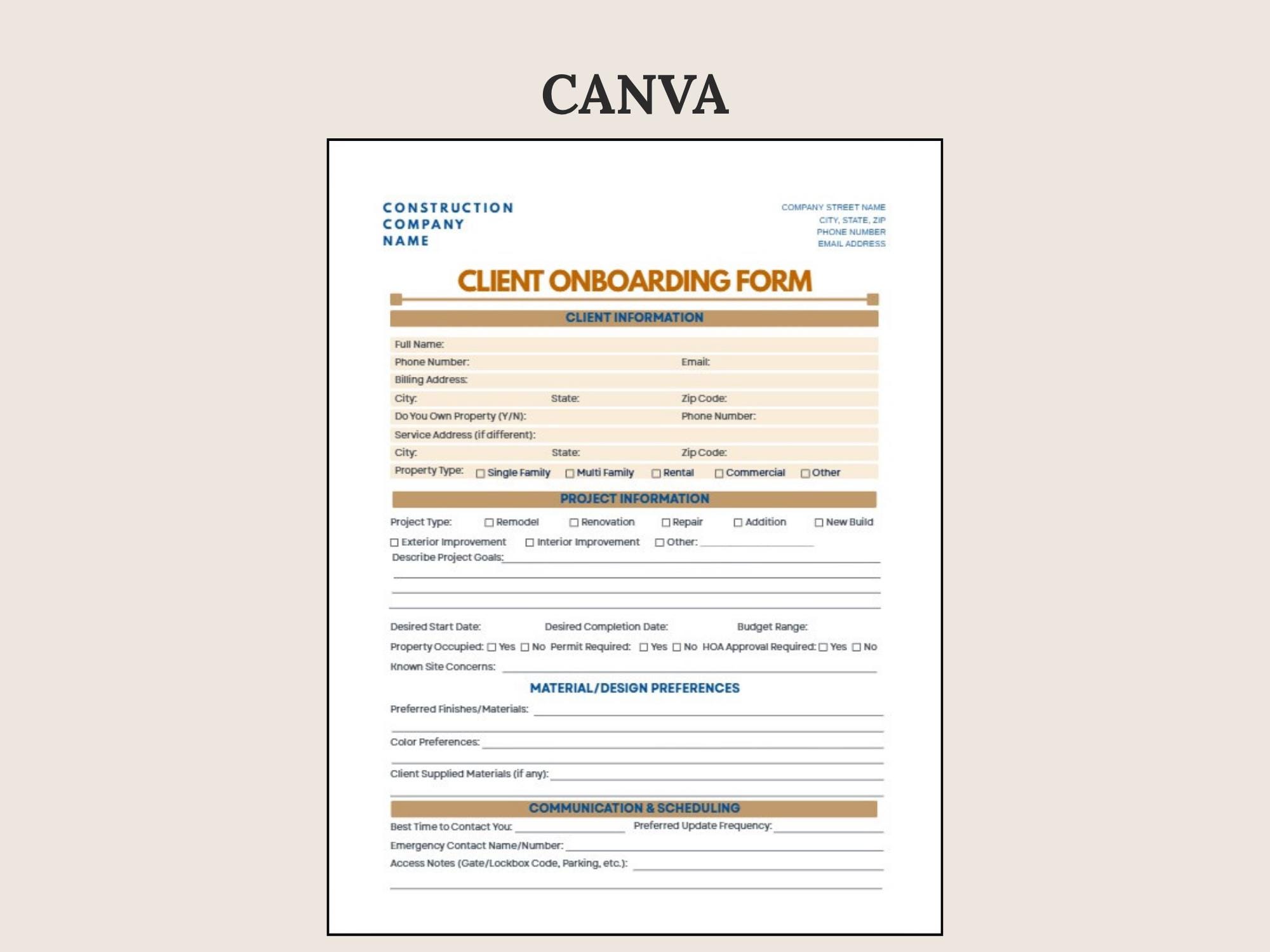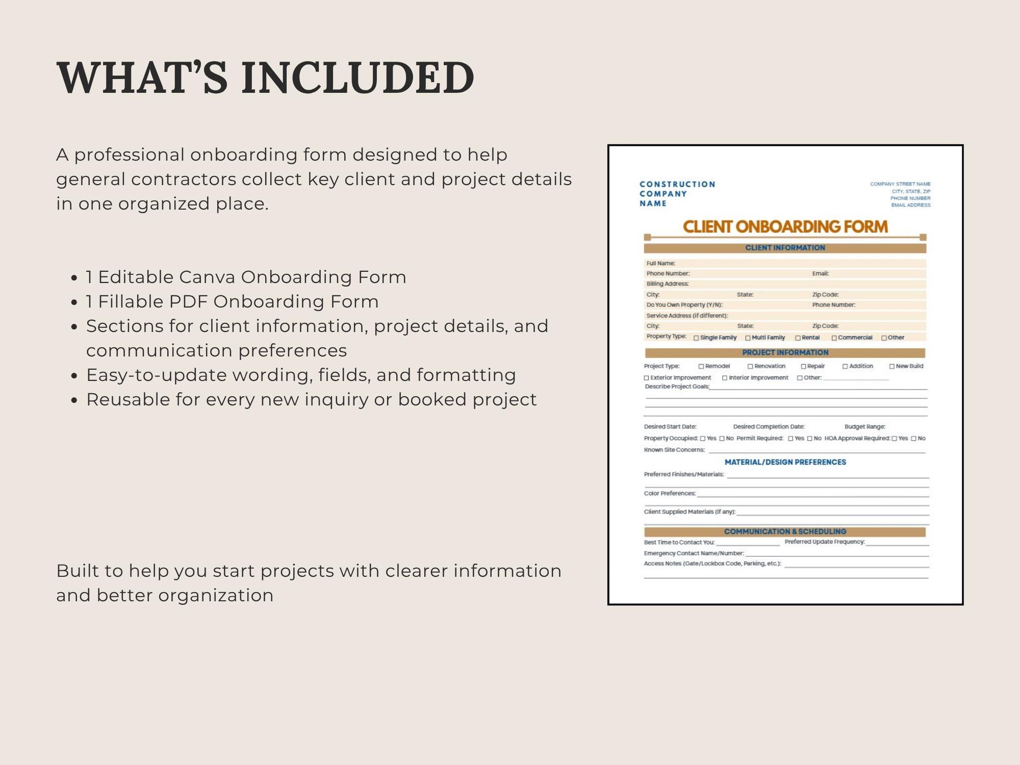 A modern Client Onboarding Form for general contractors to collect project details, address, contact info, access notes, and expectations up front. Use the fillable PDF immediately or customize branding in Canva.