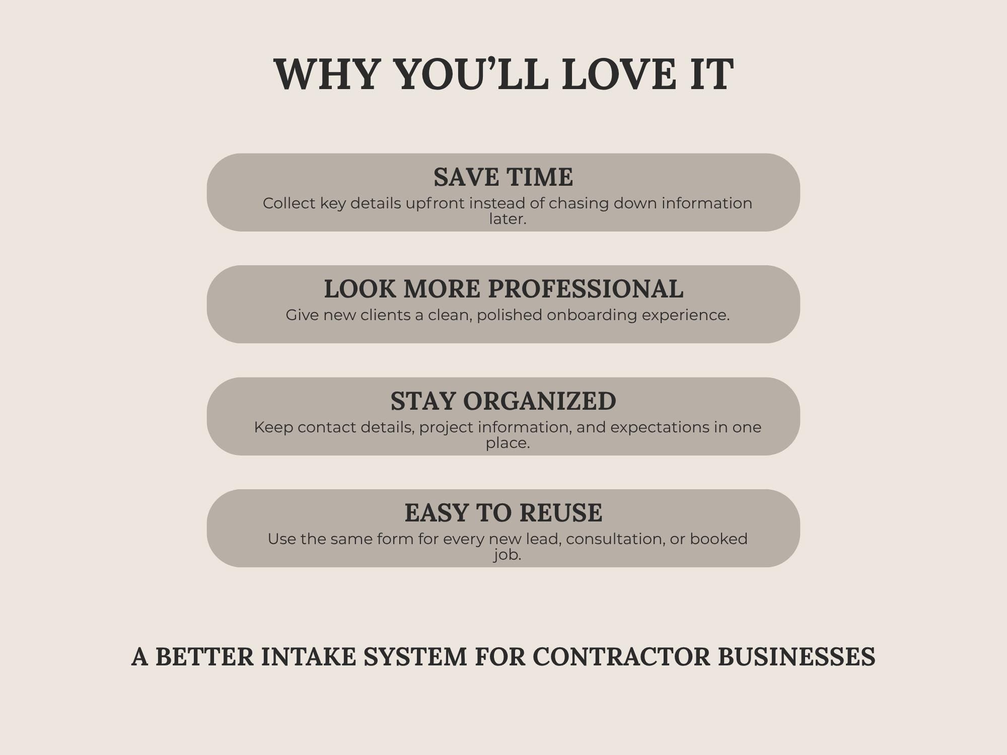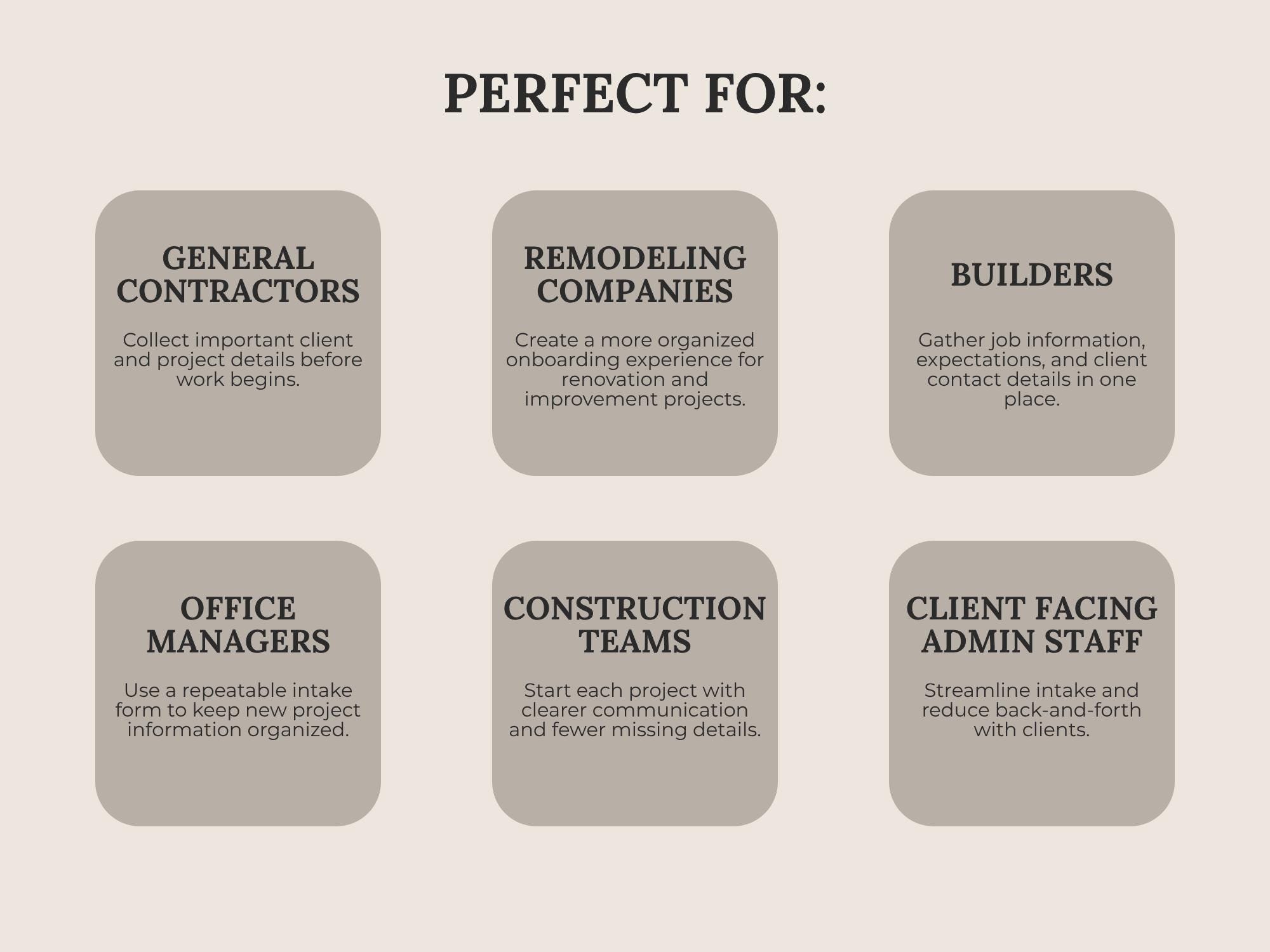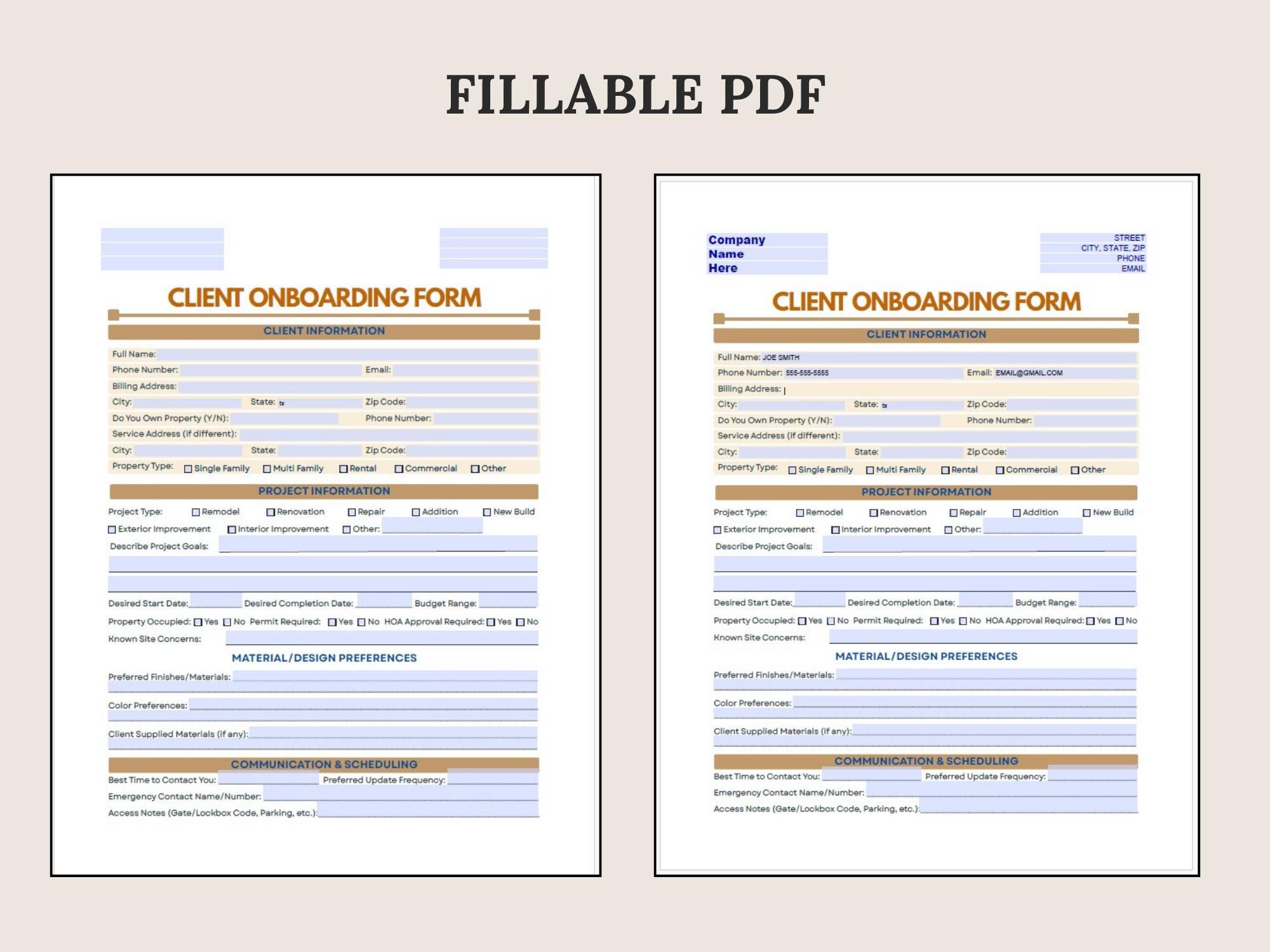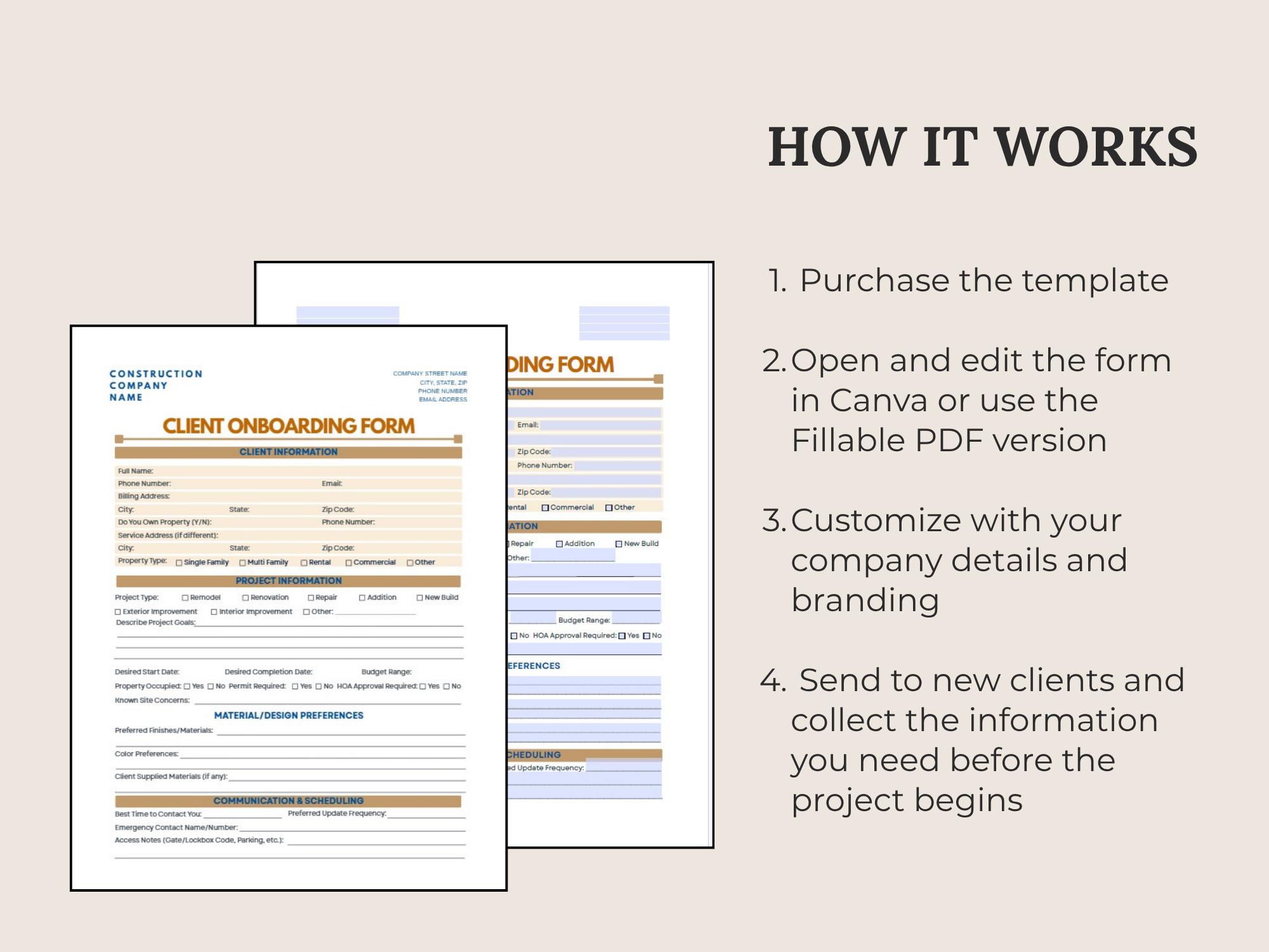 A modern Client Onboarding Form for general contractors to collect project details, address, contact info, access notes, and expectations up front. Use the fillable PDF immediately or customize branding in Canva.