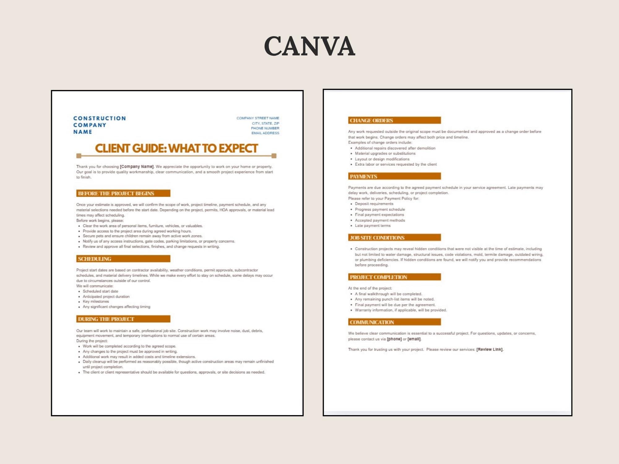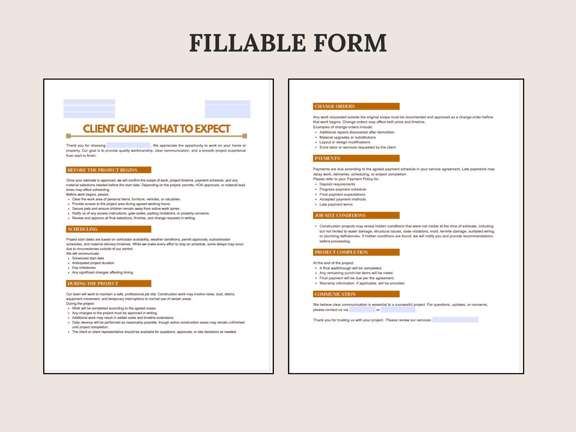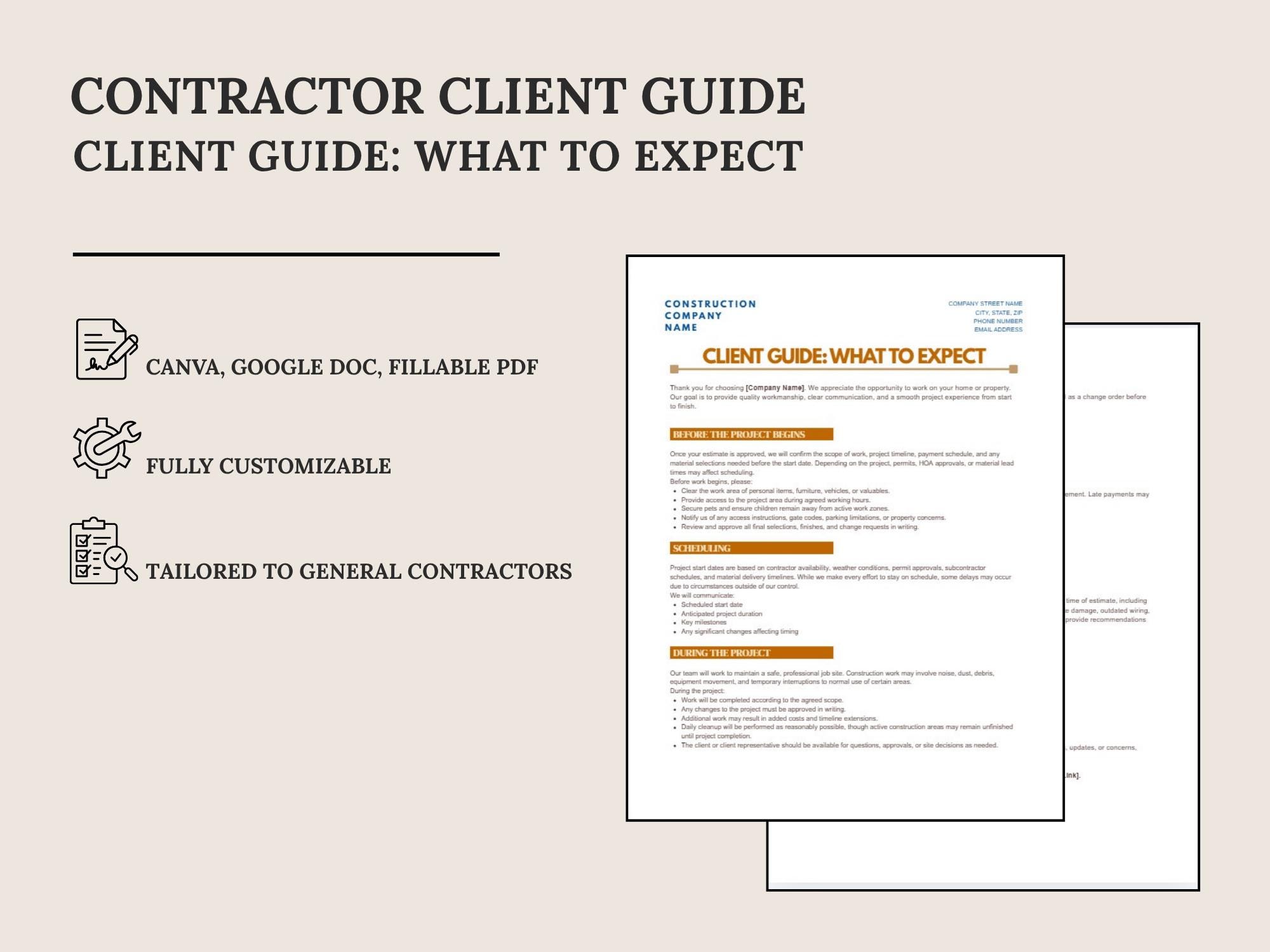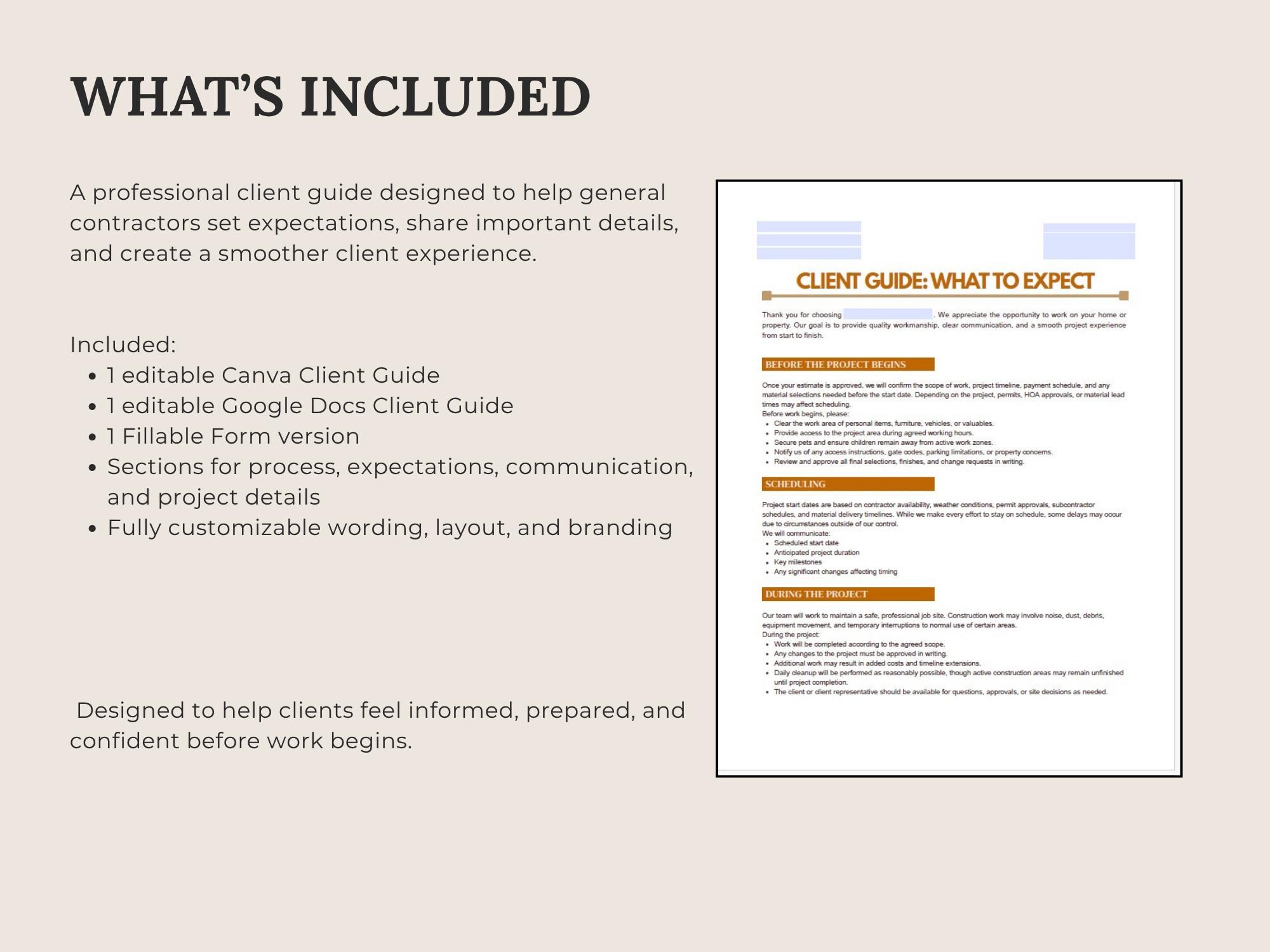 Set expectations and reduce misunderstandings with a What to Expect guide for contractor projects. Covers scheduling, site access, communication, change requests, and completion steps—formatted to look modern and professional.