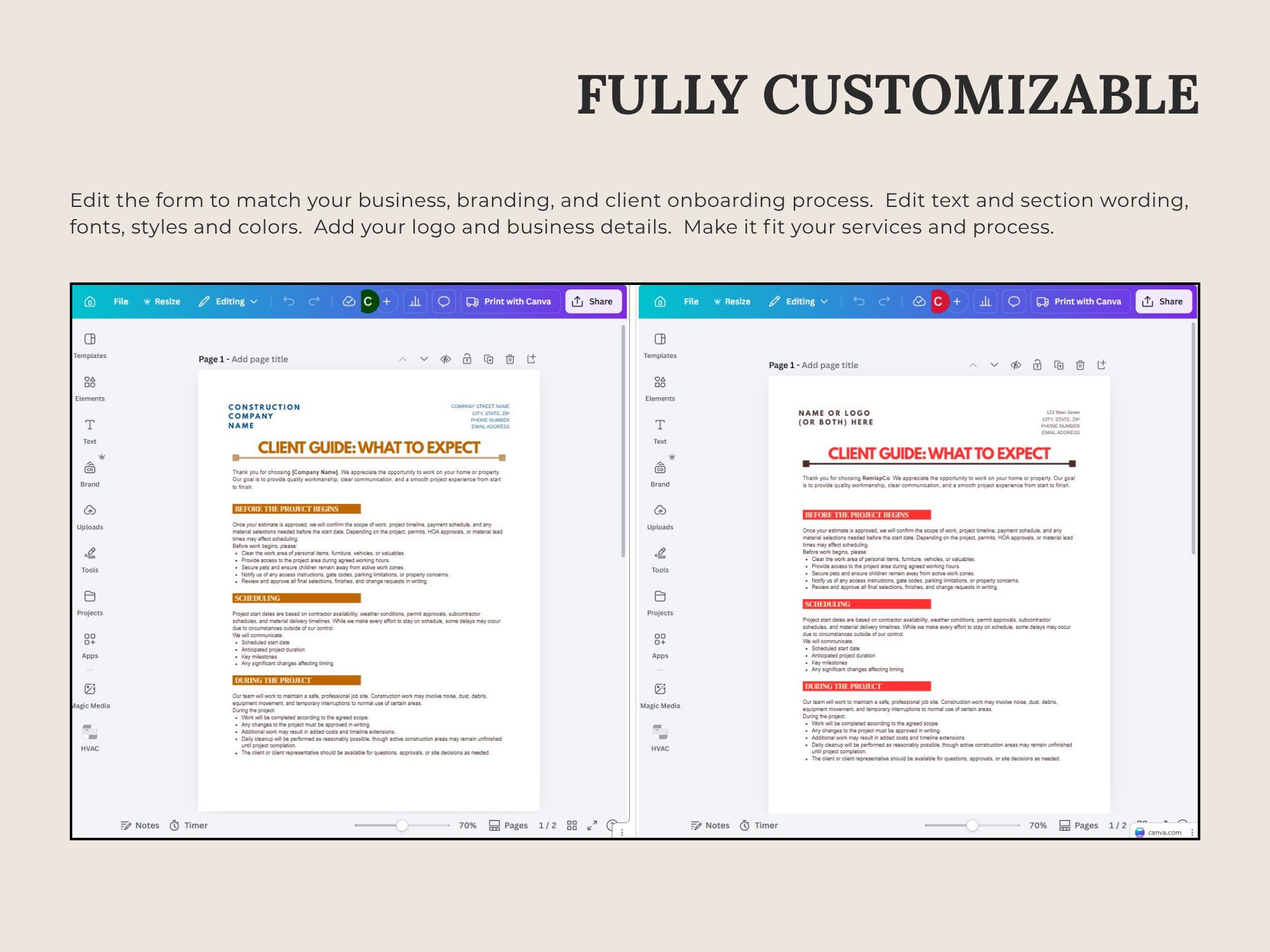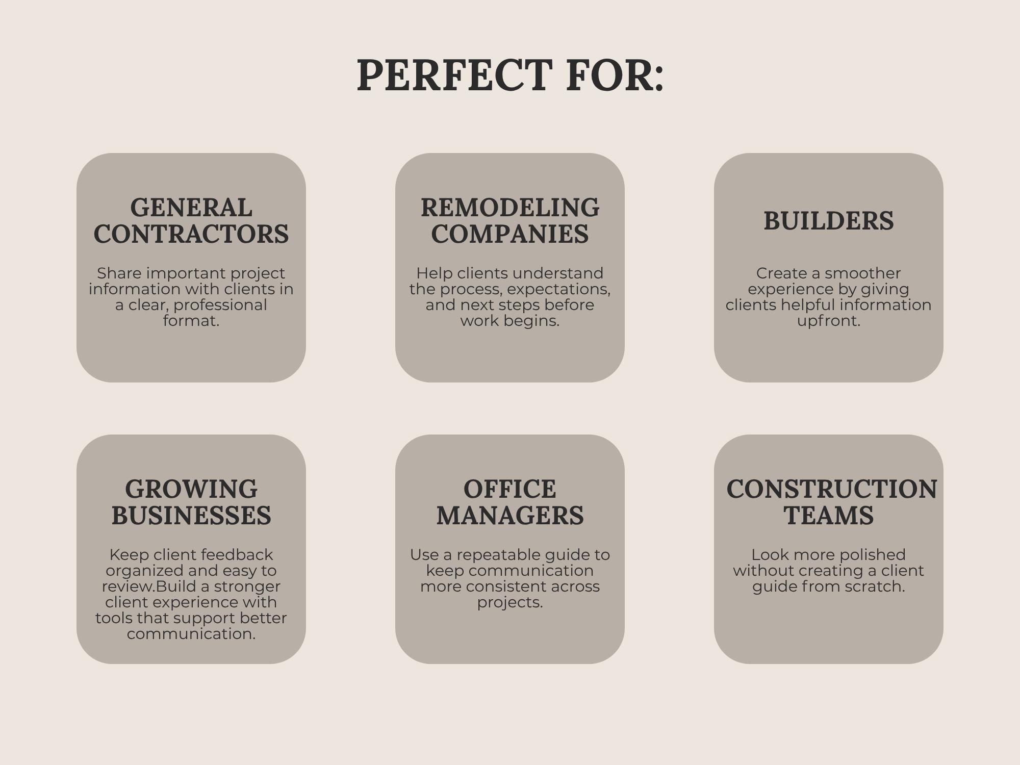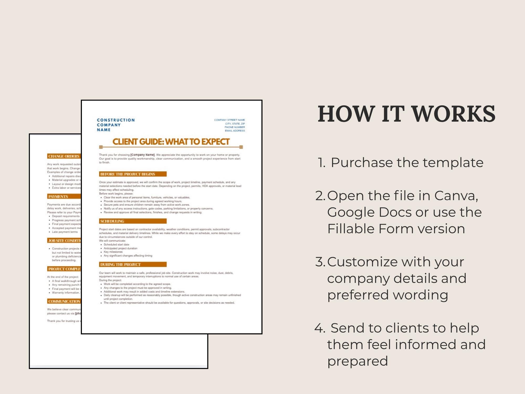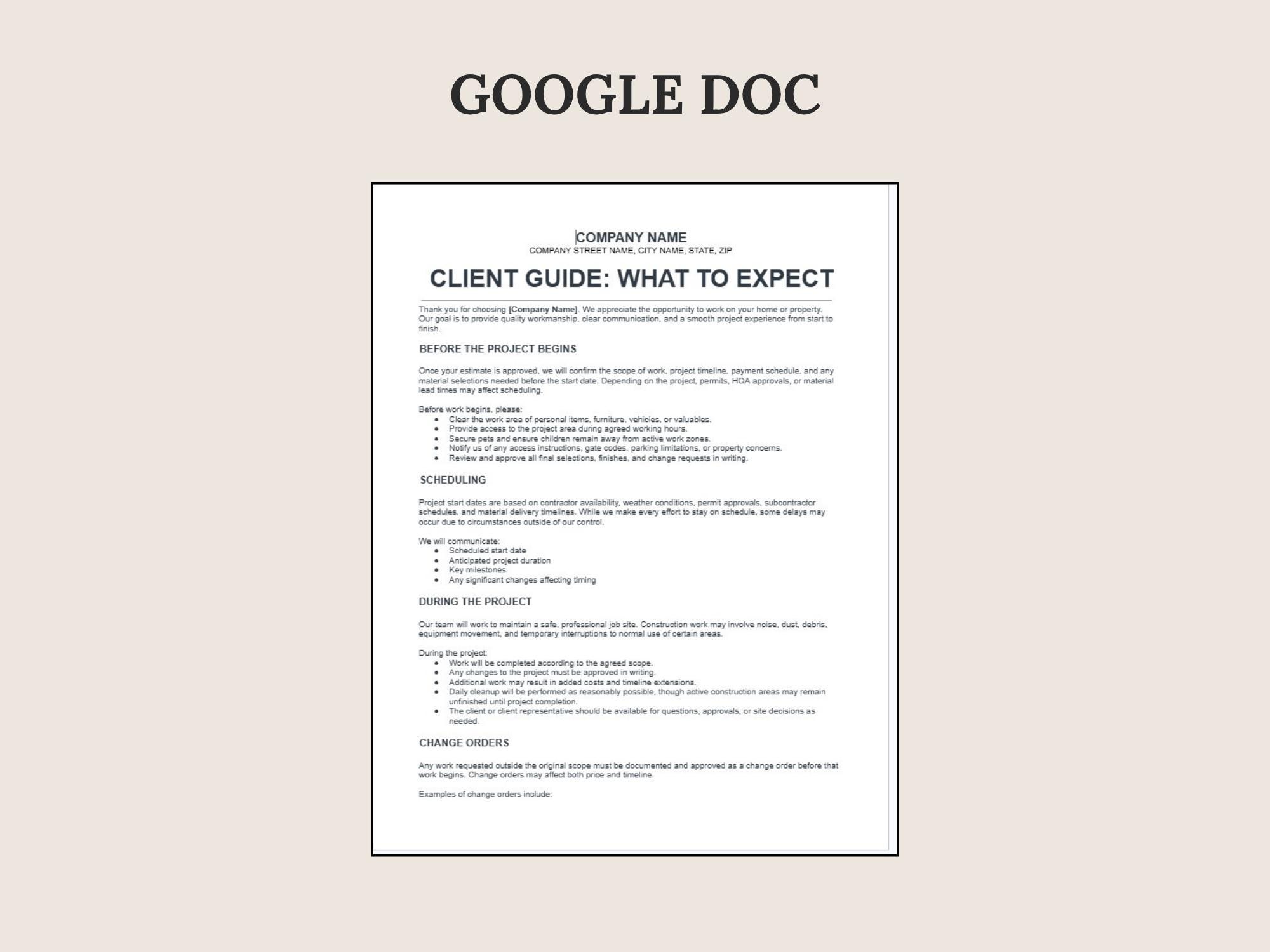 Set expectations and reduce misunderstandings with a What to Expect guide for contractor projects. Covers scheduling, site access, communication, change requests, and completion steps—formatted to look modern and professional.