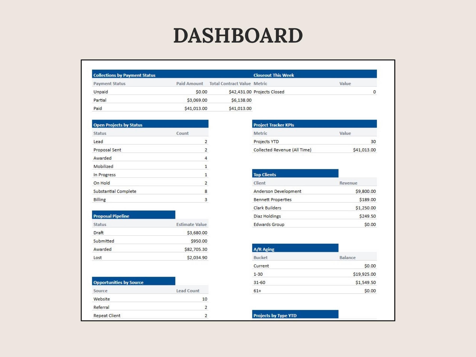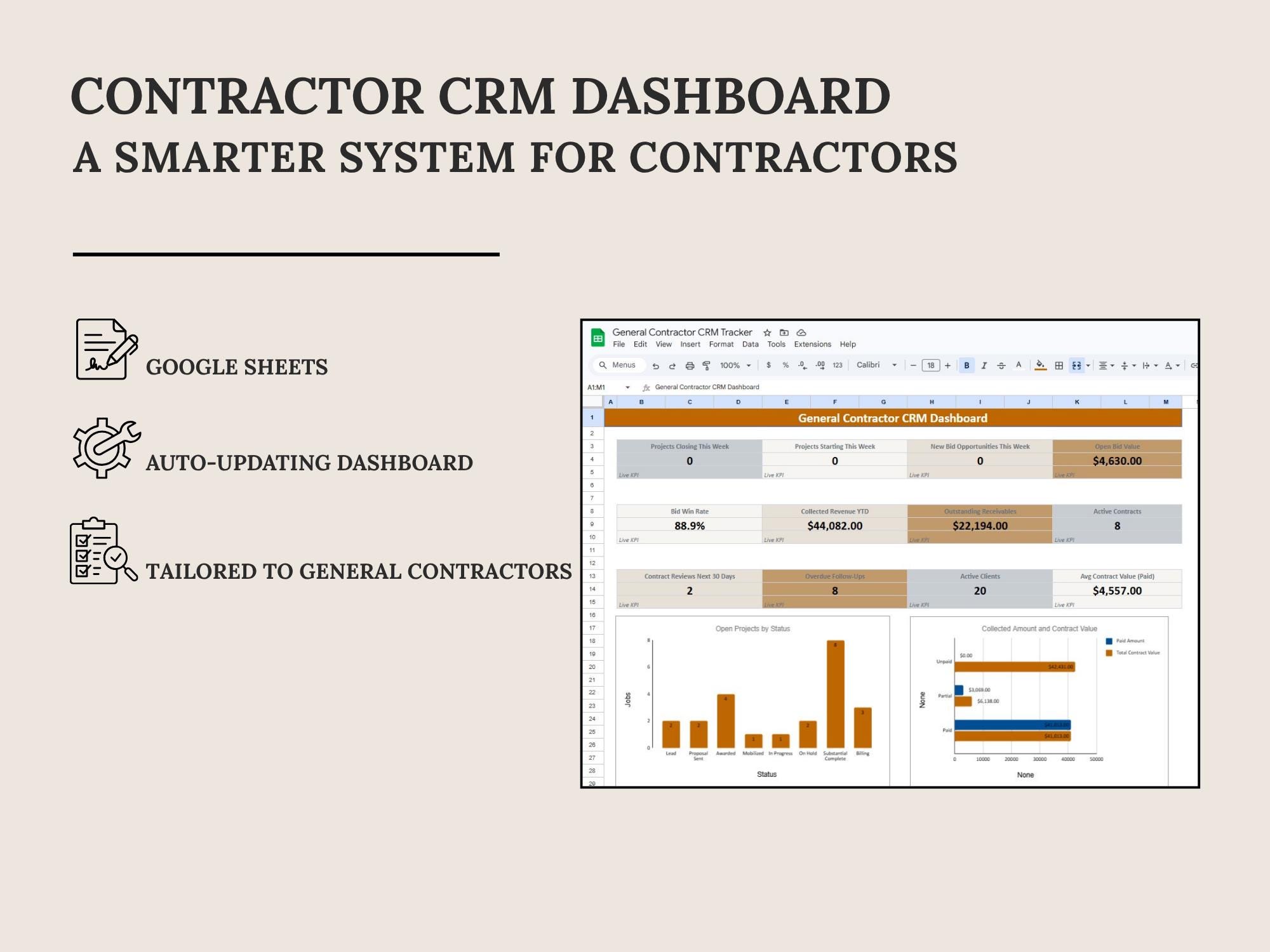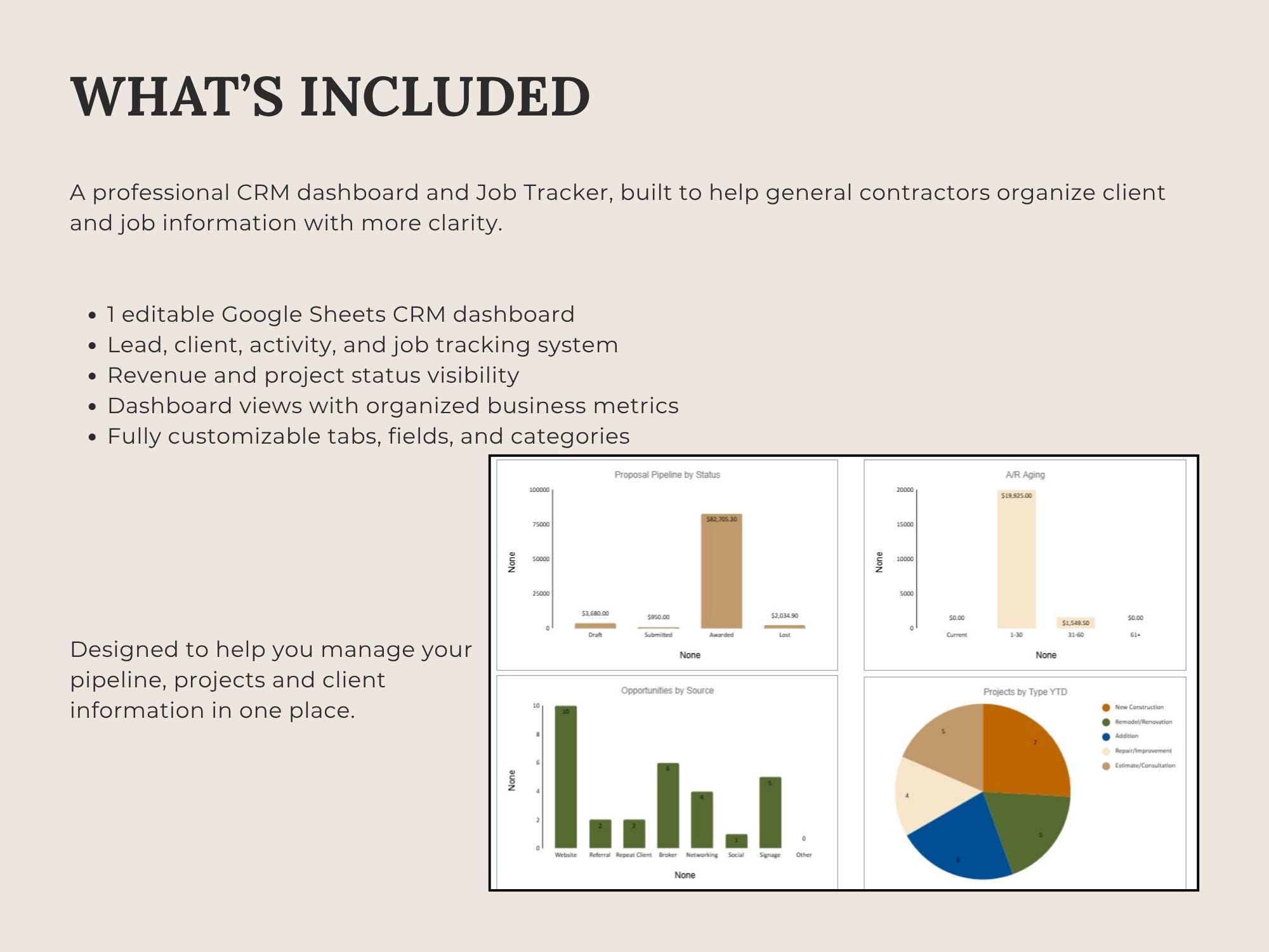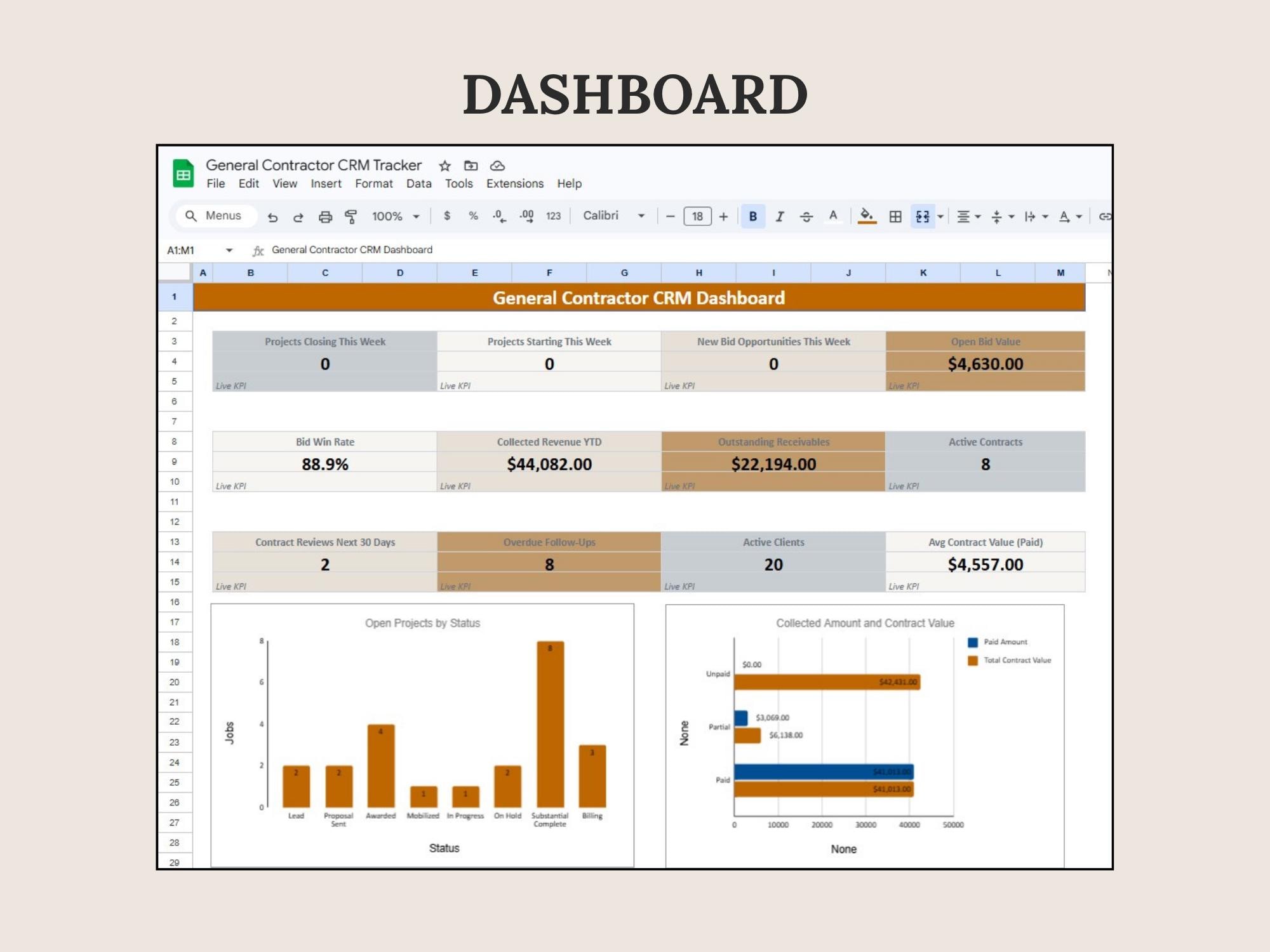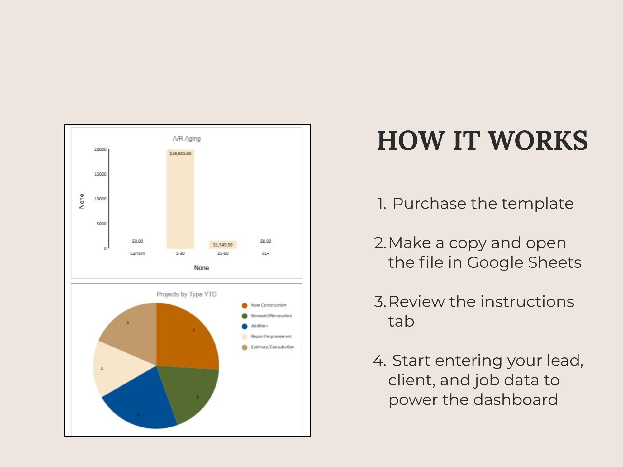 Track leads, estimates, scheduled work, invoices, and paid status in one place. This CRM Dashboard is built in Google Sheets for a lightweight system that keeps your pipeline and revenue visible.