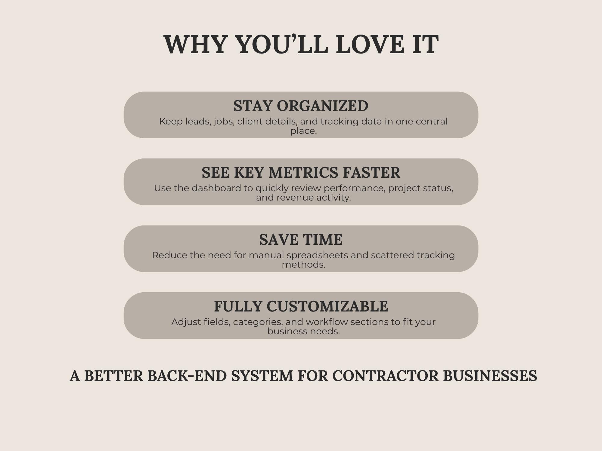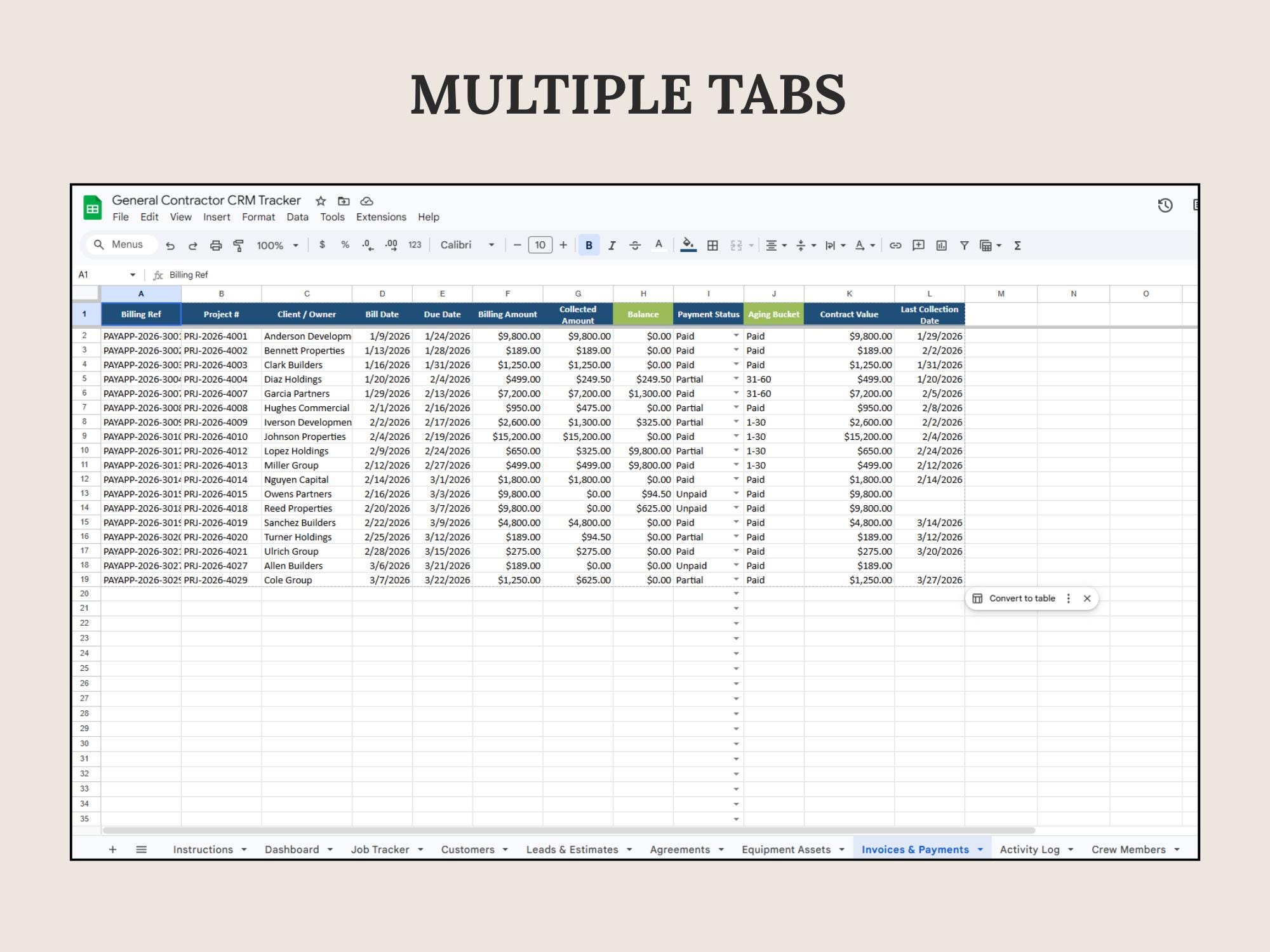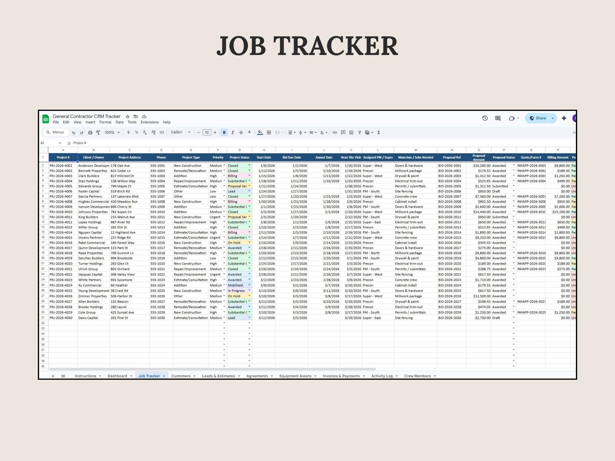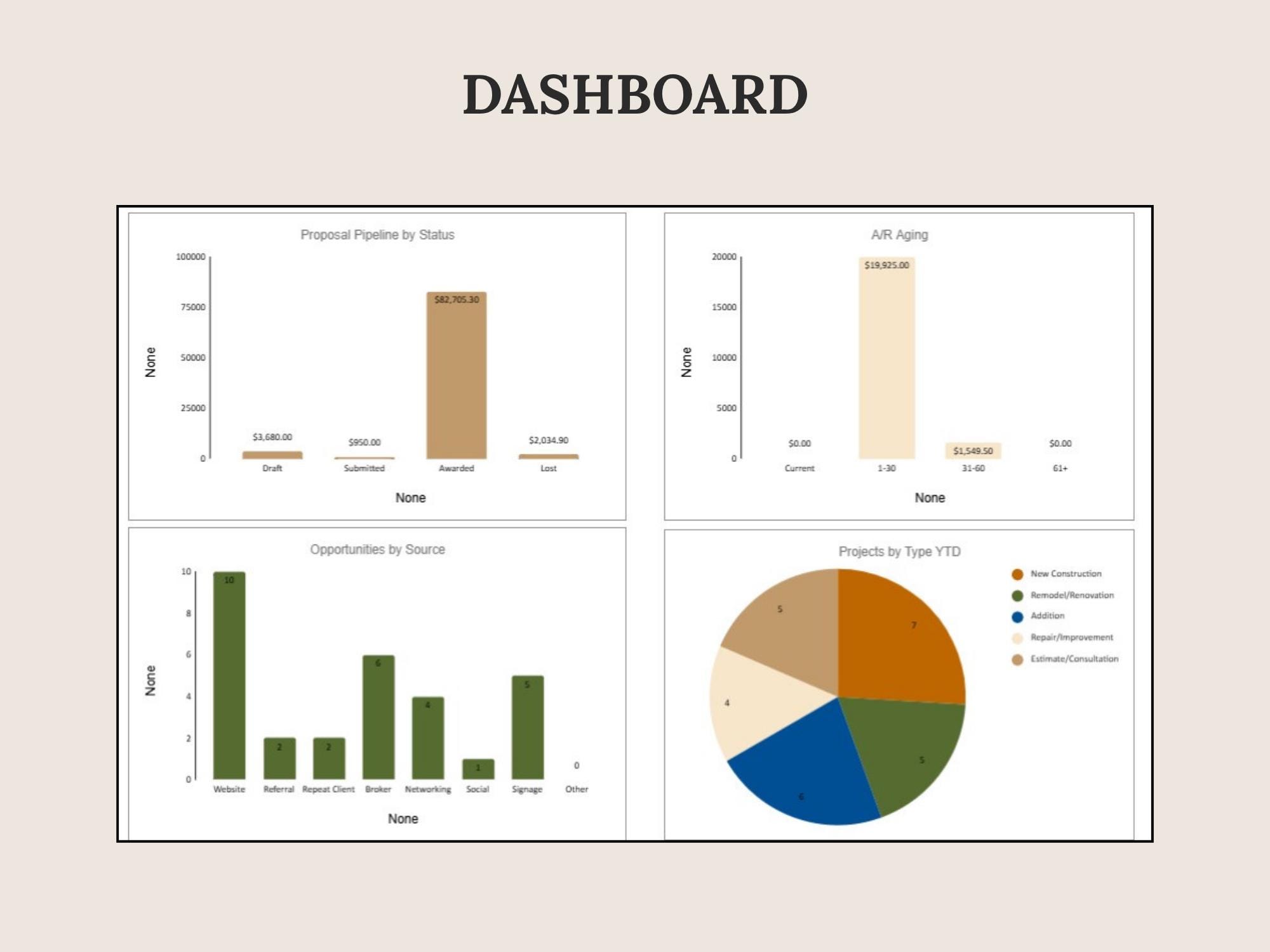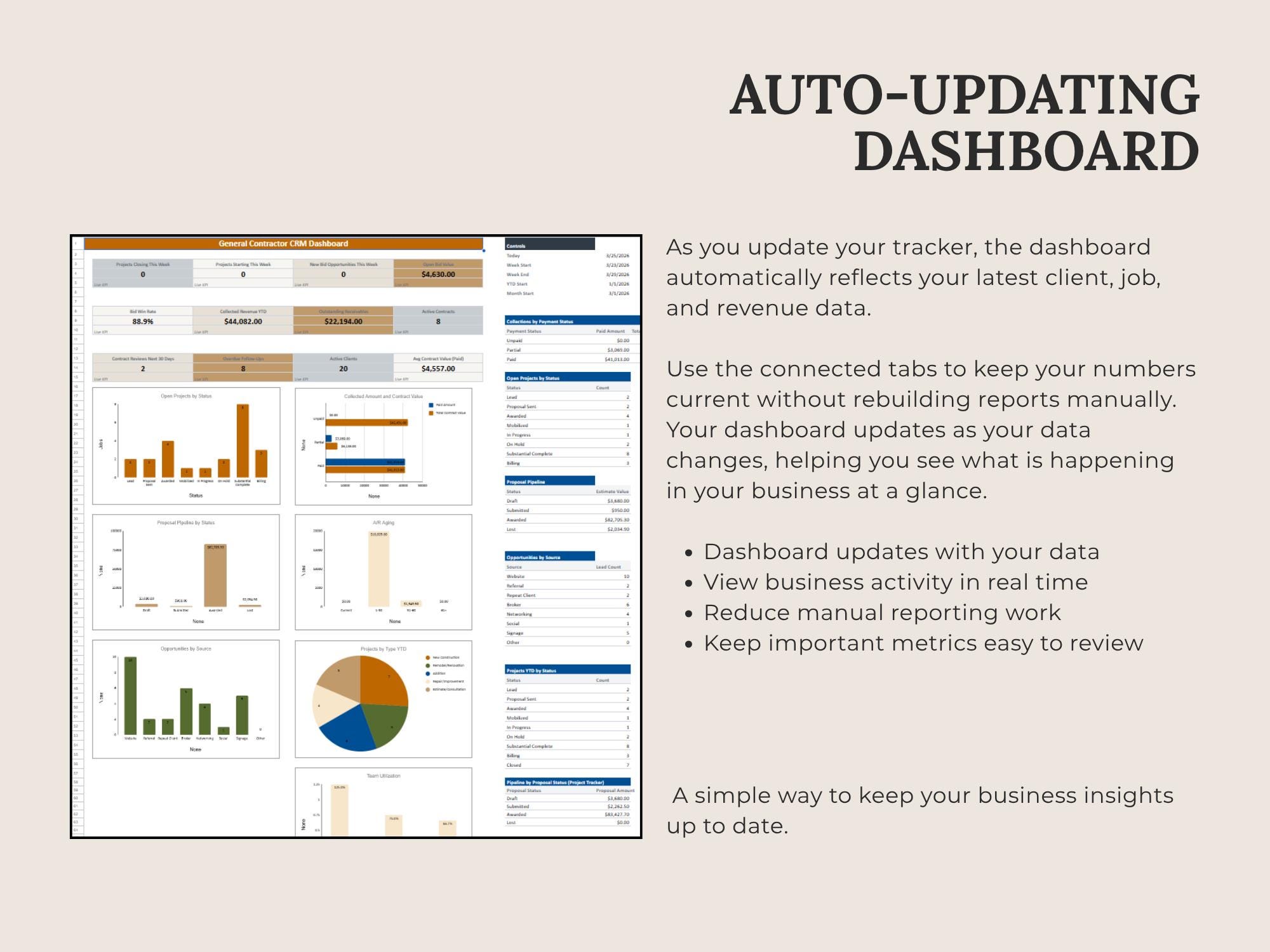 Track leads, estimates, scheduled work, invoices, and paid status in one place. This CRM Dashboard is built in Google Sheets for a lightweight system that keeps your pipeline and revenue visible.