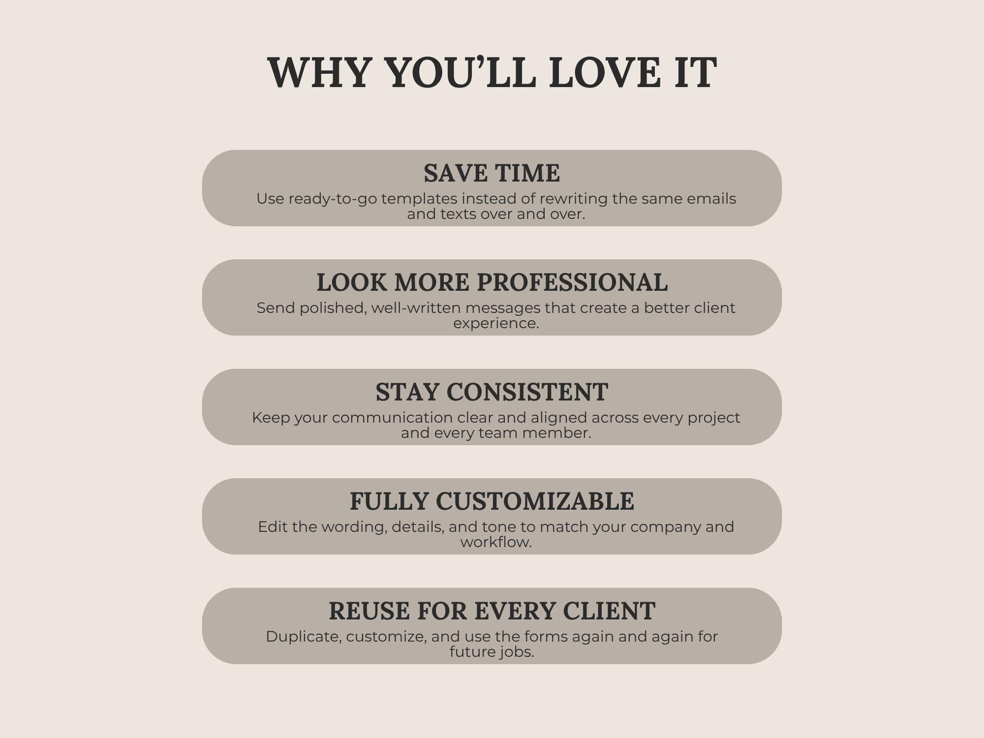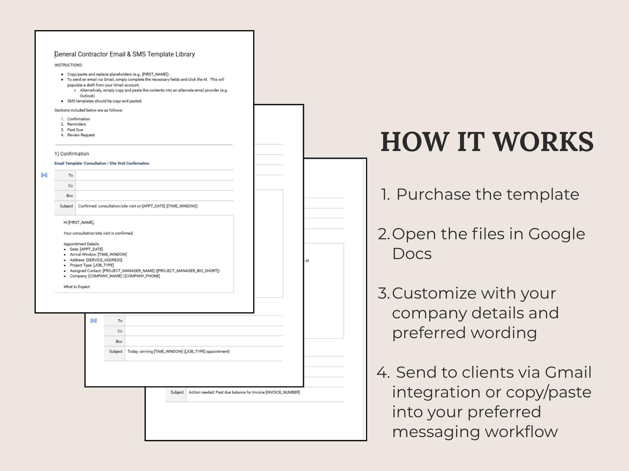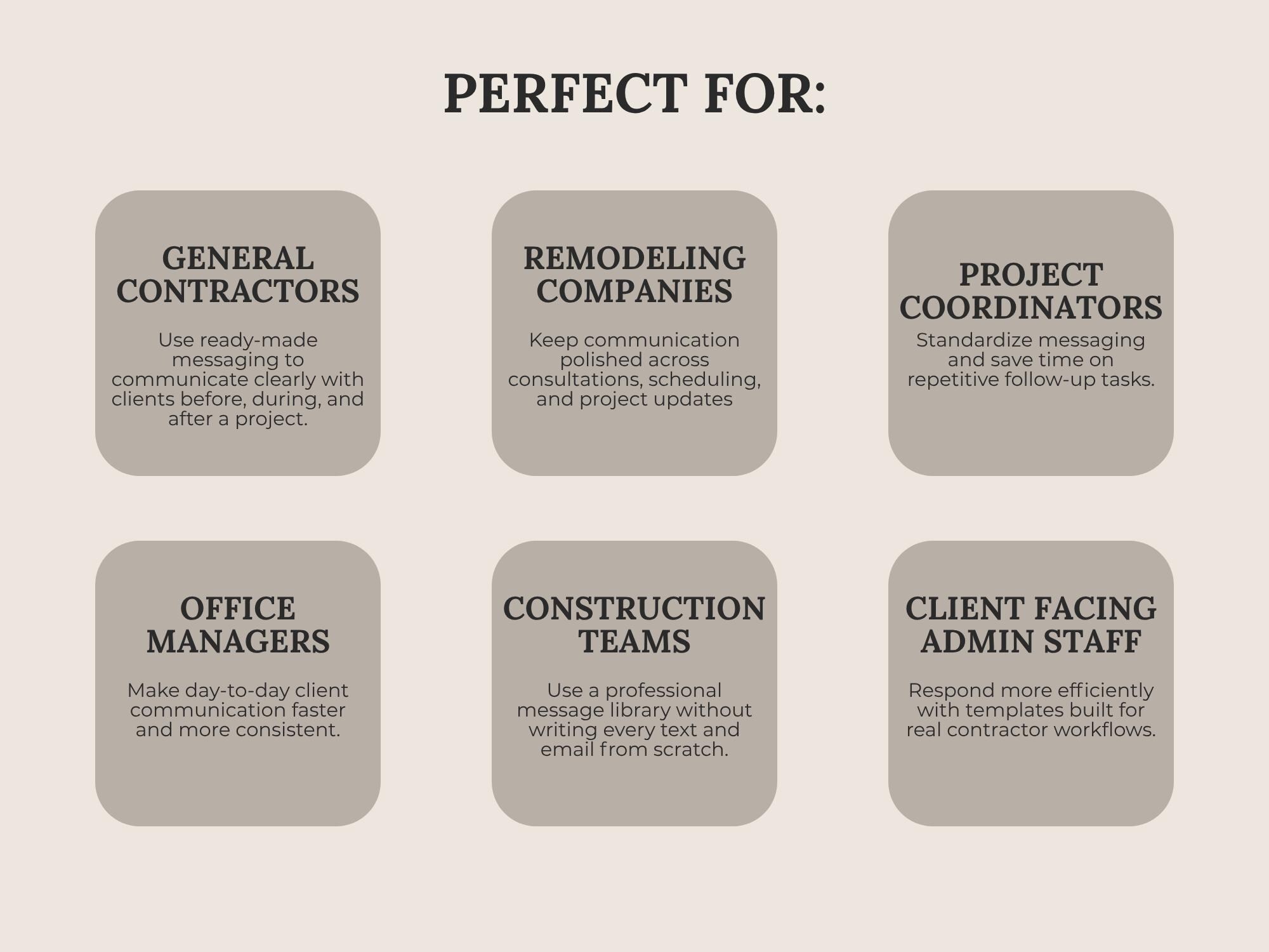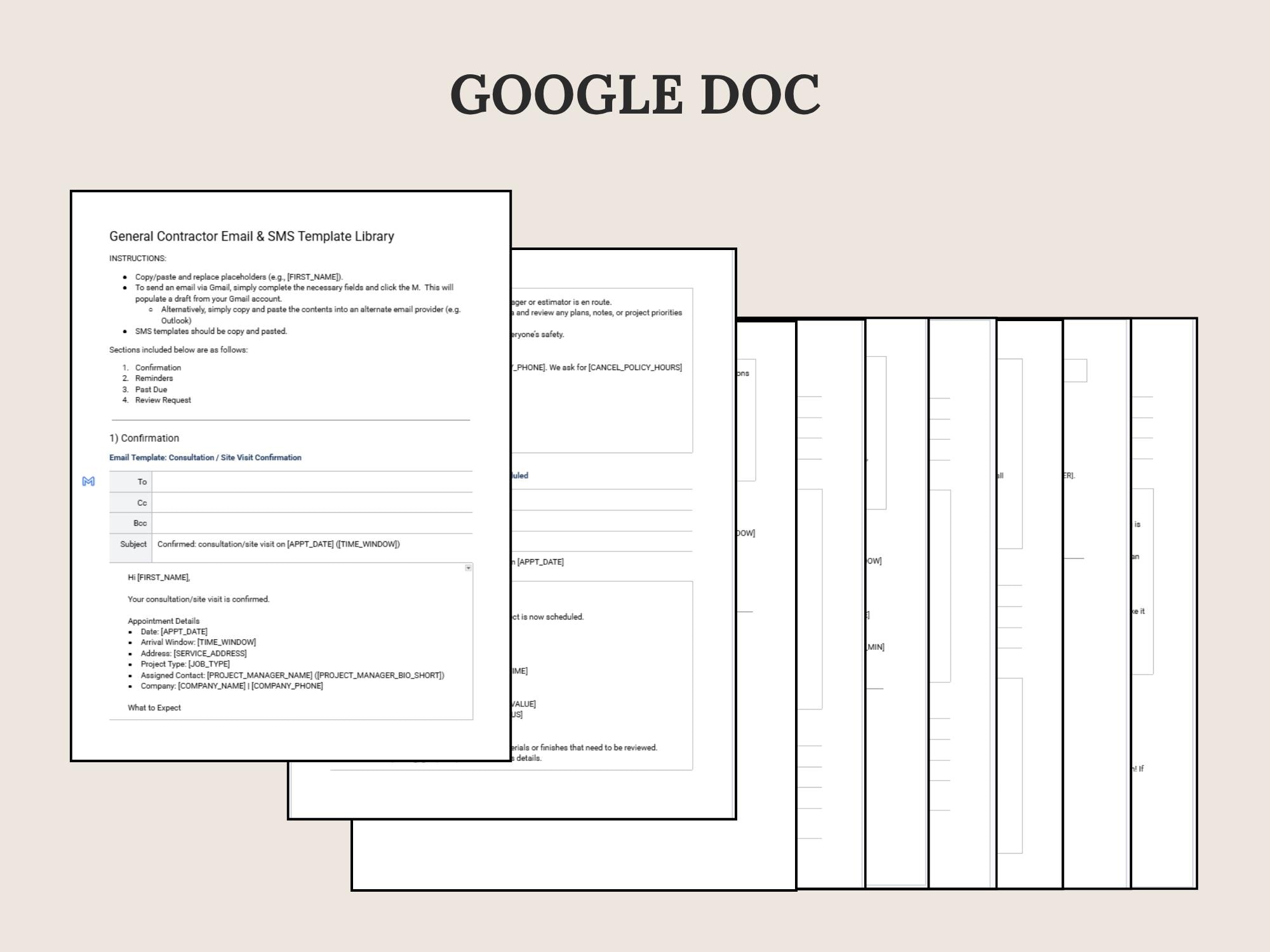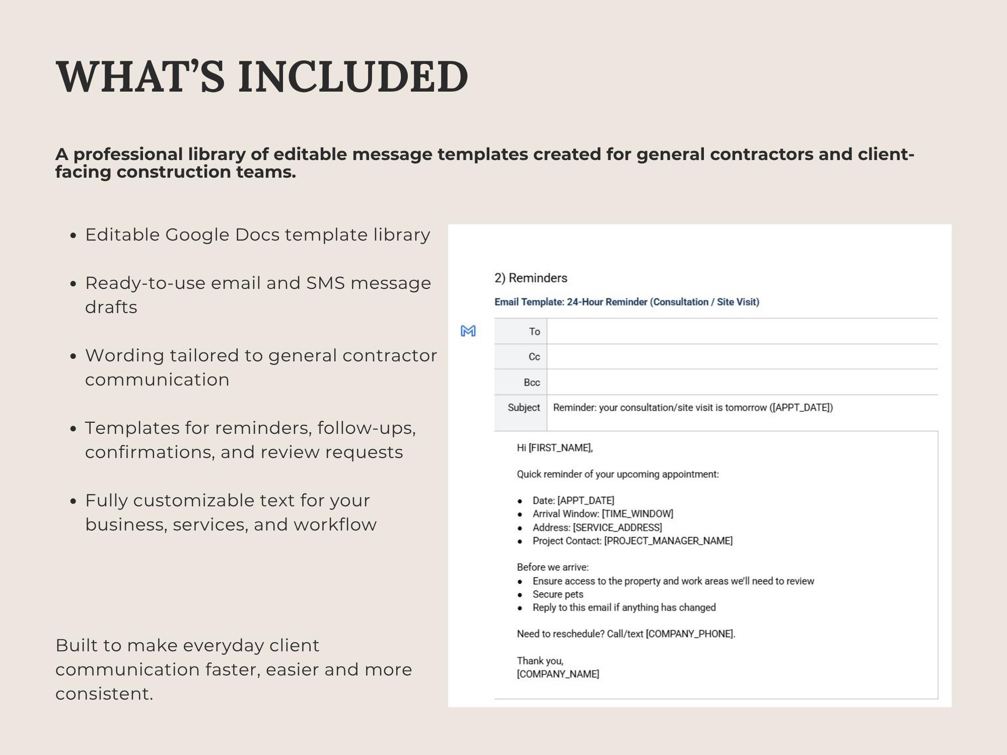 A ready-to-copy library of contractor email and SMS messages for scheduling updates, reminders, project communications, payment follow-ups, and review requests—delivered as a Google Doc so you can copy/paste quickly.