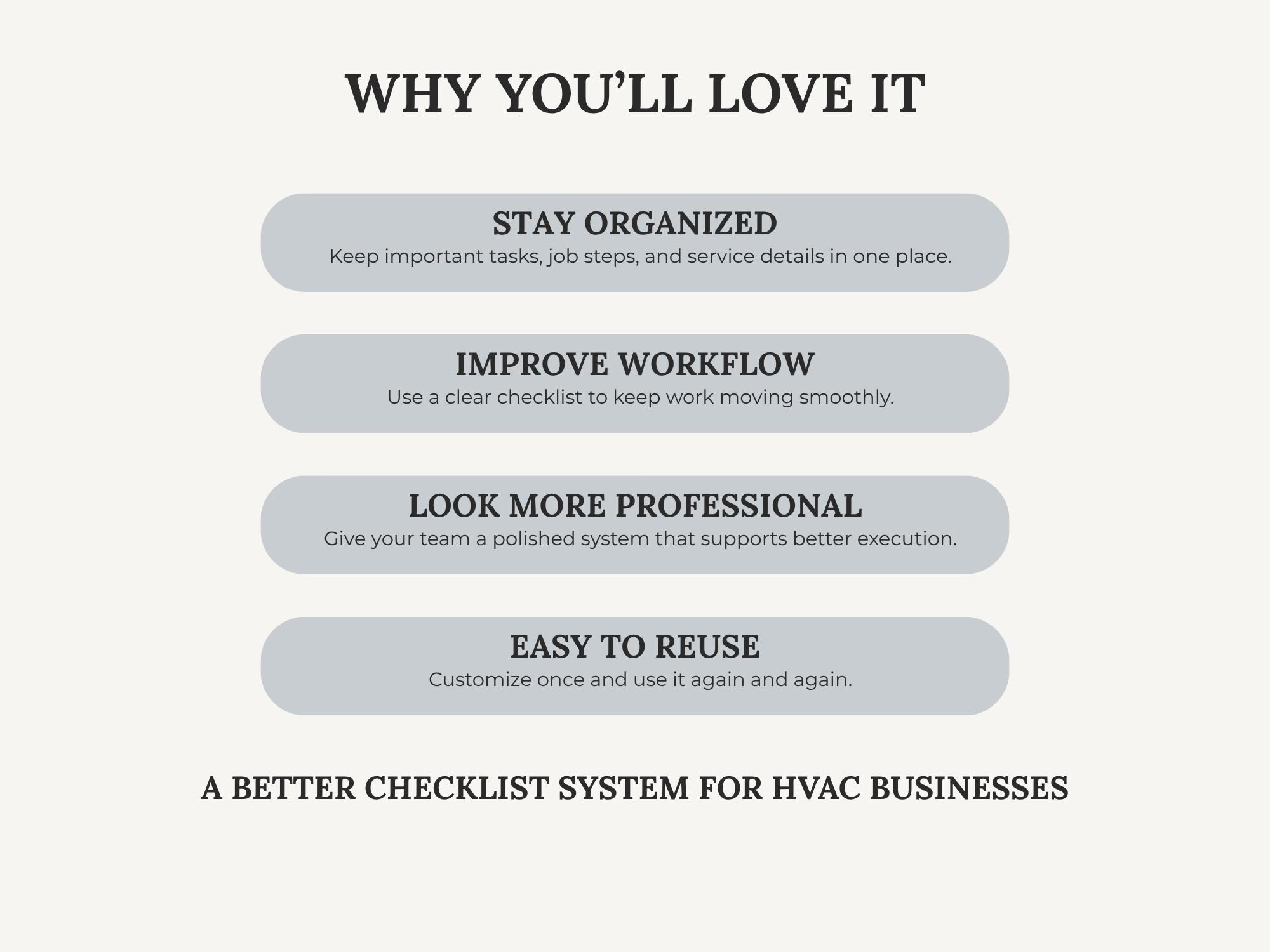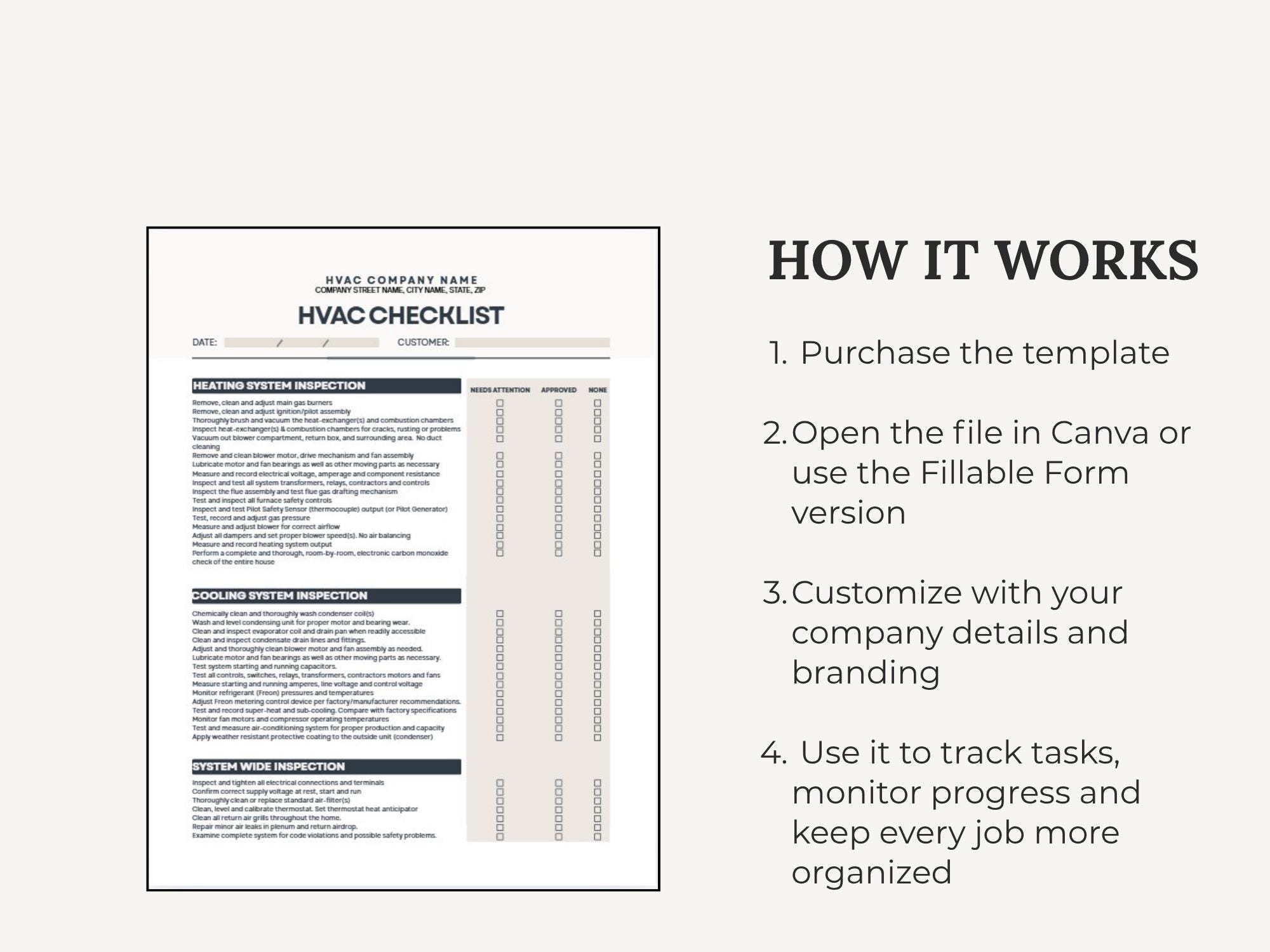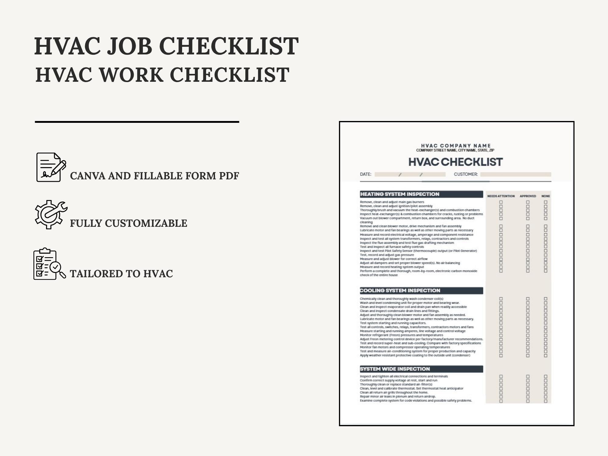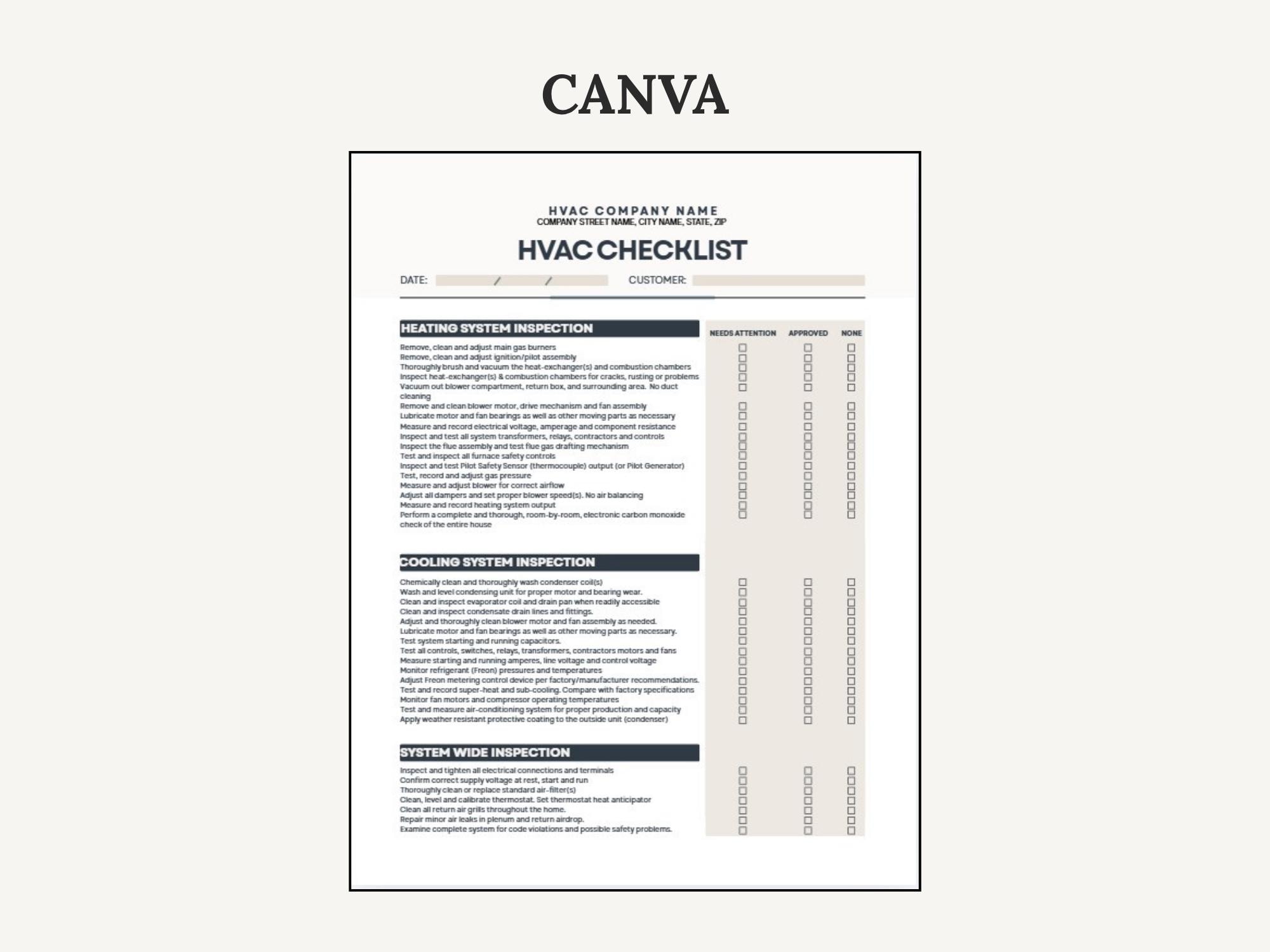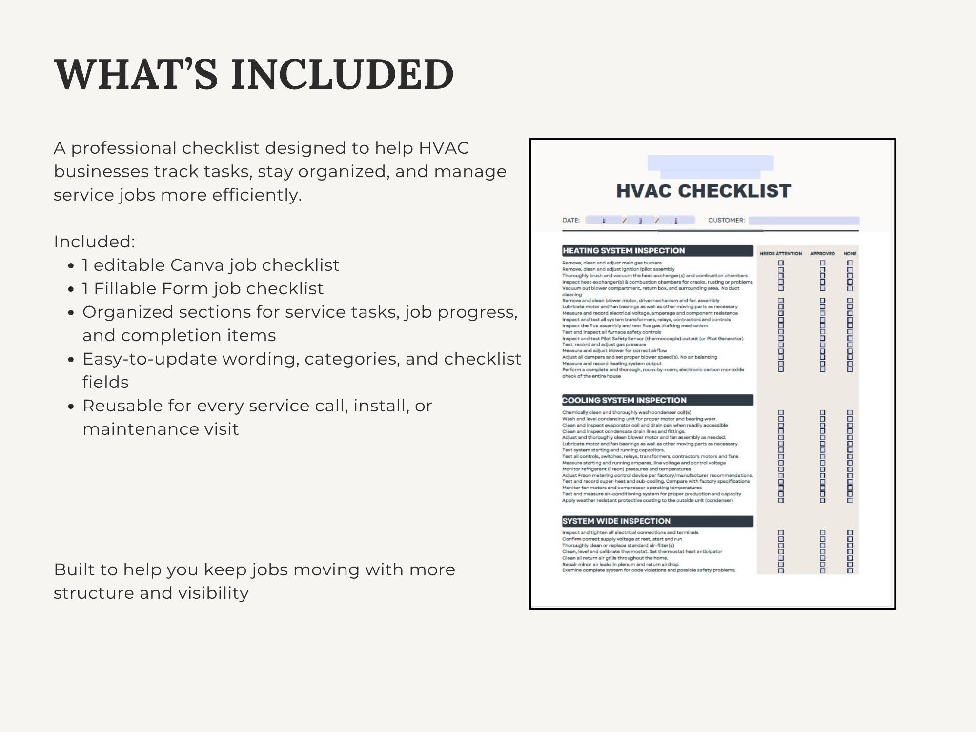 Keep every job consistent with a simple, client-ready HVAC Job Checklist. Use it for pre-job prep, service steps, and closeout—so nothing gets missed and your process looks polished. Edit the checklist layout in Canva or fill it out quickly using the fillable PDF.