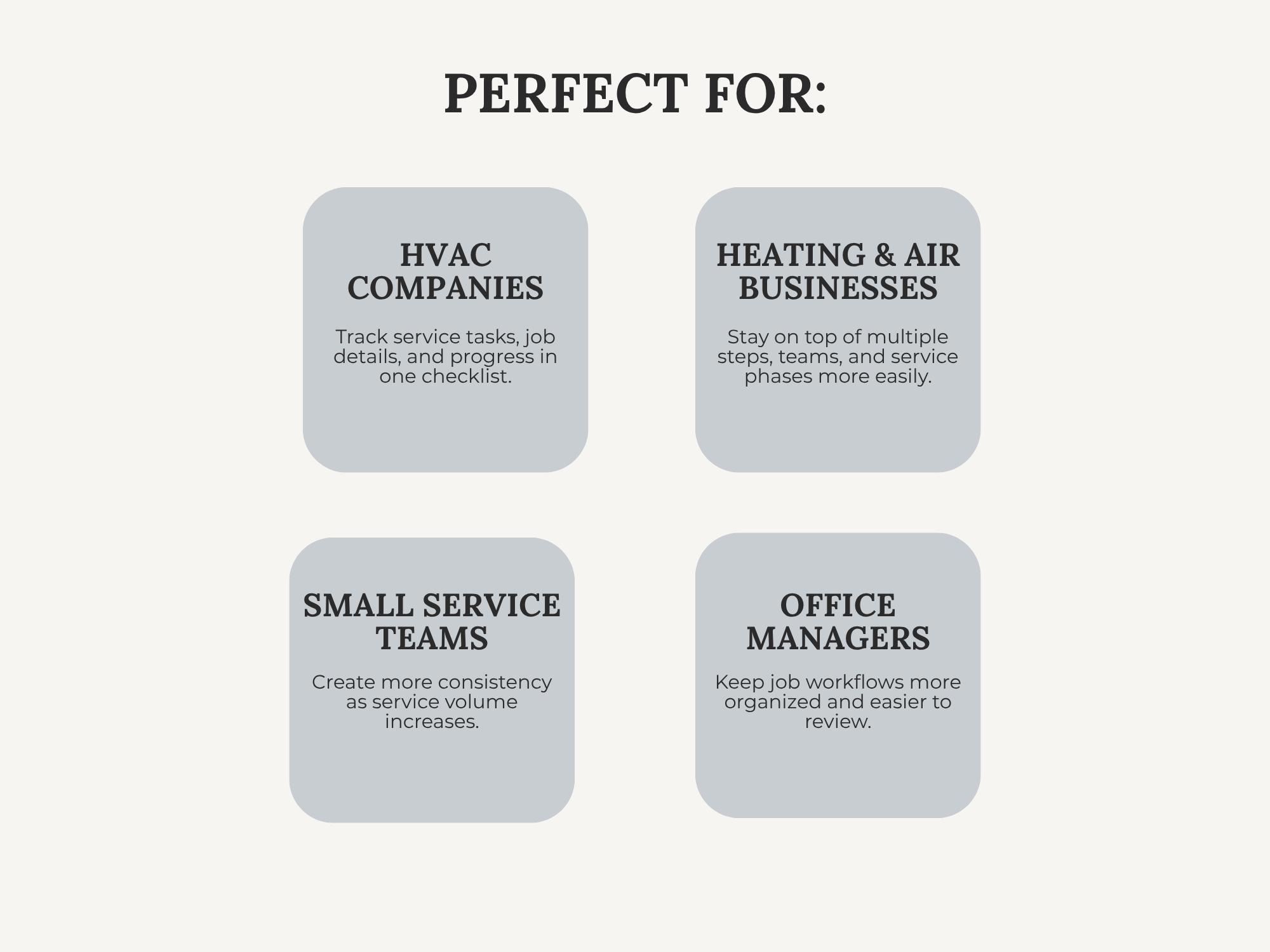 Best for: technician workflow, QA, job closeout, repeatable service process