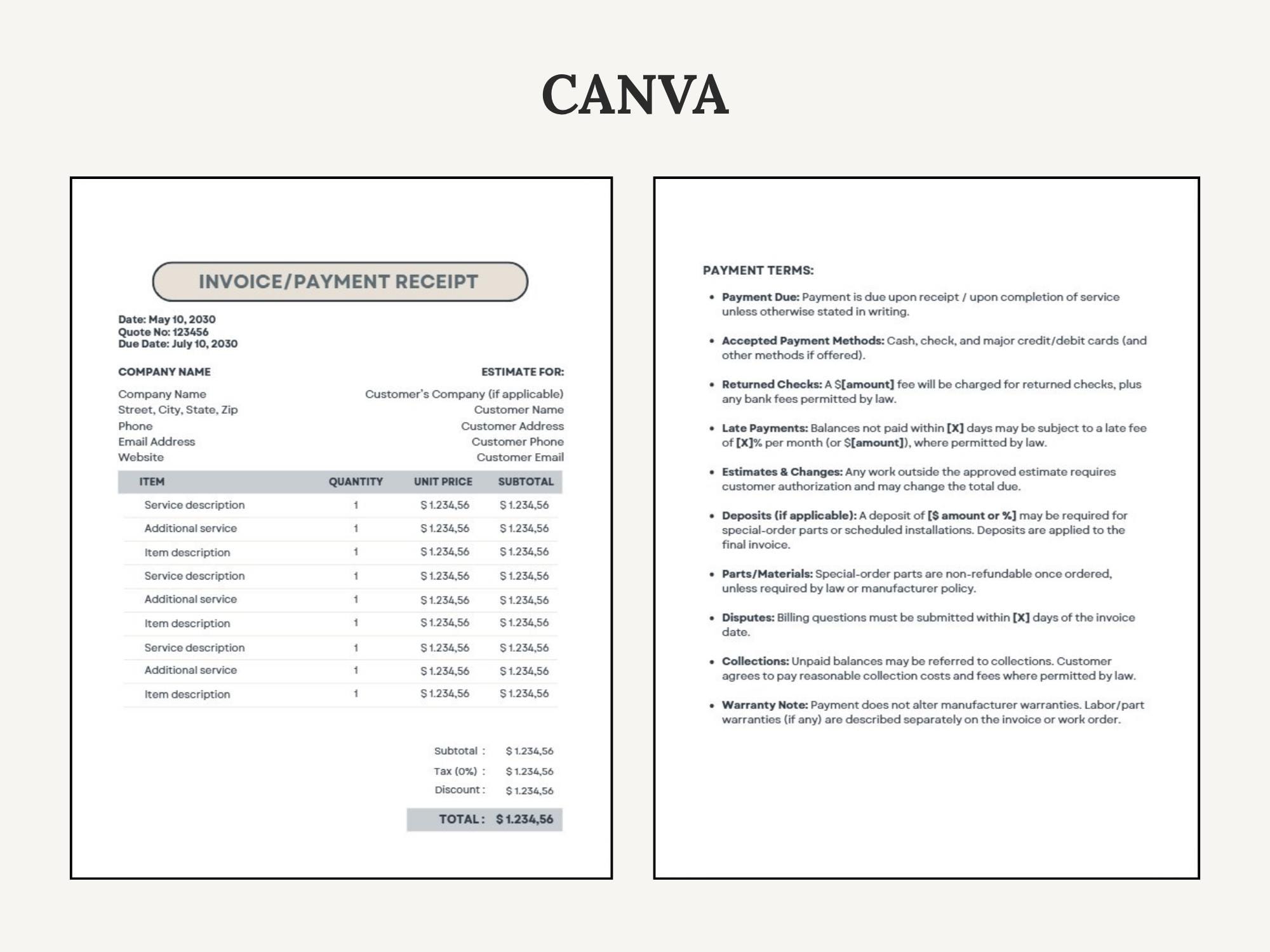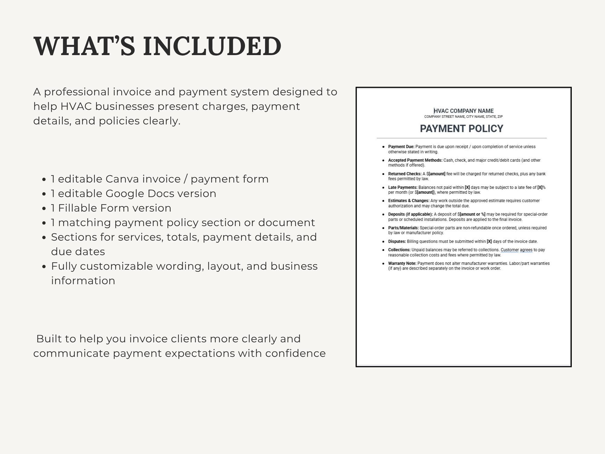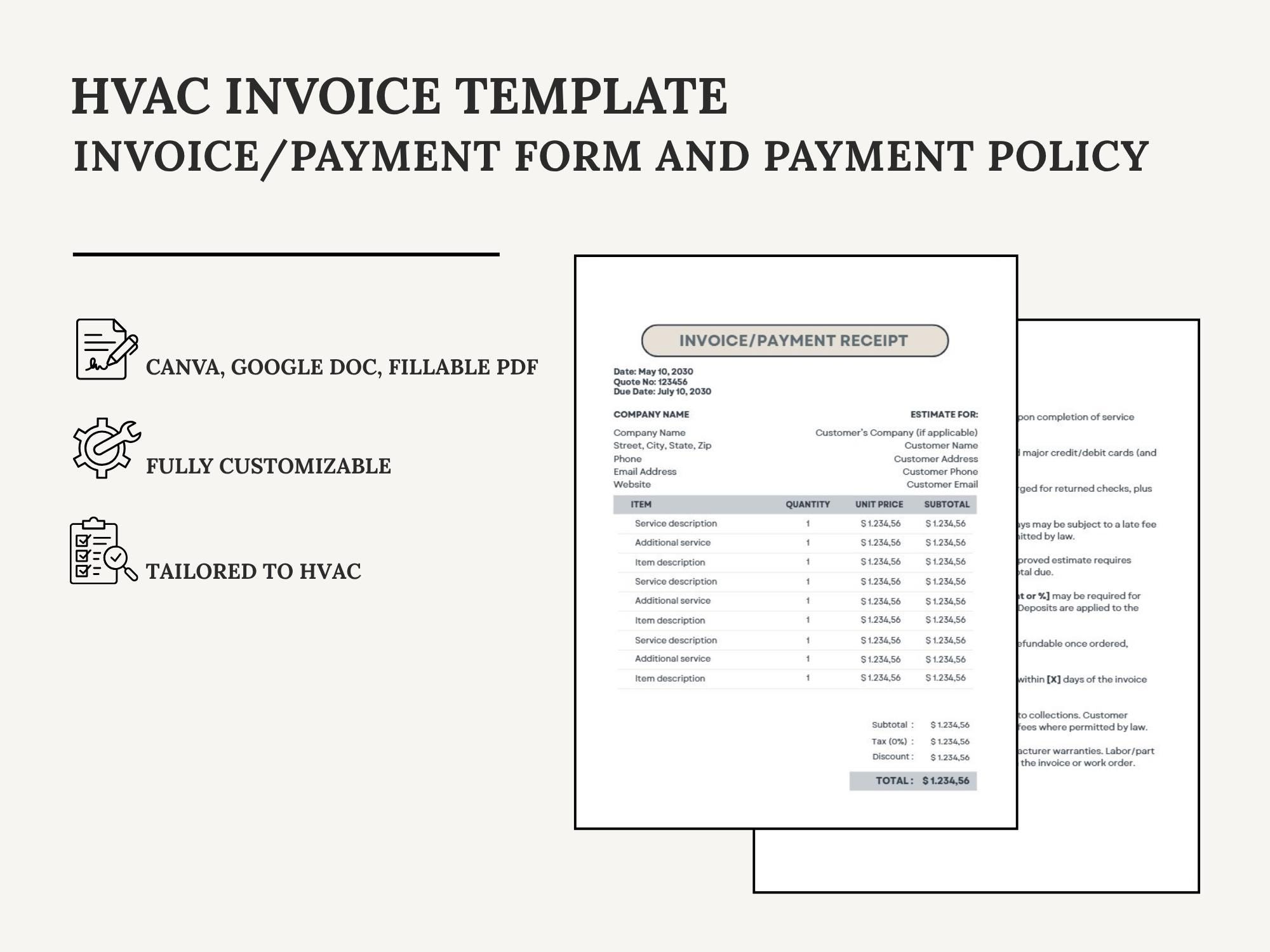 Get paid faster with a clean HVAC Invoice / Payment Forms + Payment Policy set. Designed to help you invoice professionally and communicate deposits, due dates, late fees, and accepted payment methods clearly. Includes Canva for branding, Google Doc for quick edits, and fillable PDFs for immediate use.