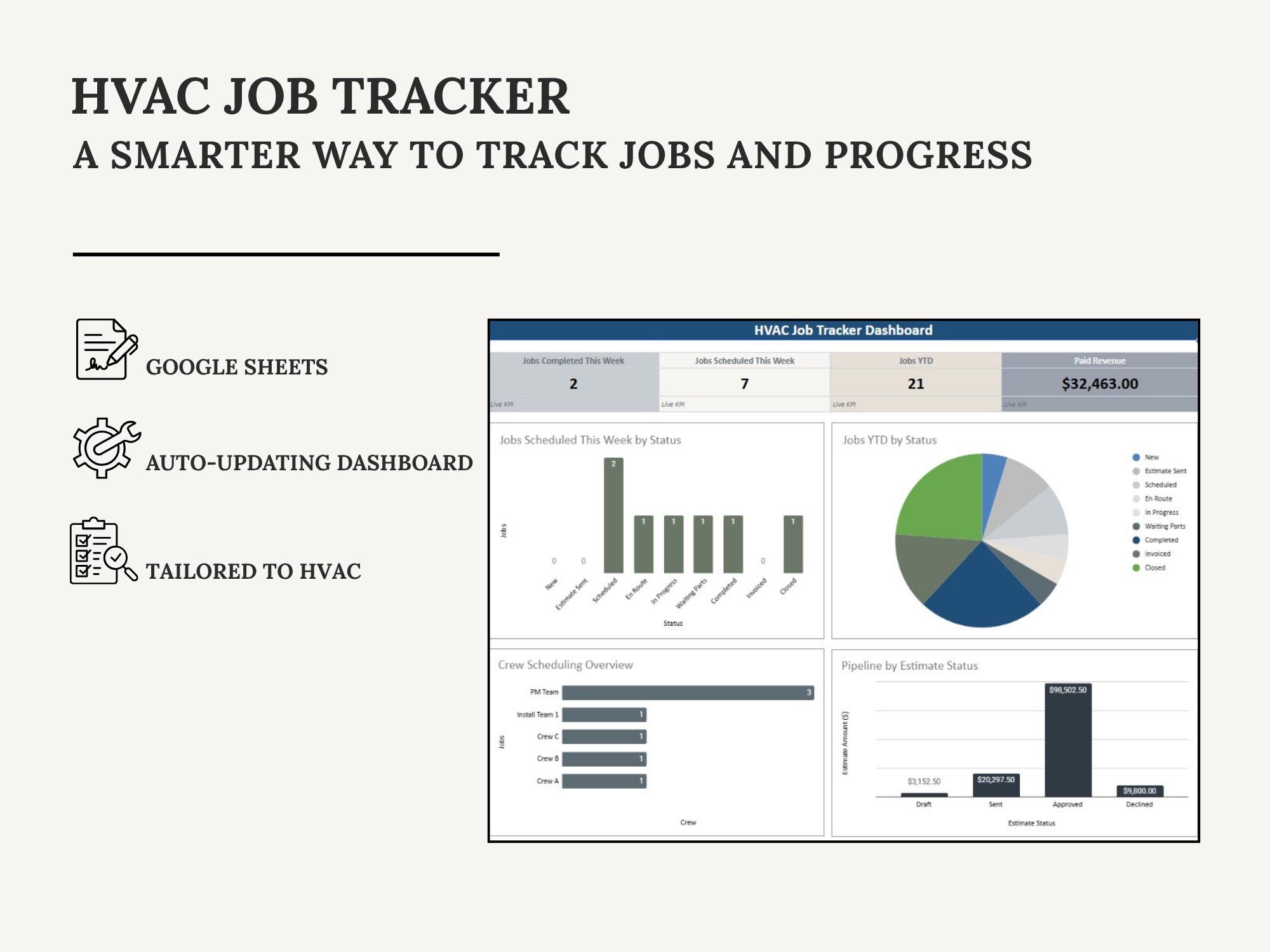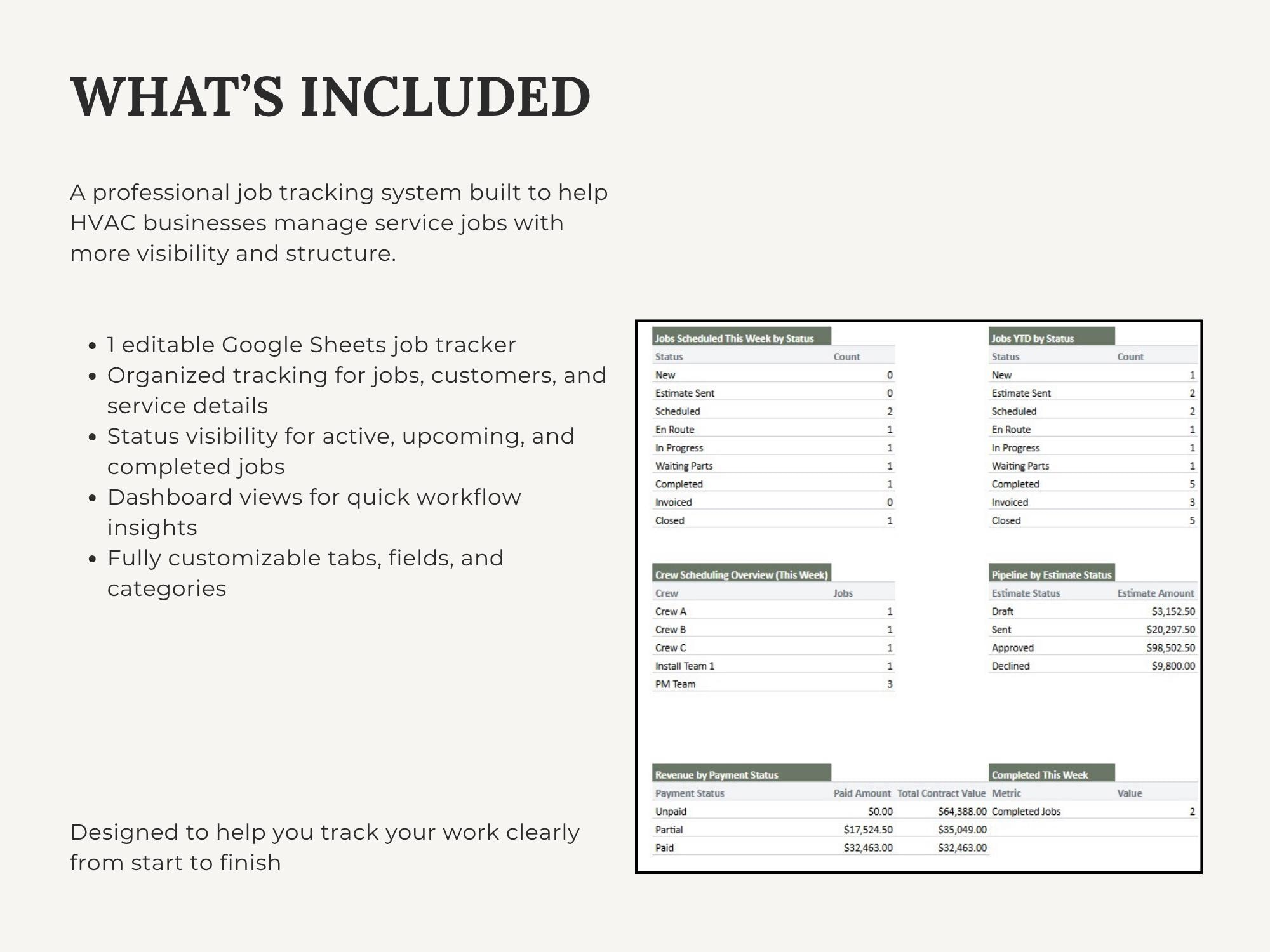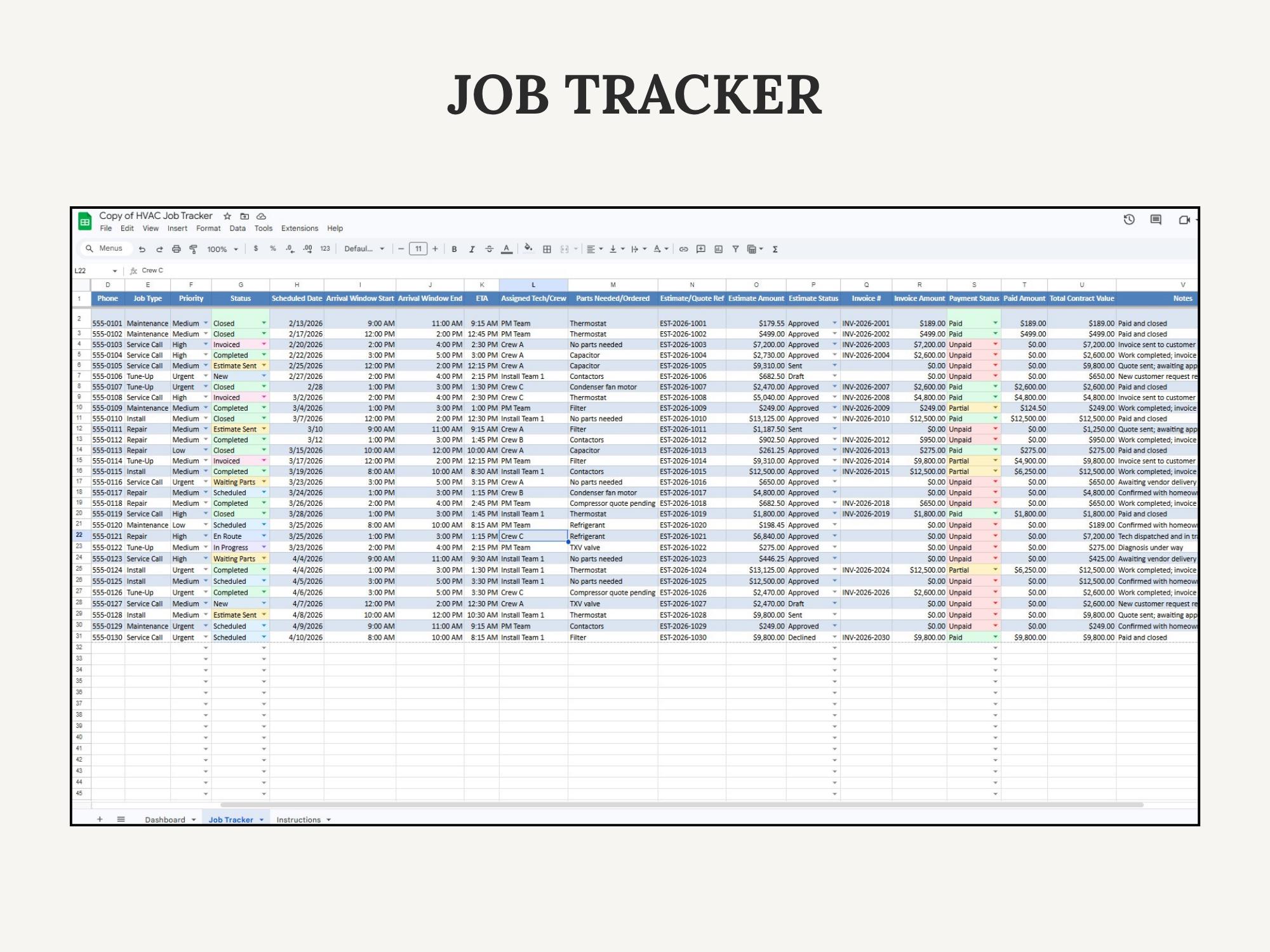 Track jobs, payments, and statuses in one place with the HVAC Job Tracker (Google Sheets). Built for simple daily use—log each client, job date, status, invoiced amount, paid amount, and balance due. Designed to help owner-operators stay organized without complicated software.