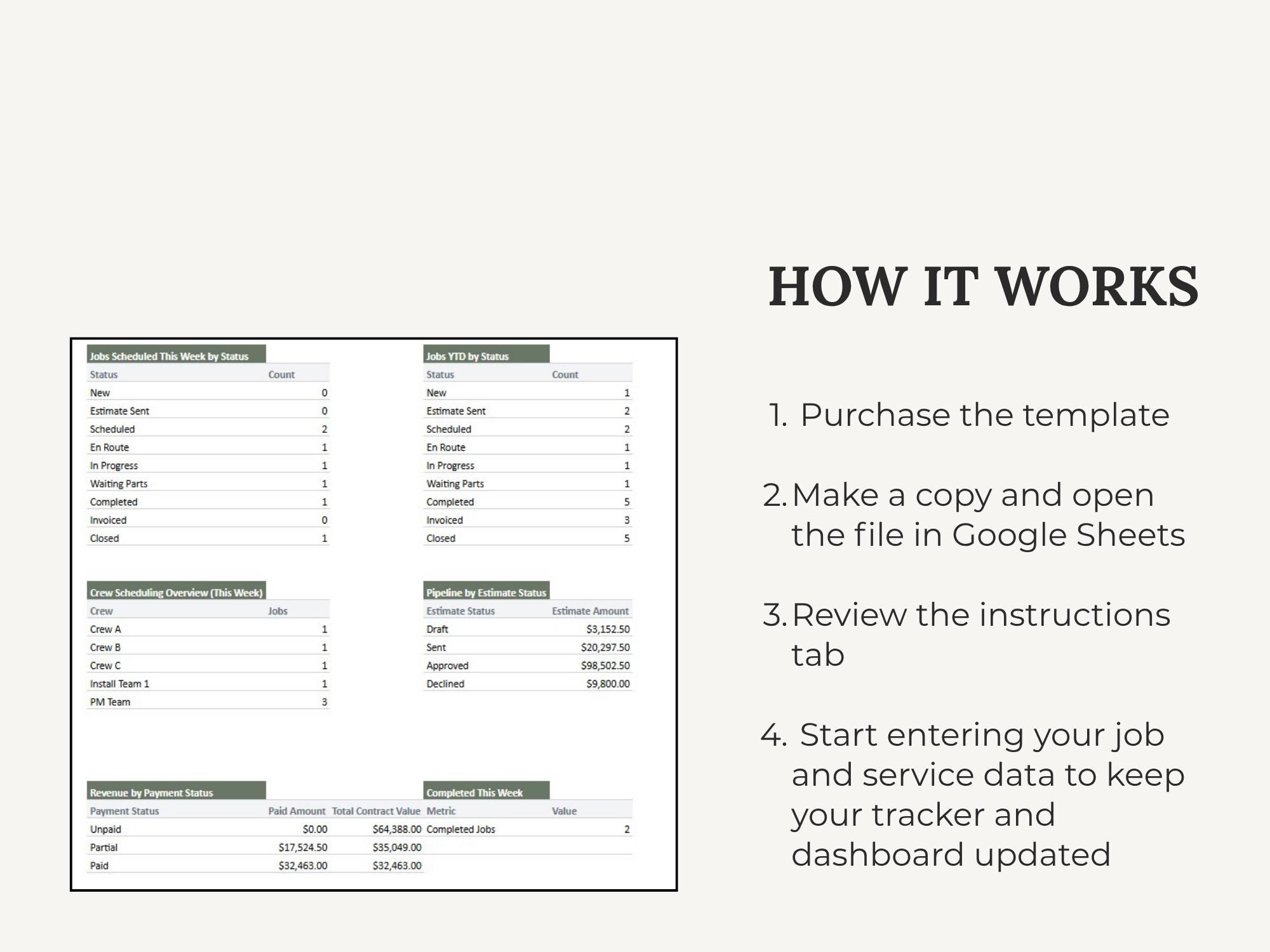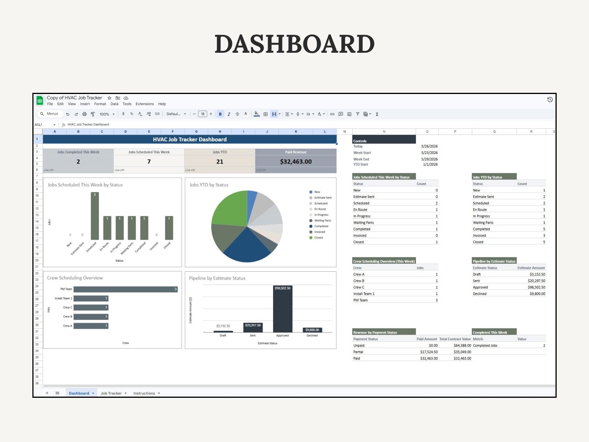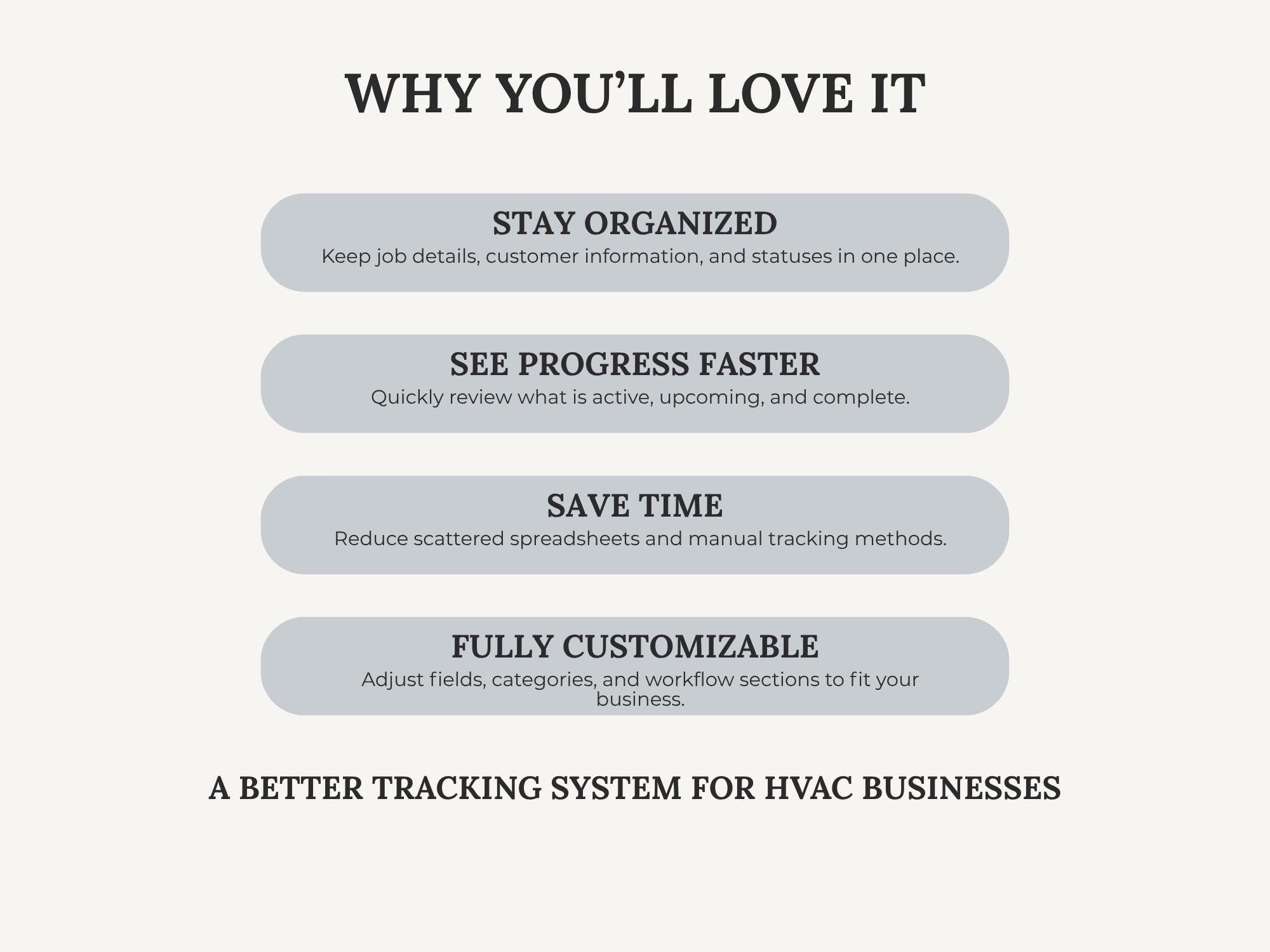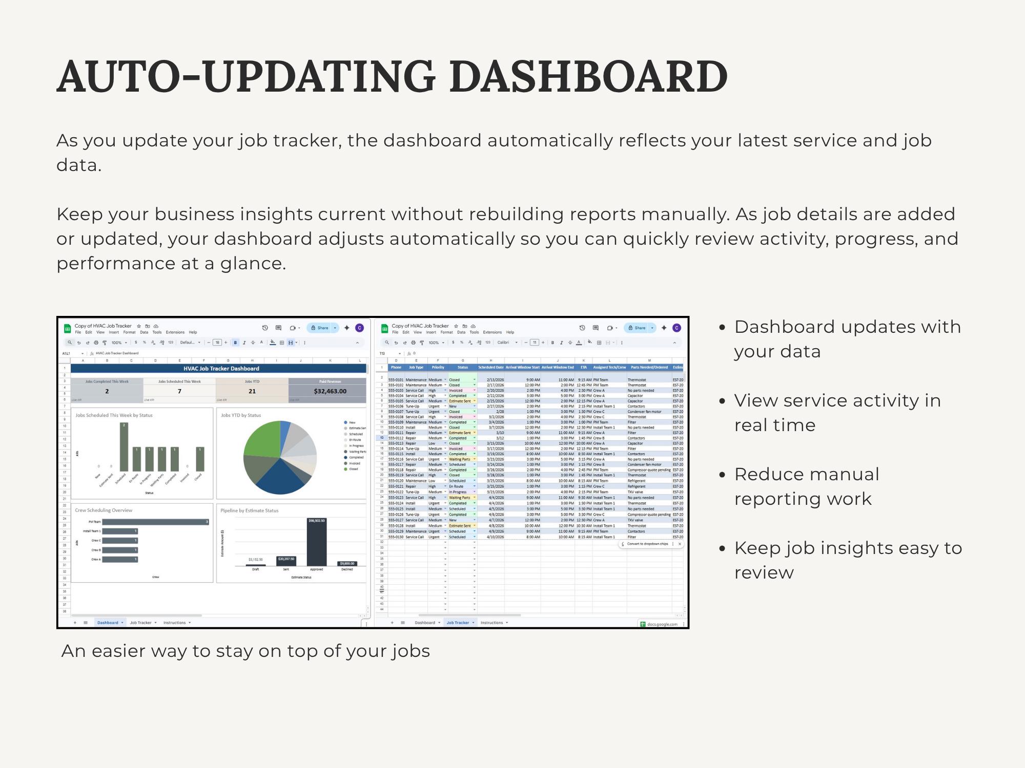 Track jobs, payments, and statuses in one place with the HVAC Job Tracker (Google Sheets). Built for simple daily use—log each client, job date, status, invoiced amount, paid amount, and balance due. Designed to help owner-operators stay organized without complicated software.