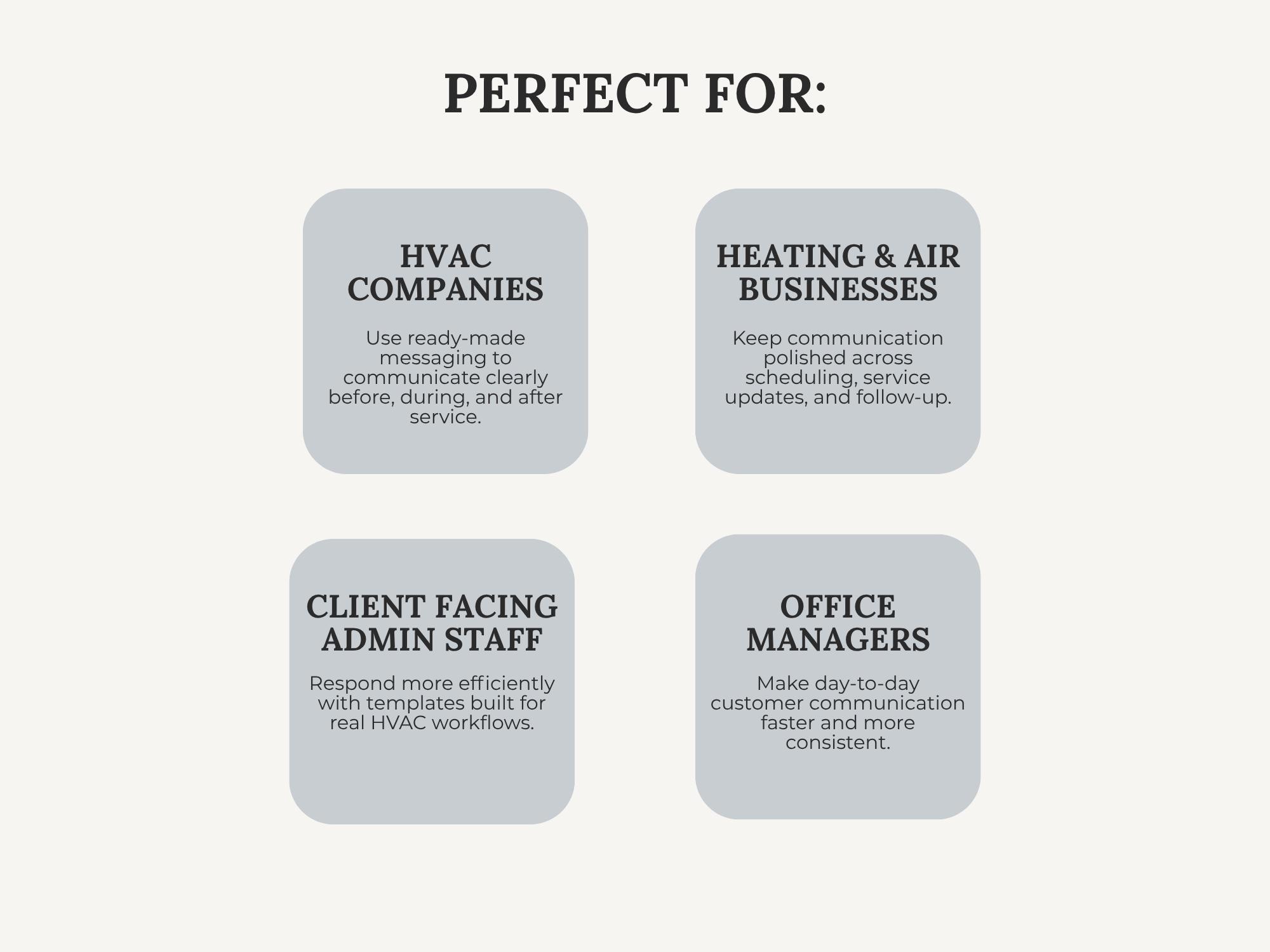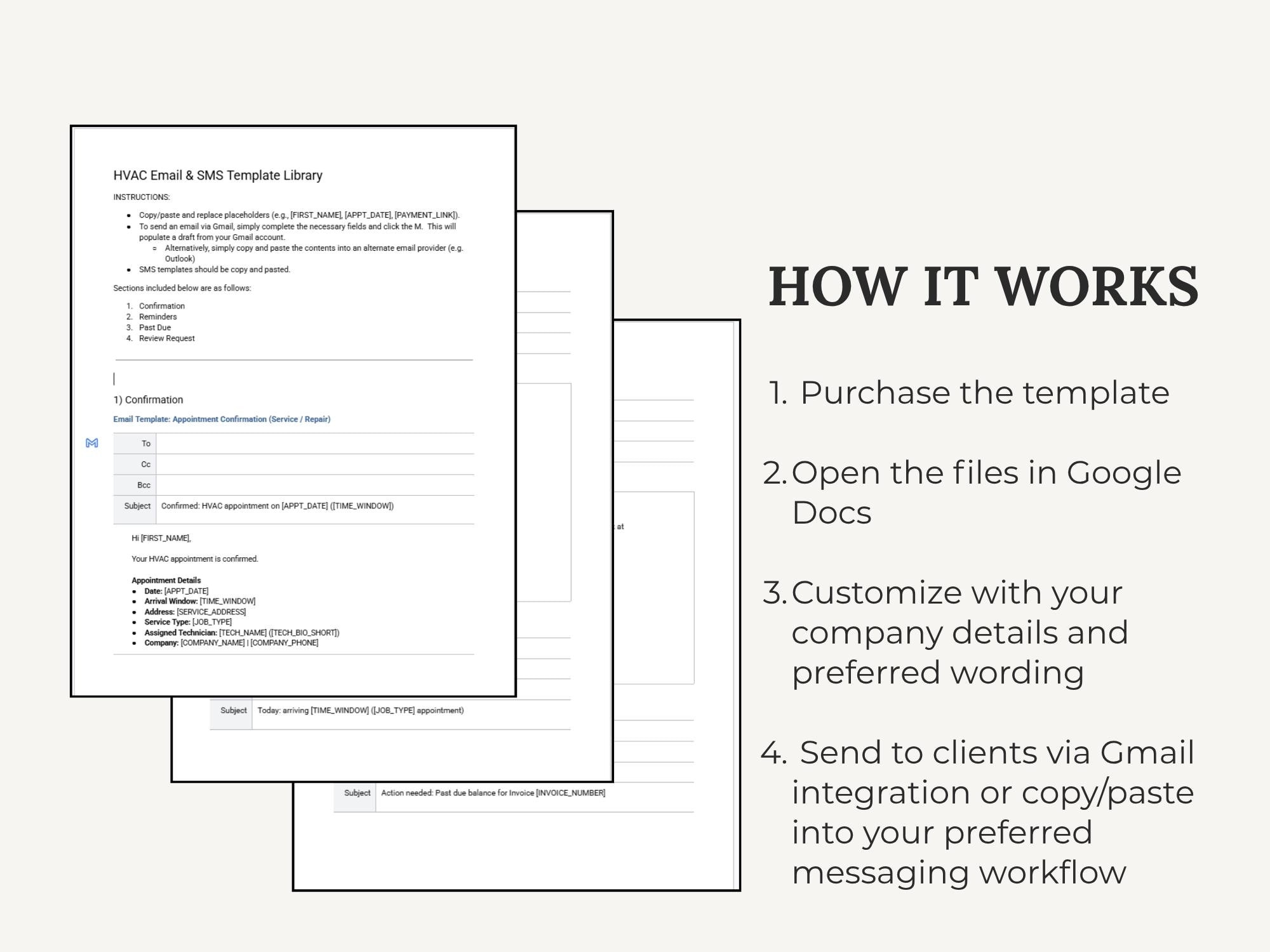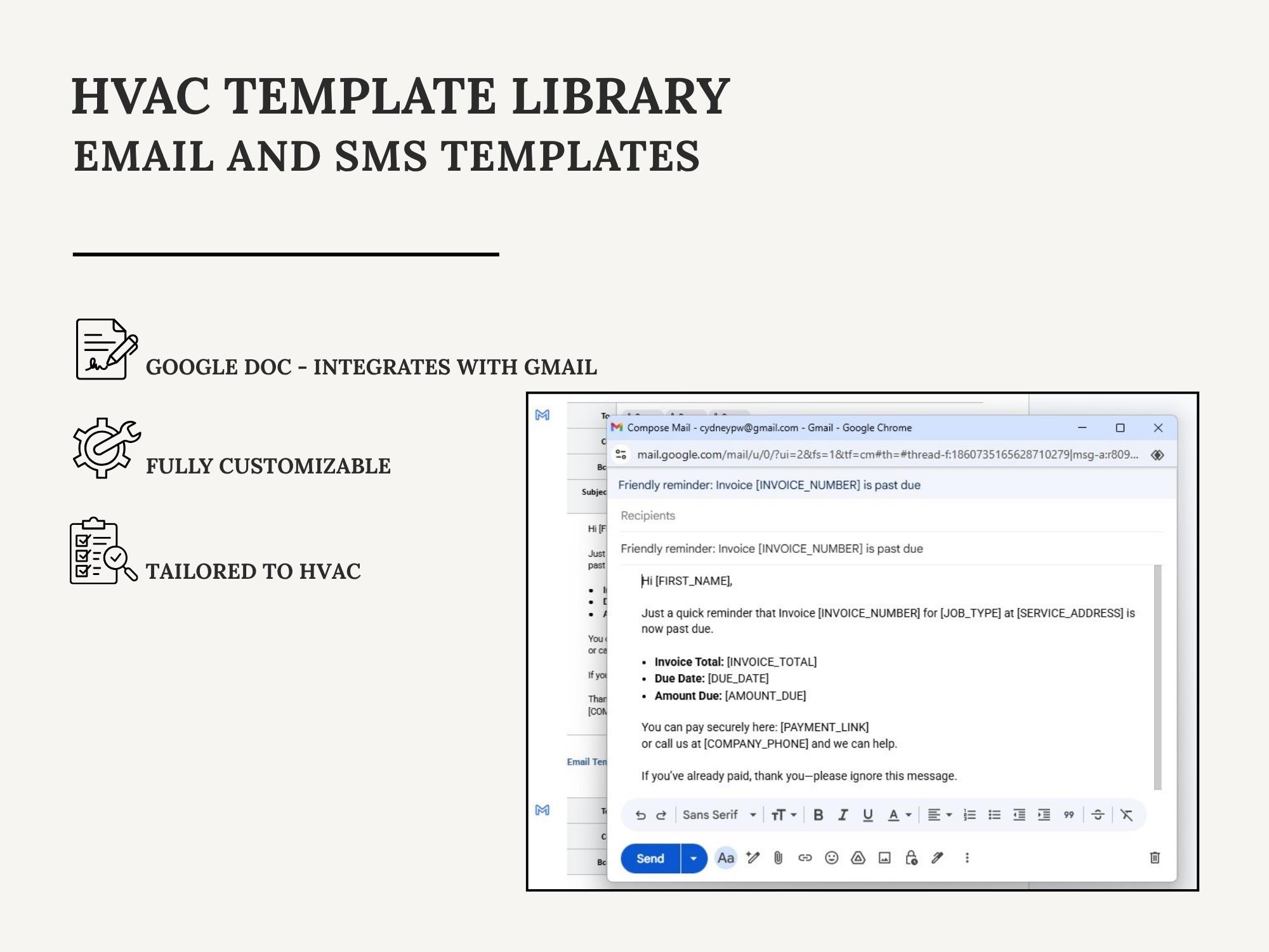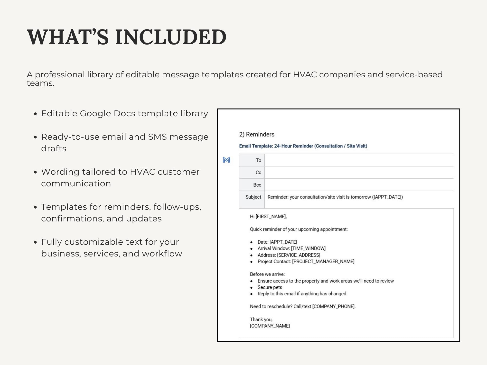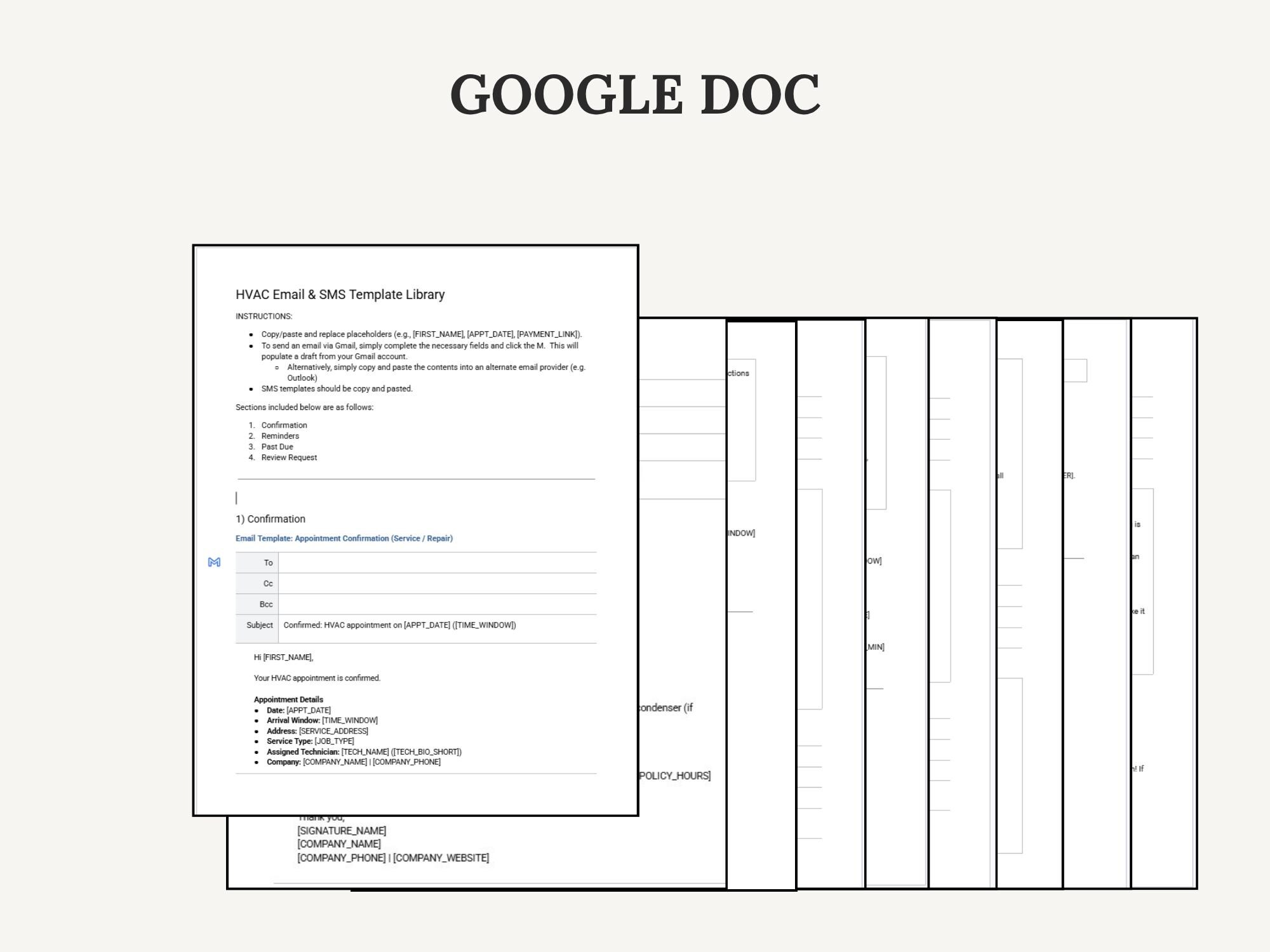 Save time and follow up like a pro. This HVAC Email + SMS Template Library includes ready-to-copy messages for confirmations, reminders, on-the-way texts, follow-ups, past-due payments, and review requests. Delivered as a Google Doc so you can edit quickly and paste into your phone or CRM.