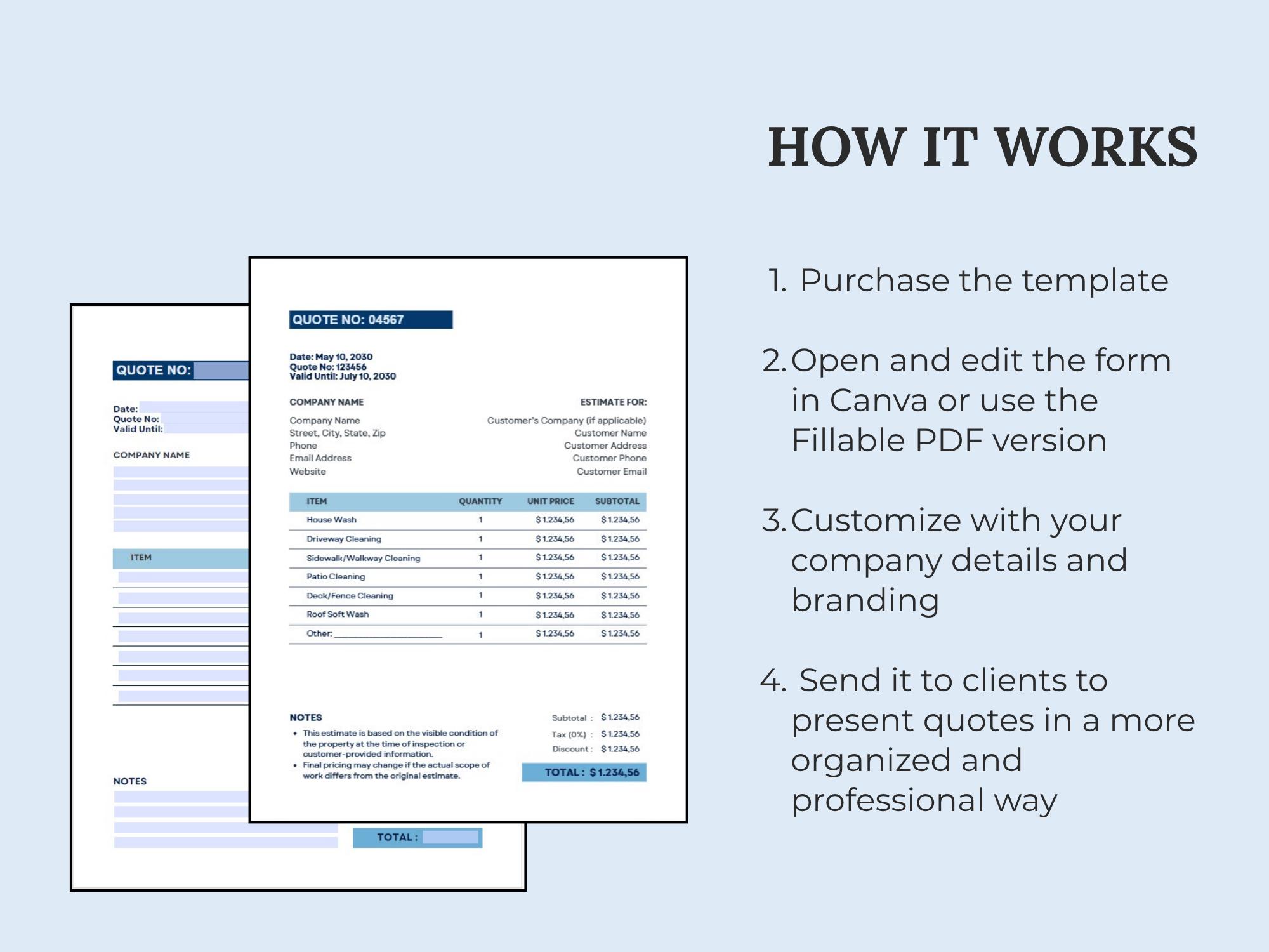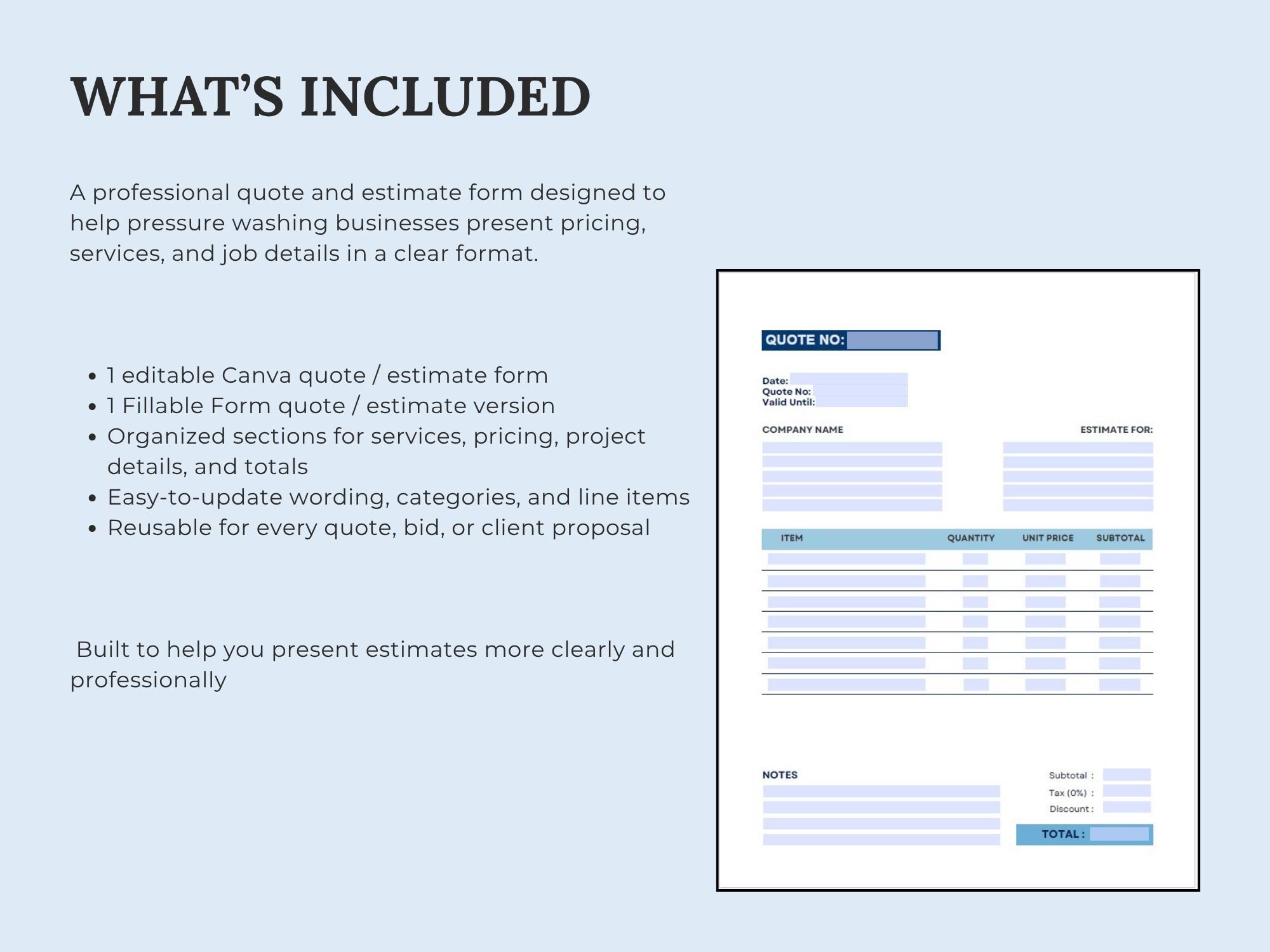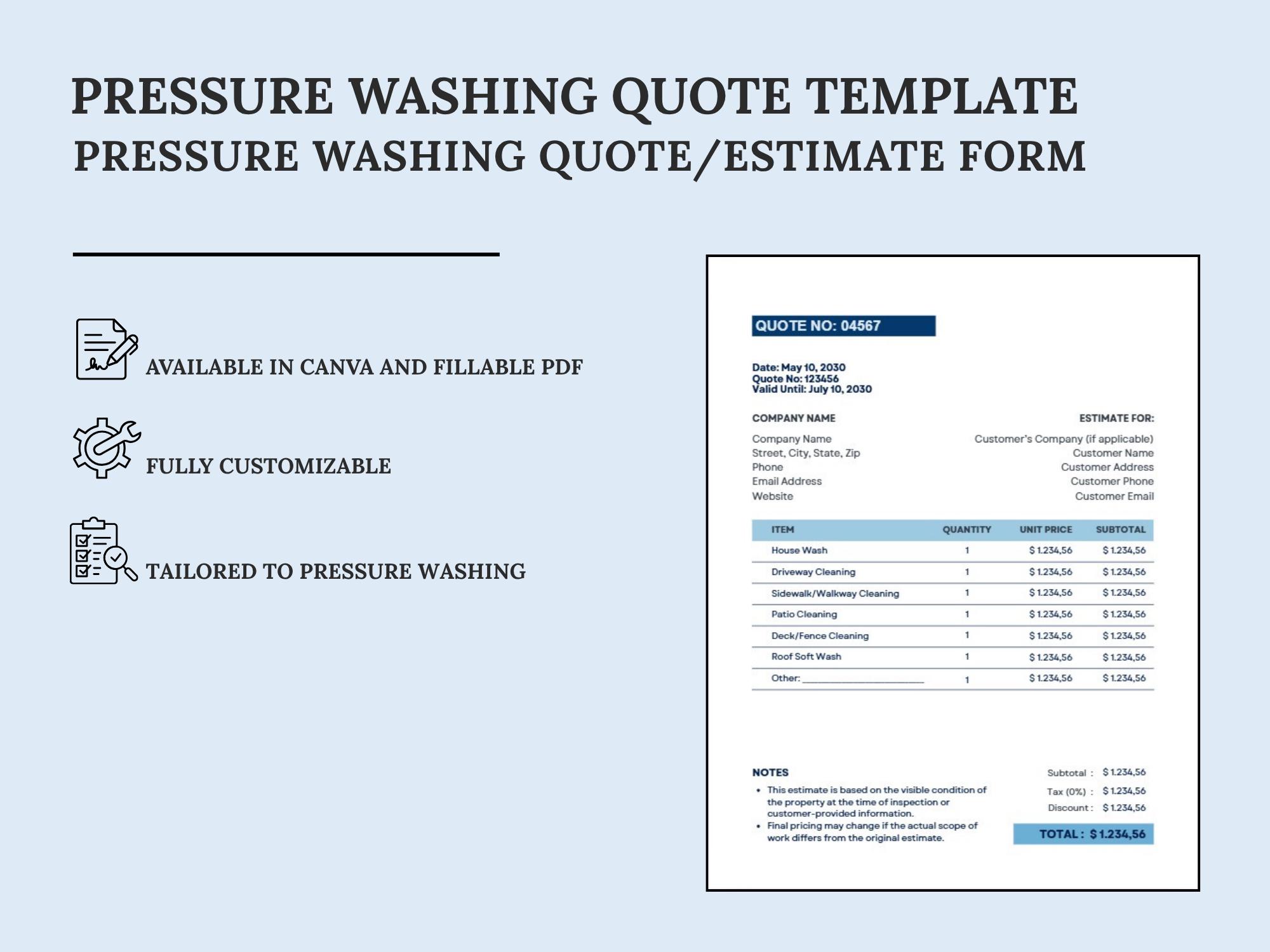 Send clear, professional quotes that convert. This Pressure Washing Estimate/Quote Template is built for scope, surface areas, add-ons, totals, and approval—so clients understand the job and pricing instantly.