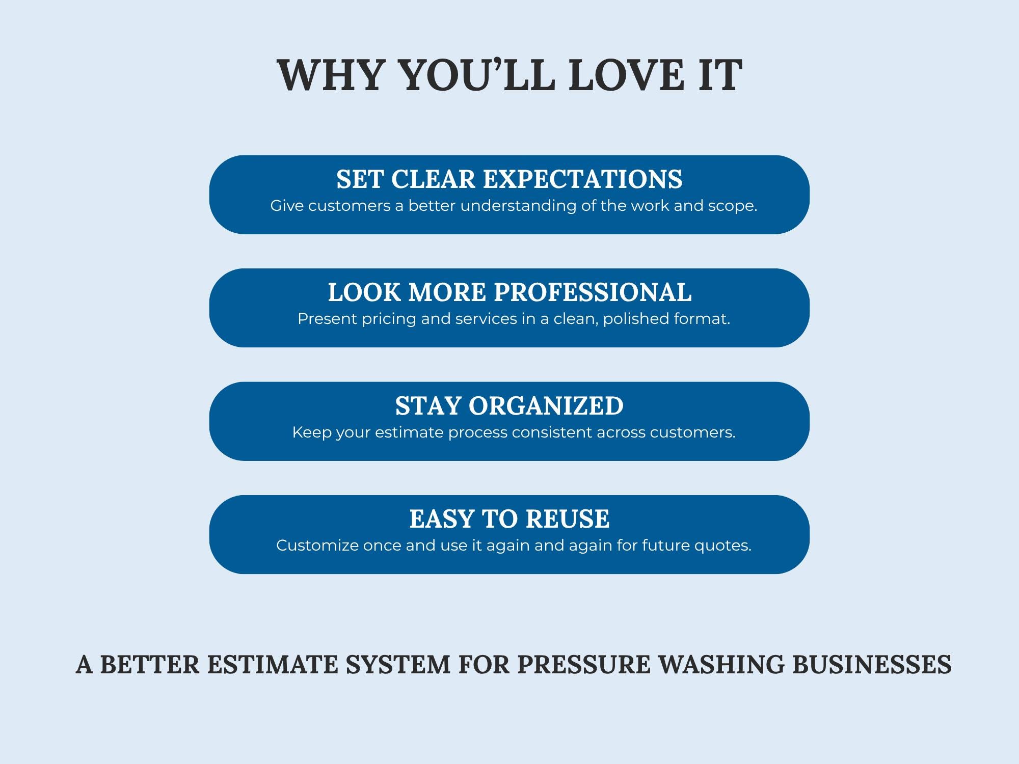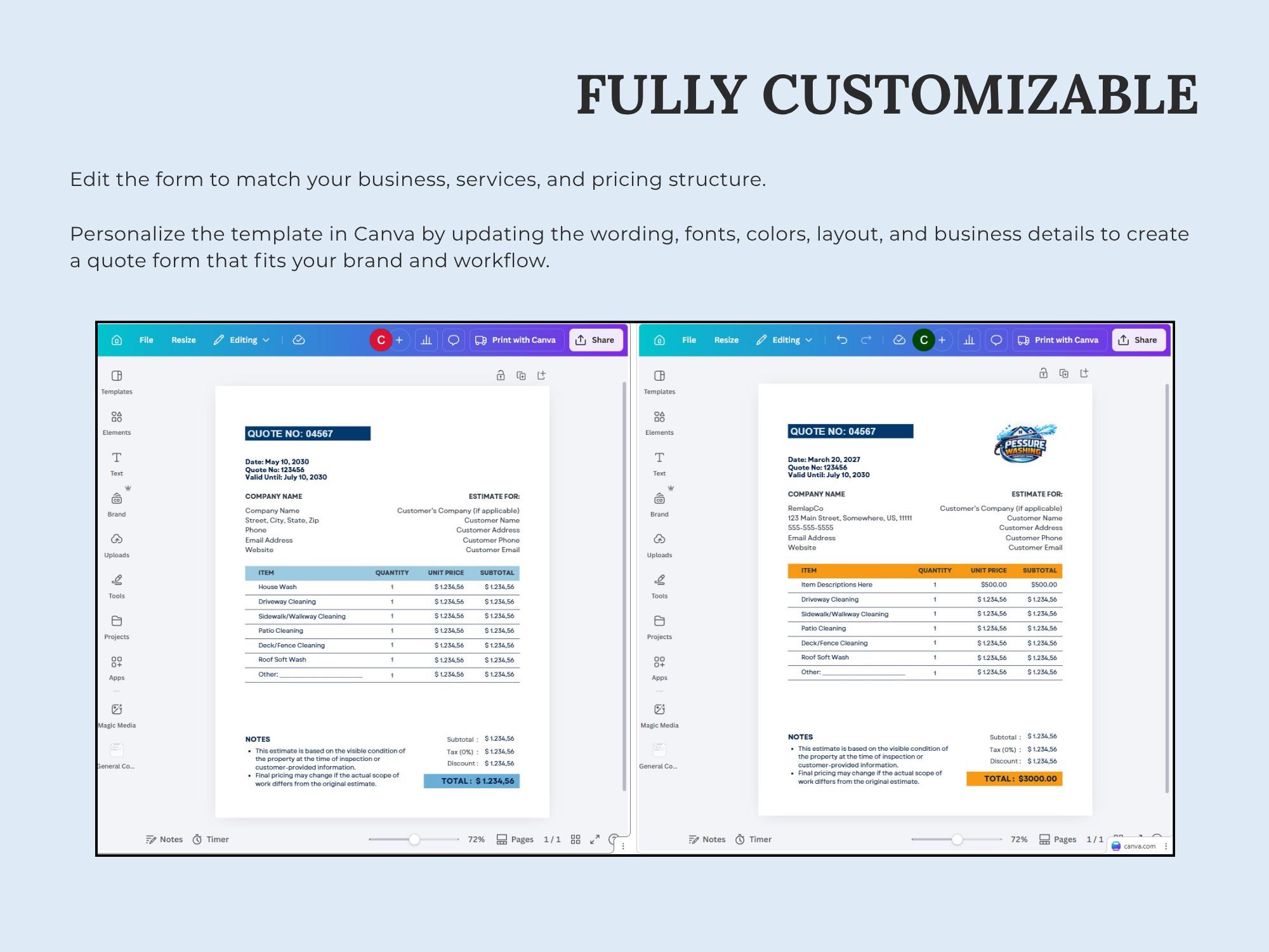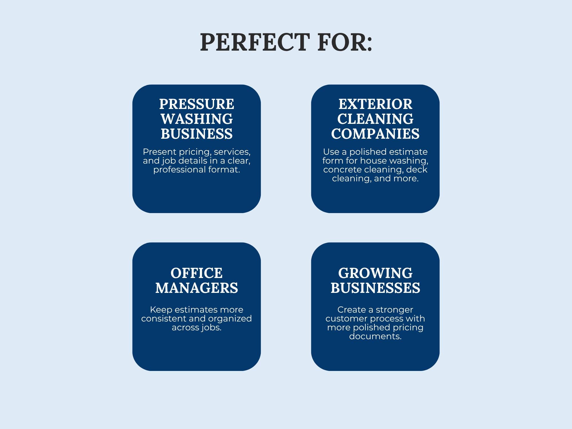 Send clear, professional quotes that convert. This Pressure Washing Estimate/Quote Template is built for scope, surface areas, add-ons, totals, and approval—so clients understand the job and pricing instantly.
