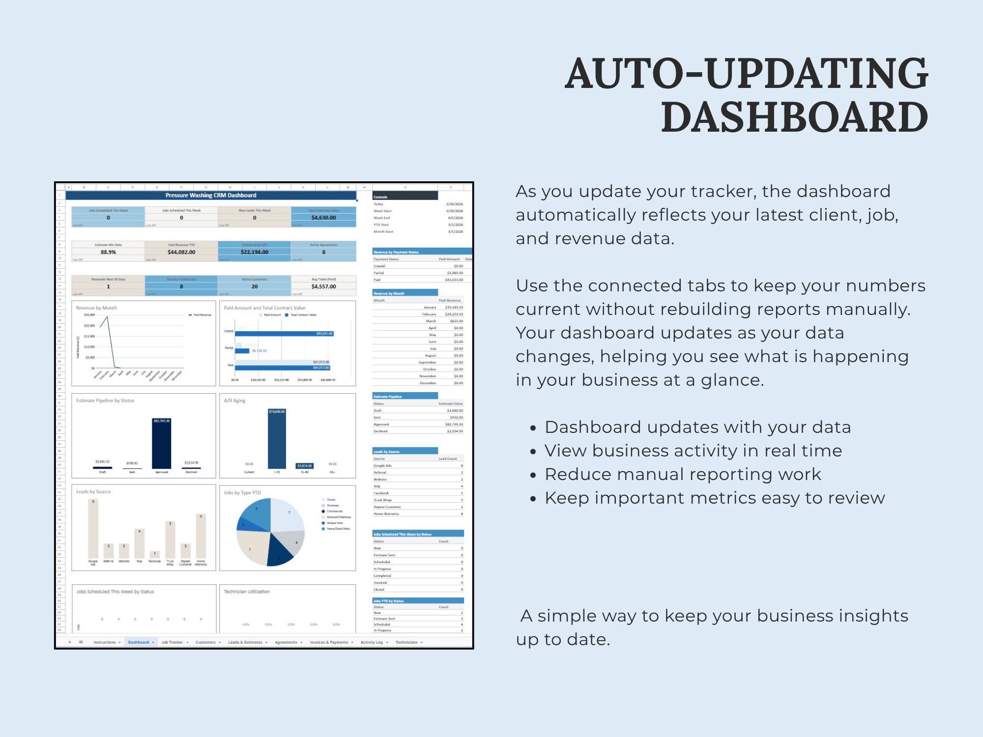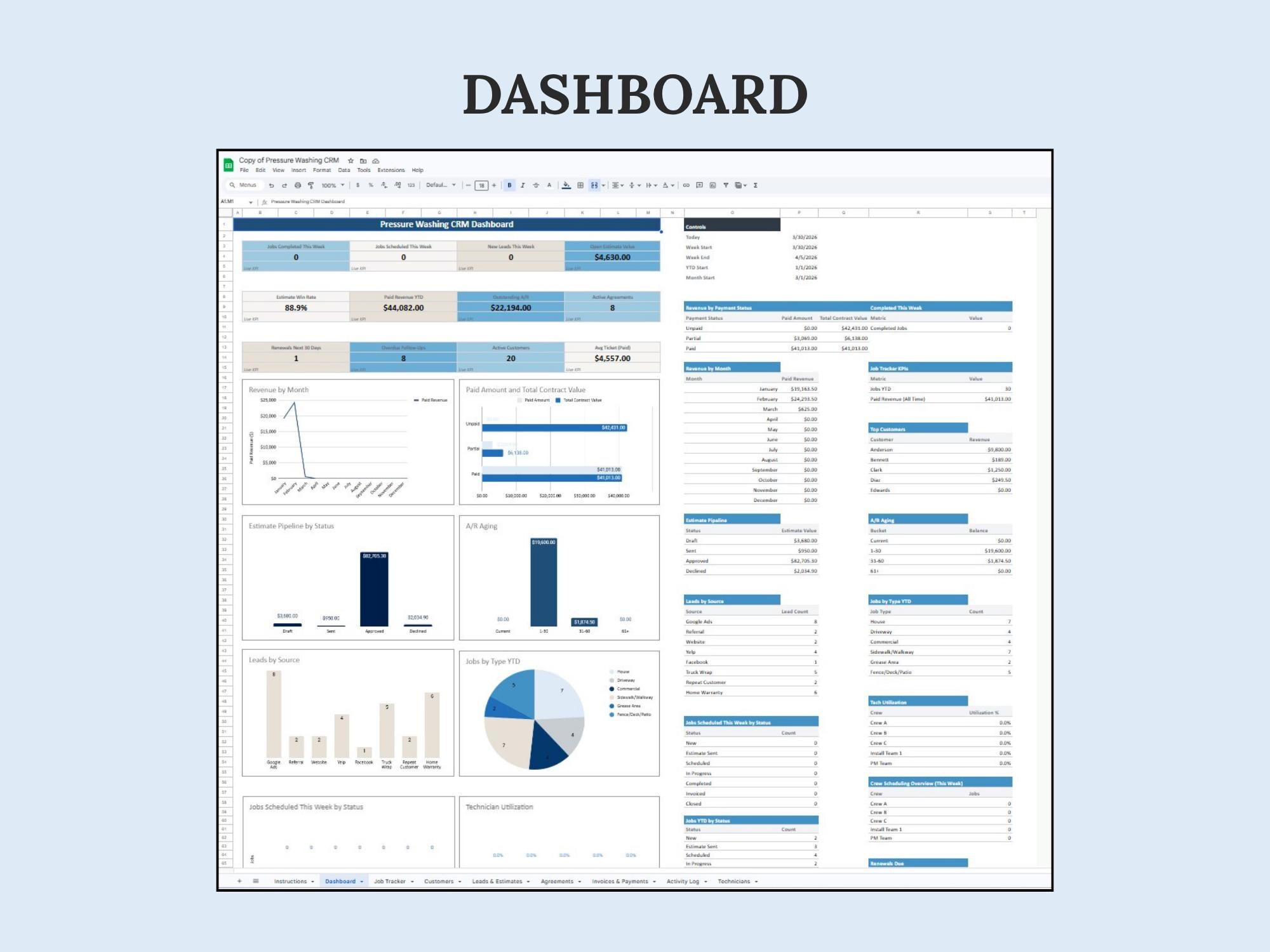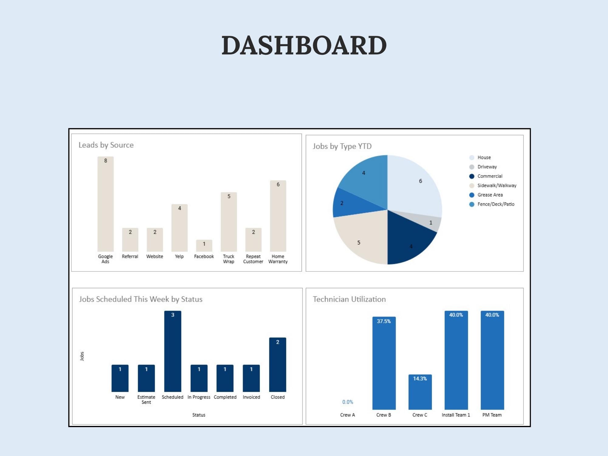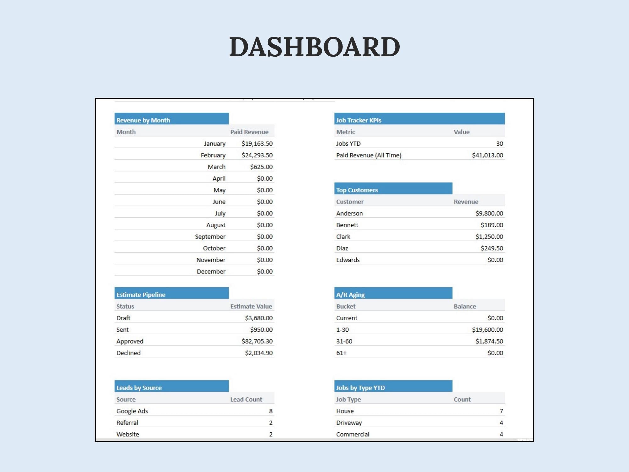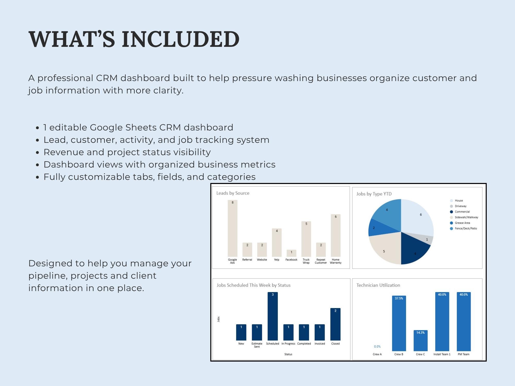 A lightweight CRM dashboard to track leads → quotes → scheduled jobs → paid invoices. Built in Google Sheets so you can manage your pipeline without extra software.Format included: Google Sheets