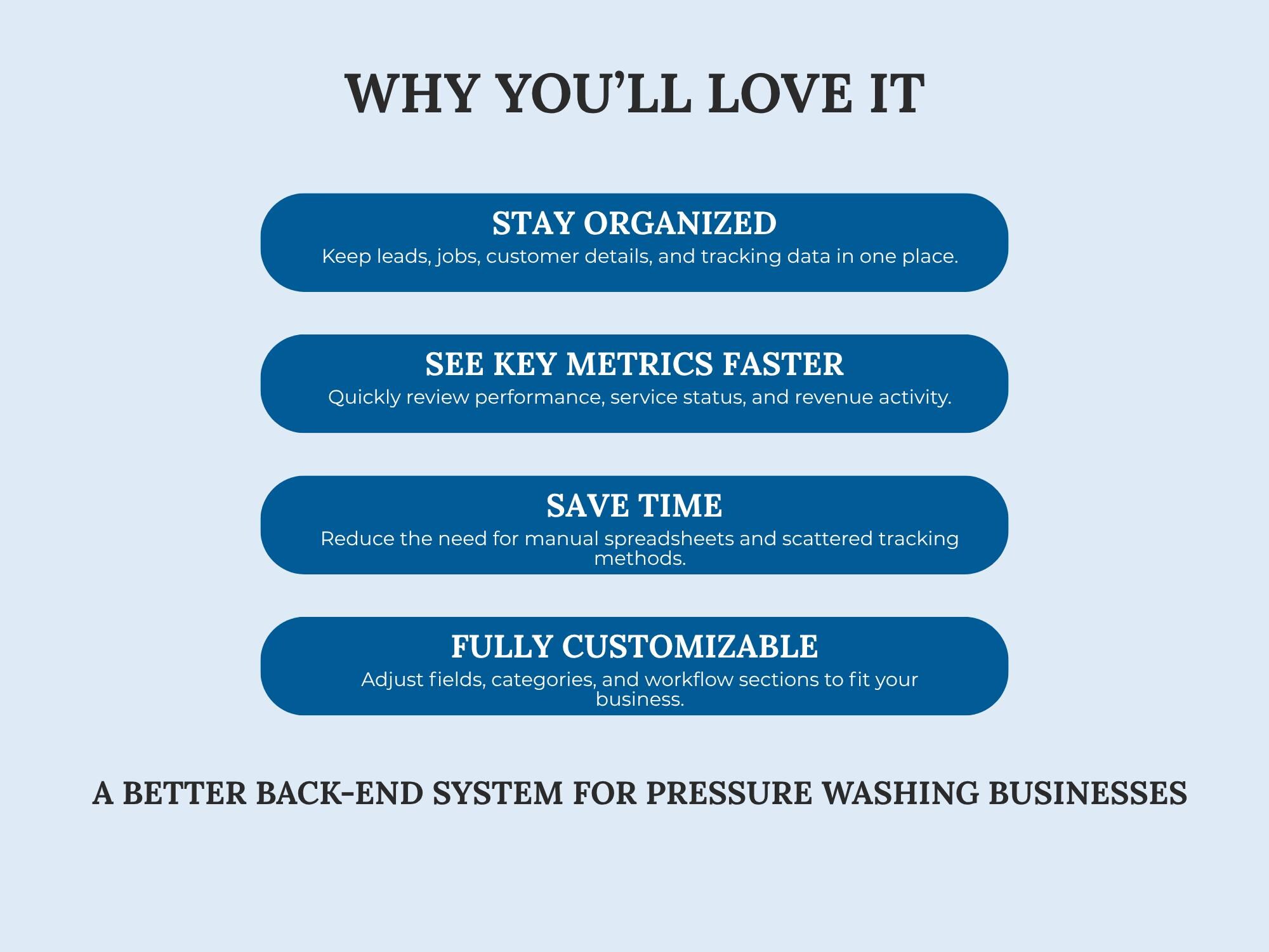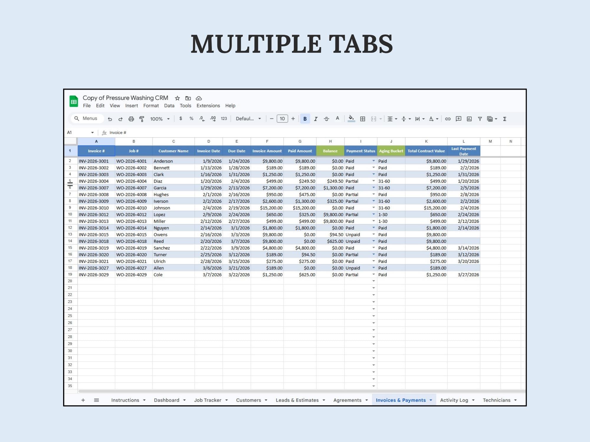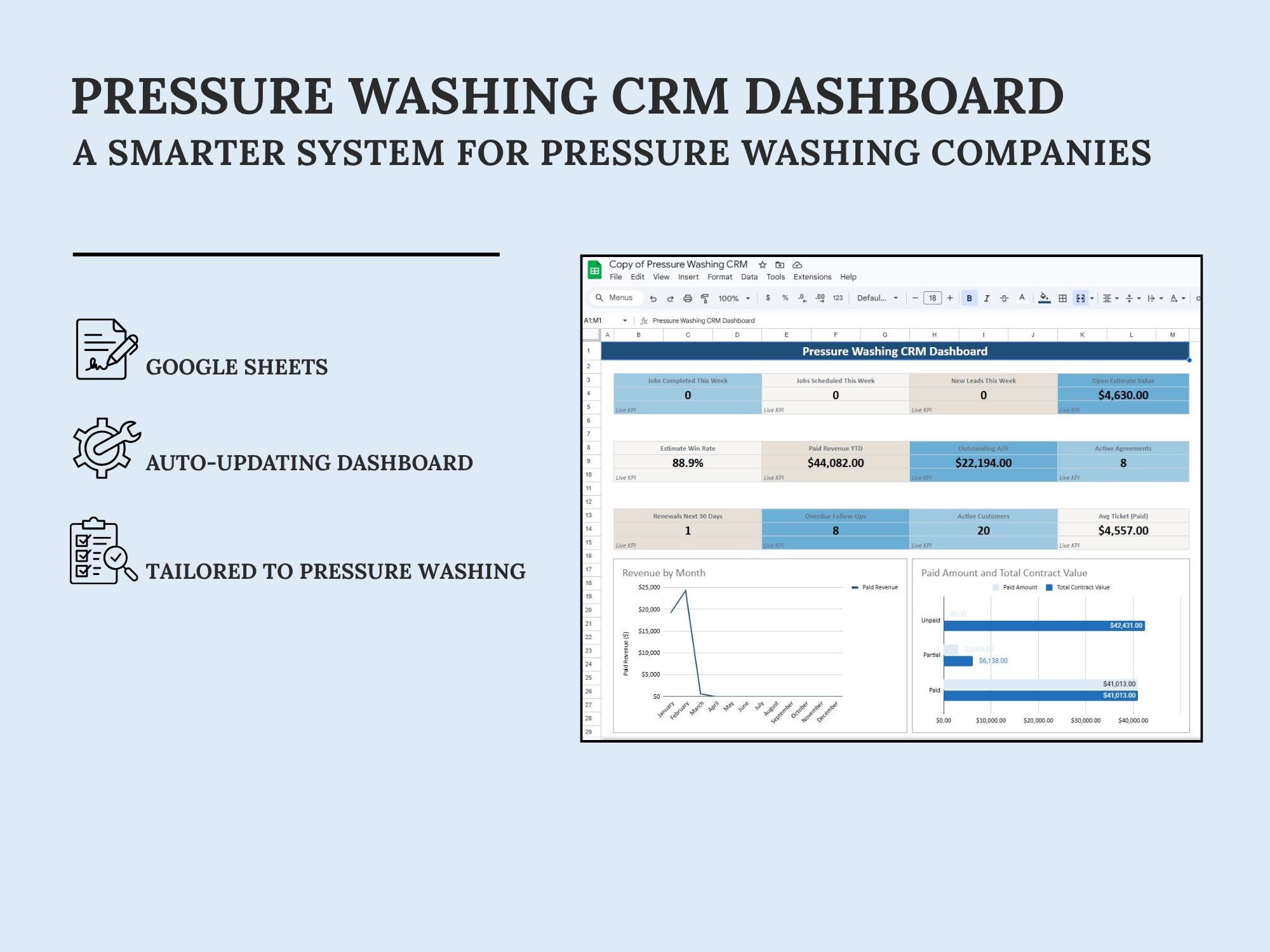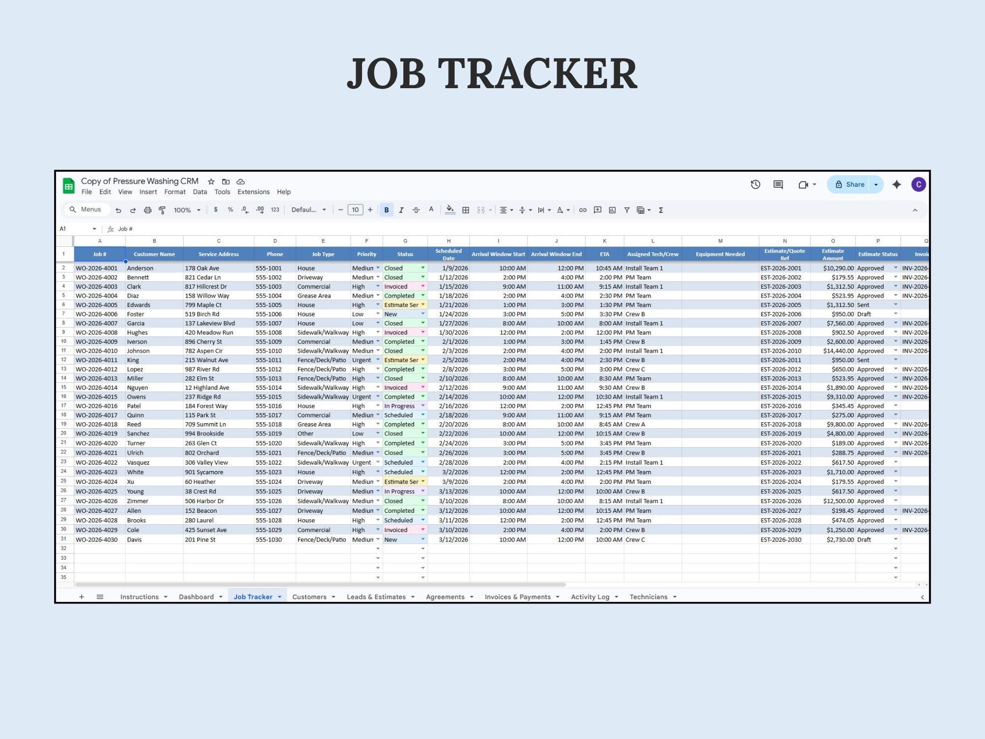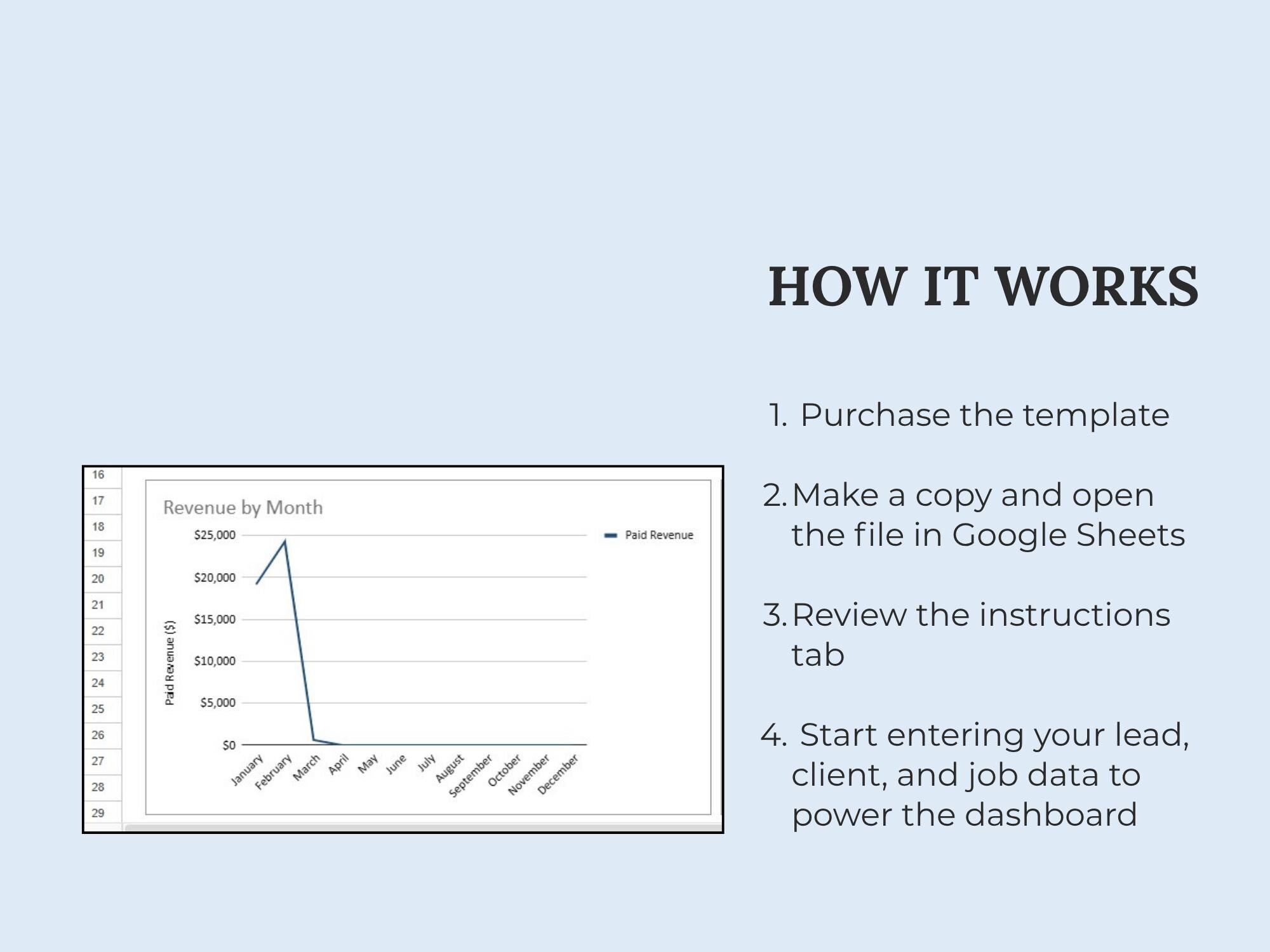 A lightweight CRM dashboard to track leads → quotes → scheduled jobs → paid invoices. Built in Google Sheets so you can manage your pipeline without extra software.Format included: Google Sheets