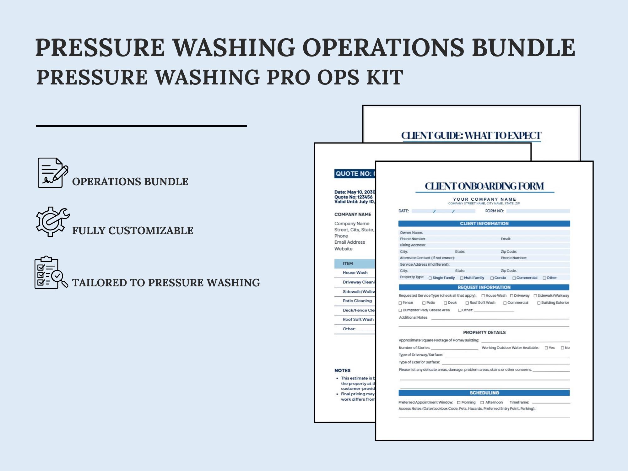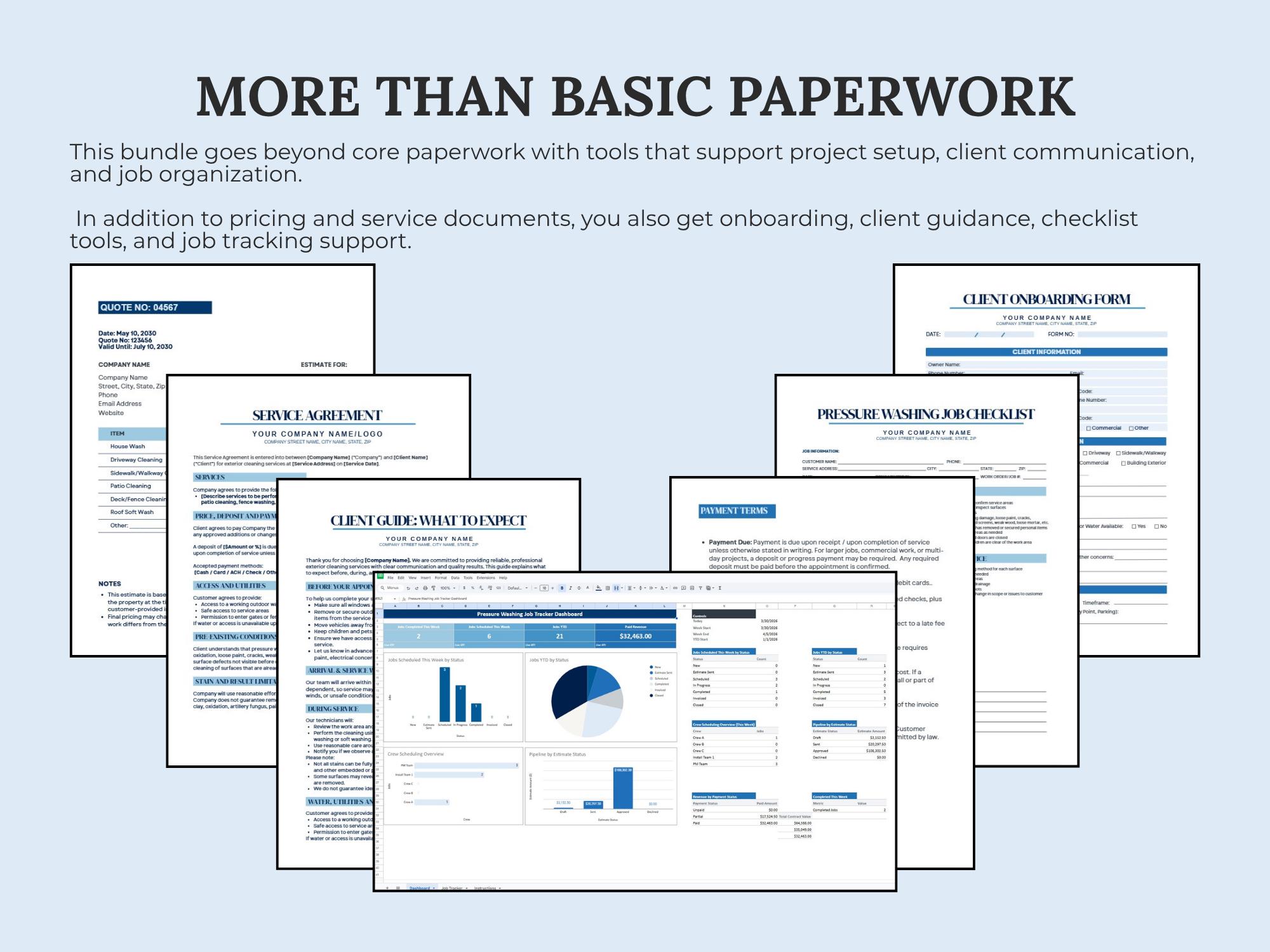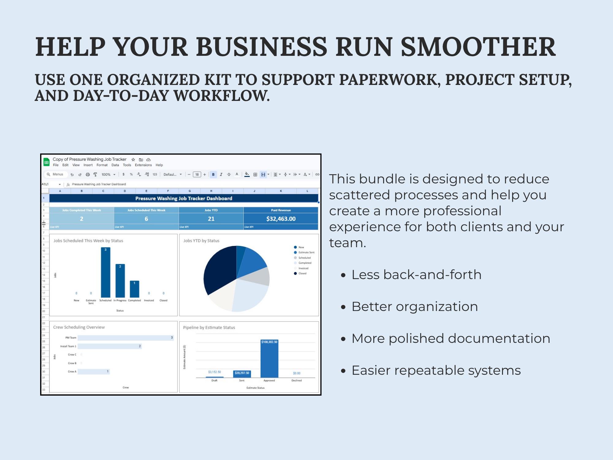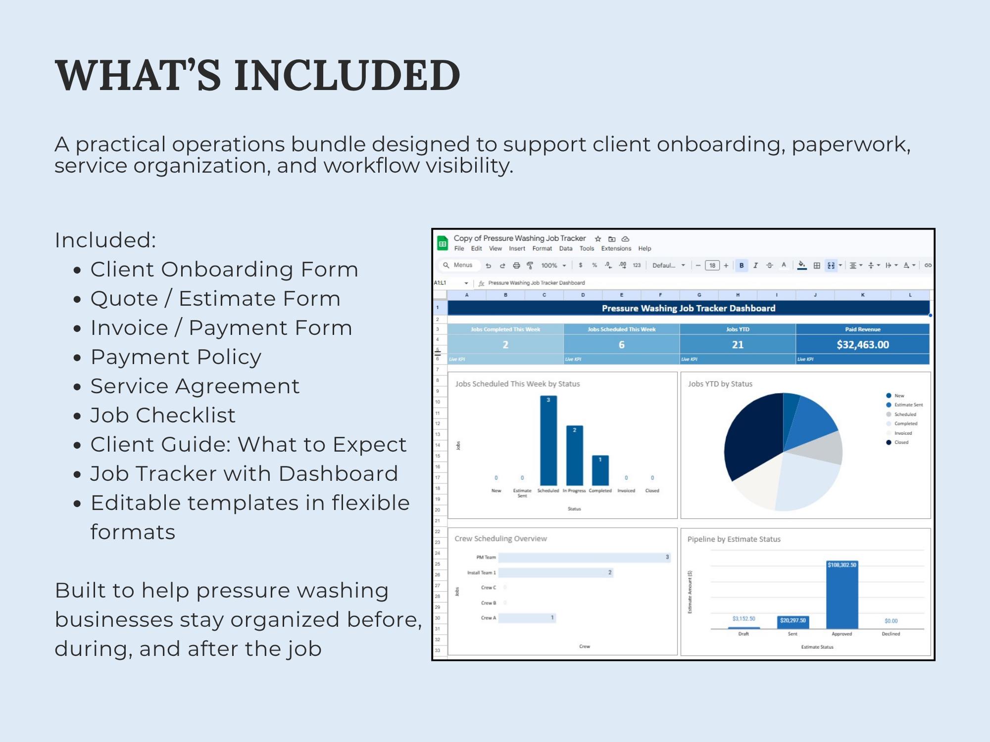 The full operations kit for pressure washing pros—onboarding, quoting, checklists, agreement, client guide, invoicing/payment policy, plus a Google Sheets Job Tracker to run your workflow in one system.