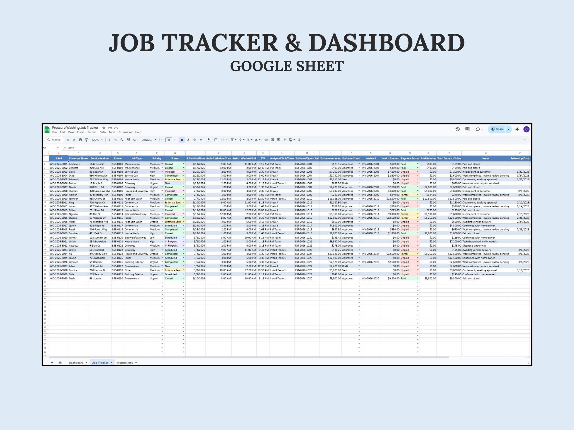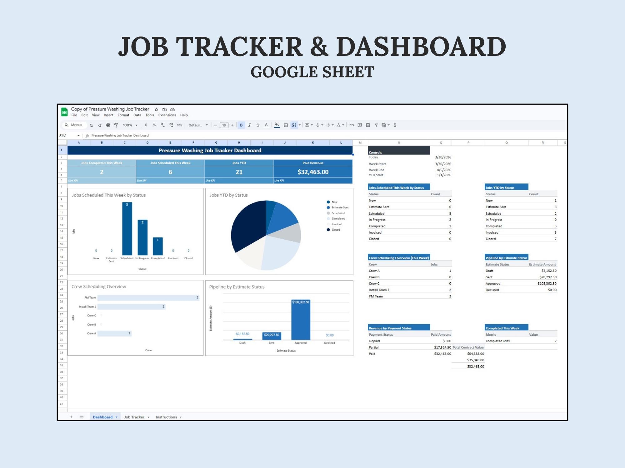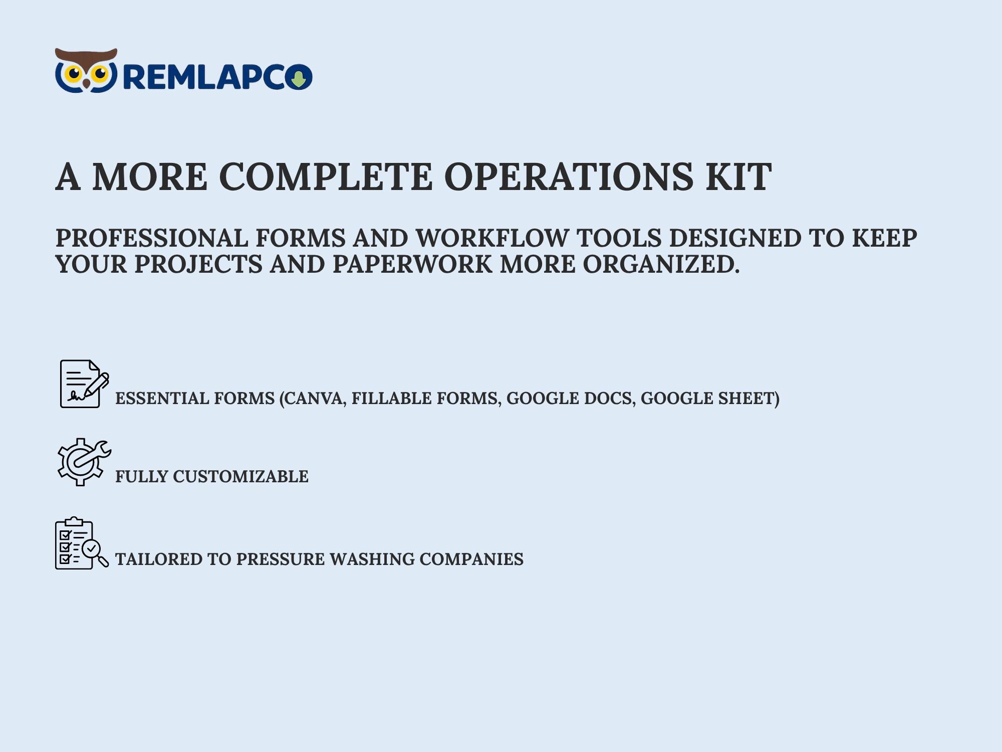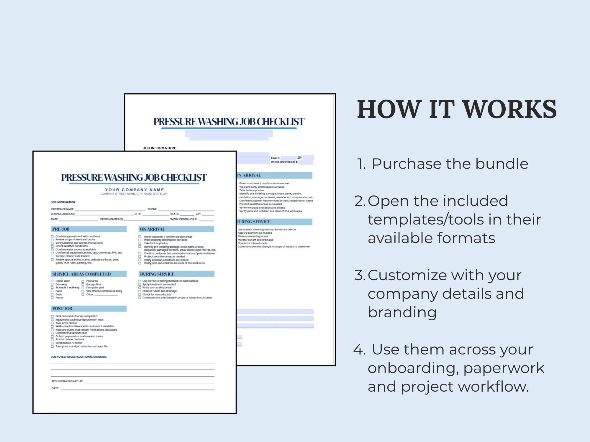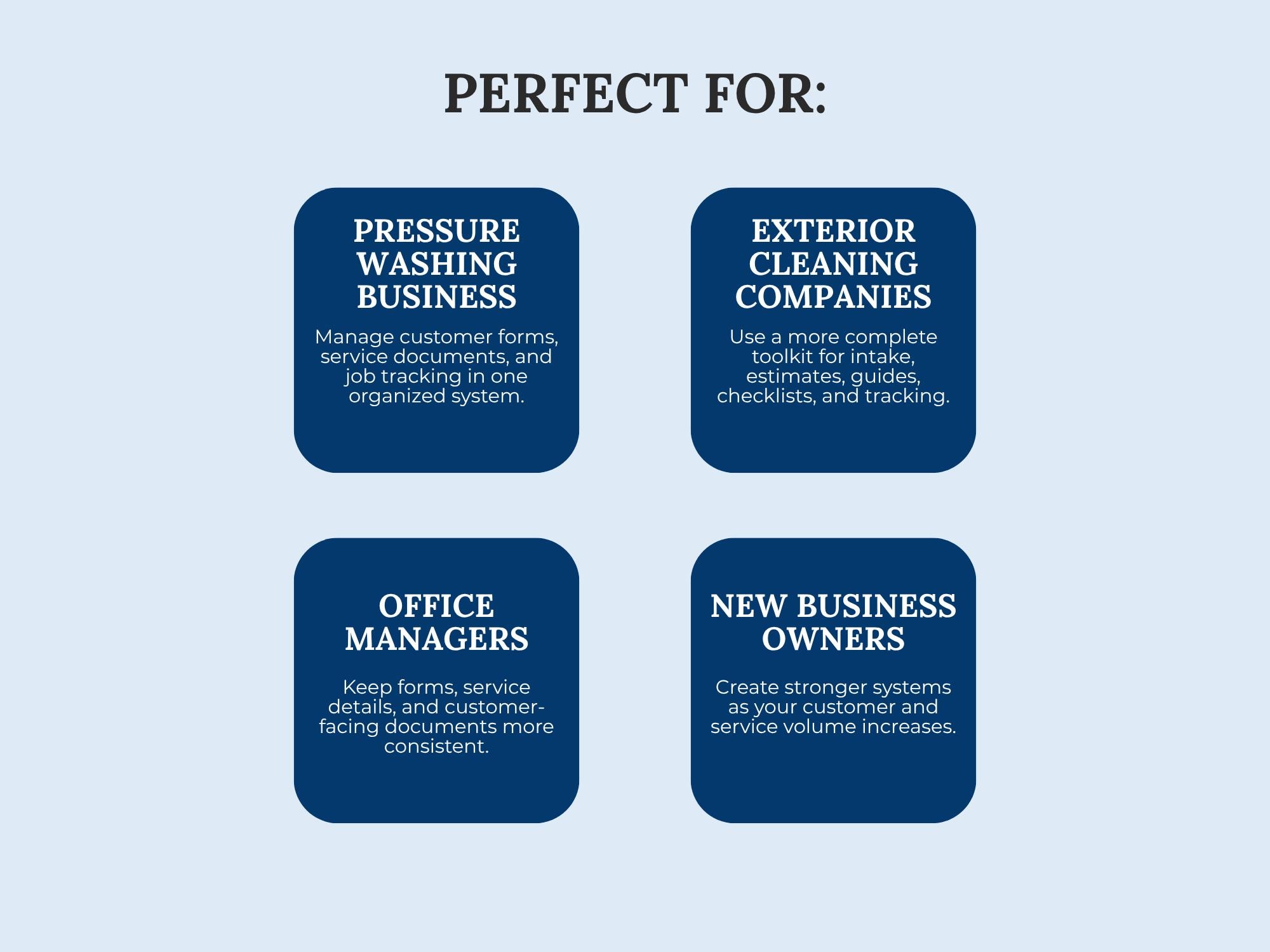 The full operations kit for pressure washing pros—onboarding, quoting, checklists, agreement, client guide, invoicing/payment policy, plus a Google Sheets Job Tracker to run your workflow in one system.