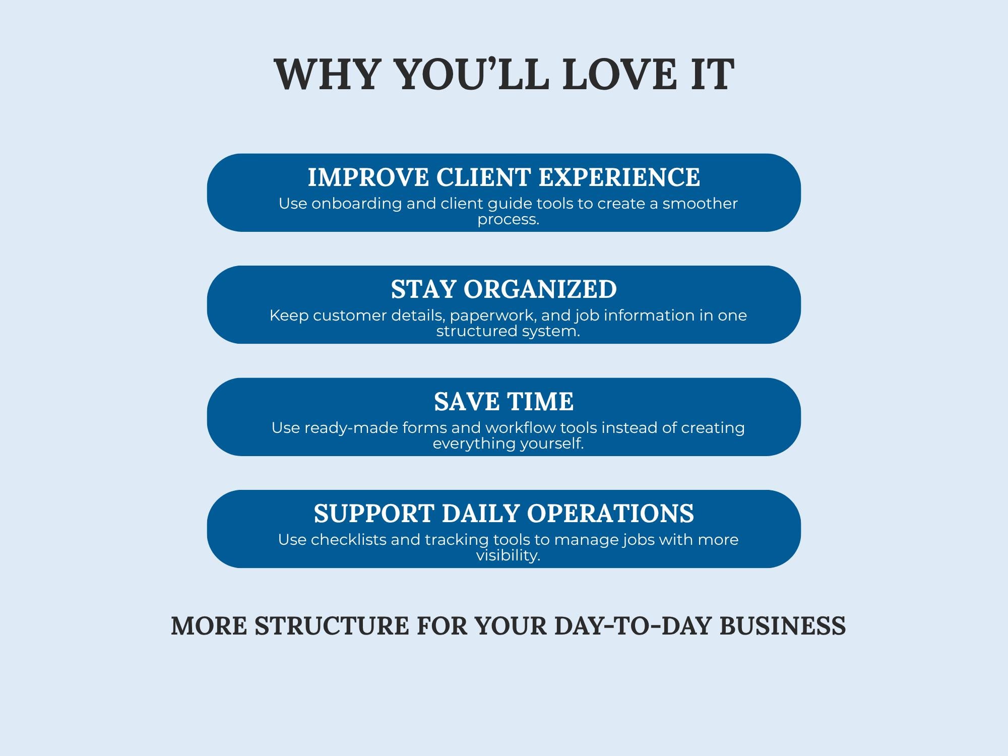 Includes: Onboarding + Estimate + Checklist + Agreement + Client Guide + Invoice/Policy + Job Tracker