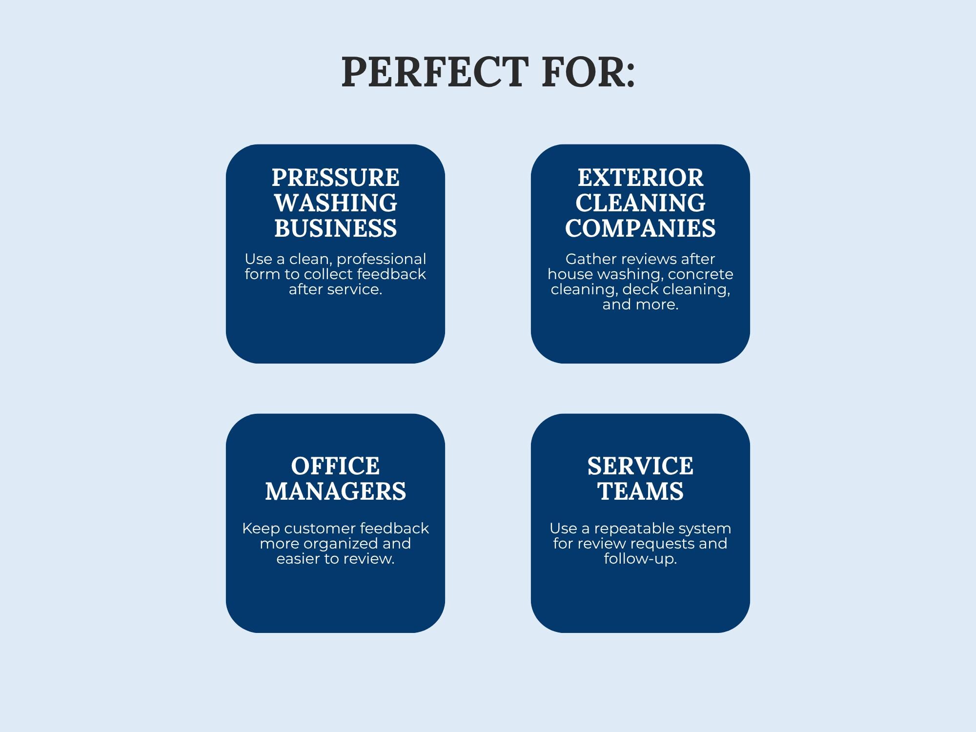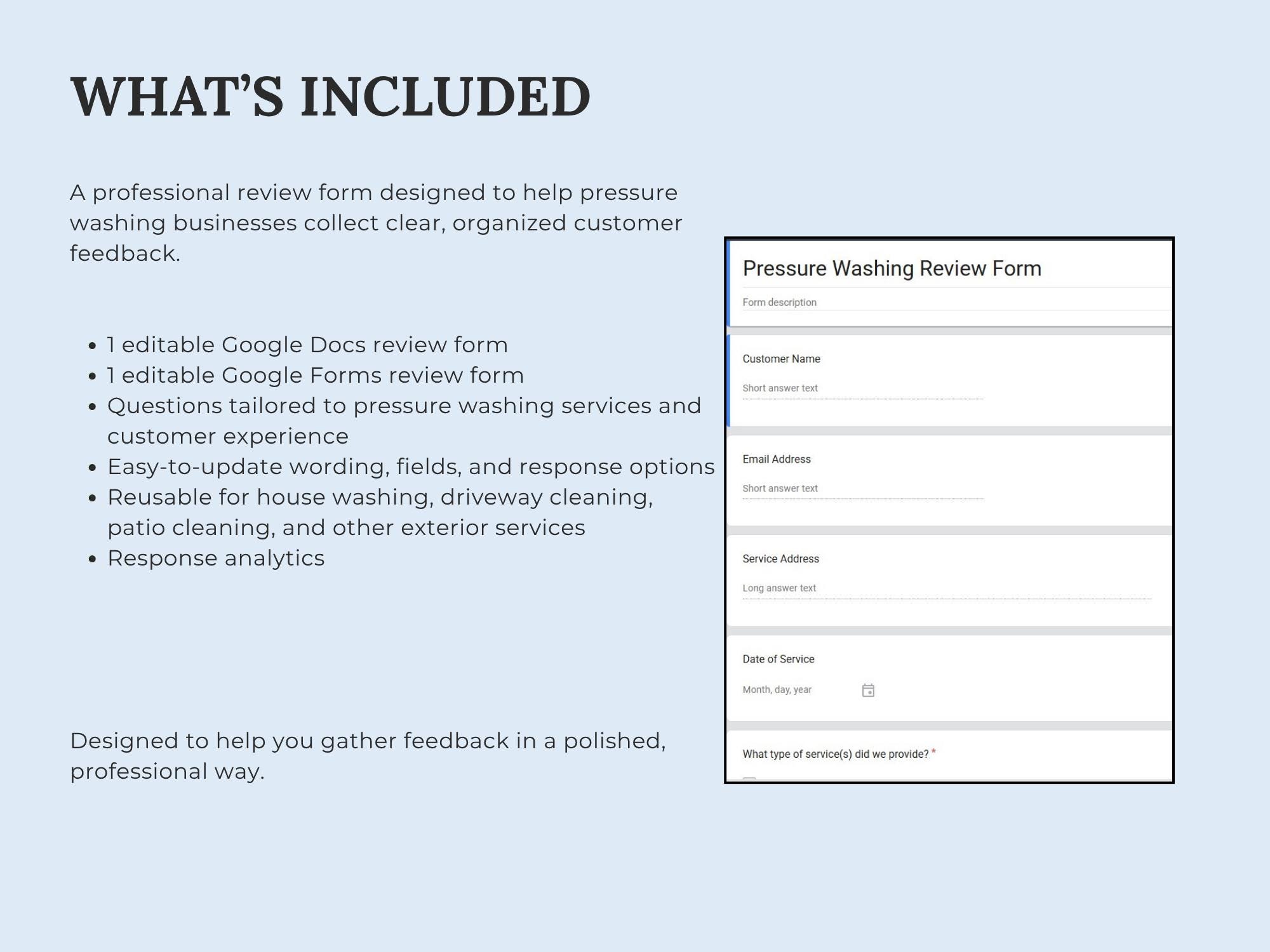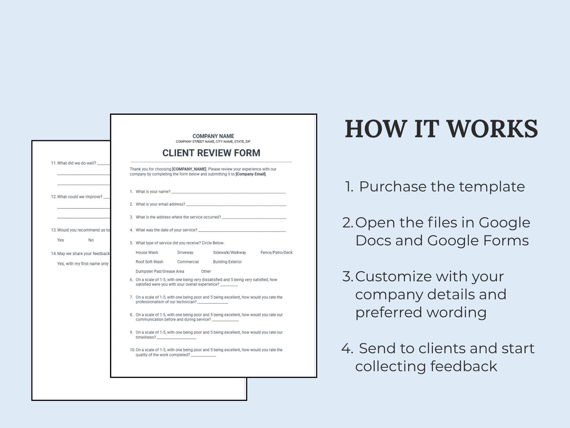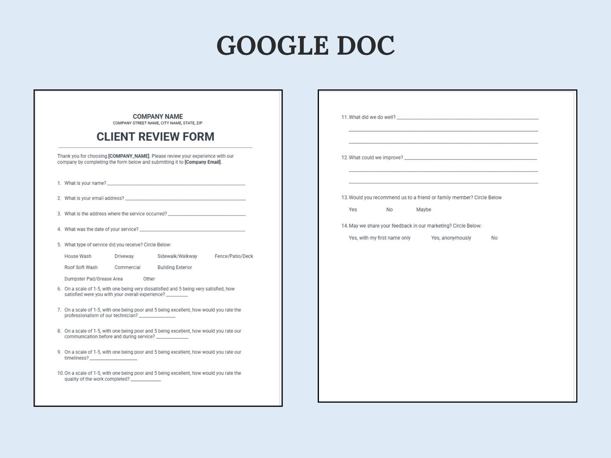 Collect feedback and testimonials with a ready-to-copy Google Form plus a Google Doc review form option for email/print. Great for gathering public reviews, permission to share, and service notes.